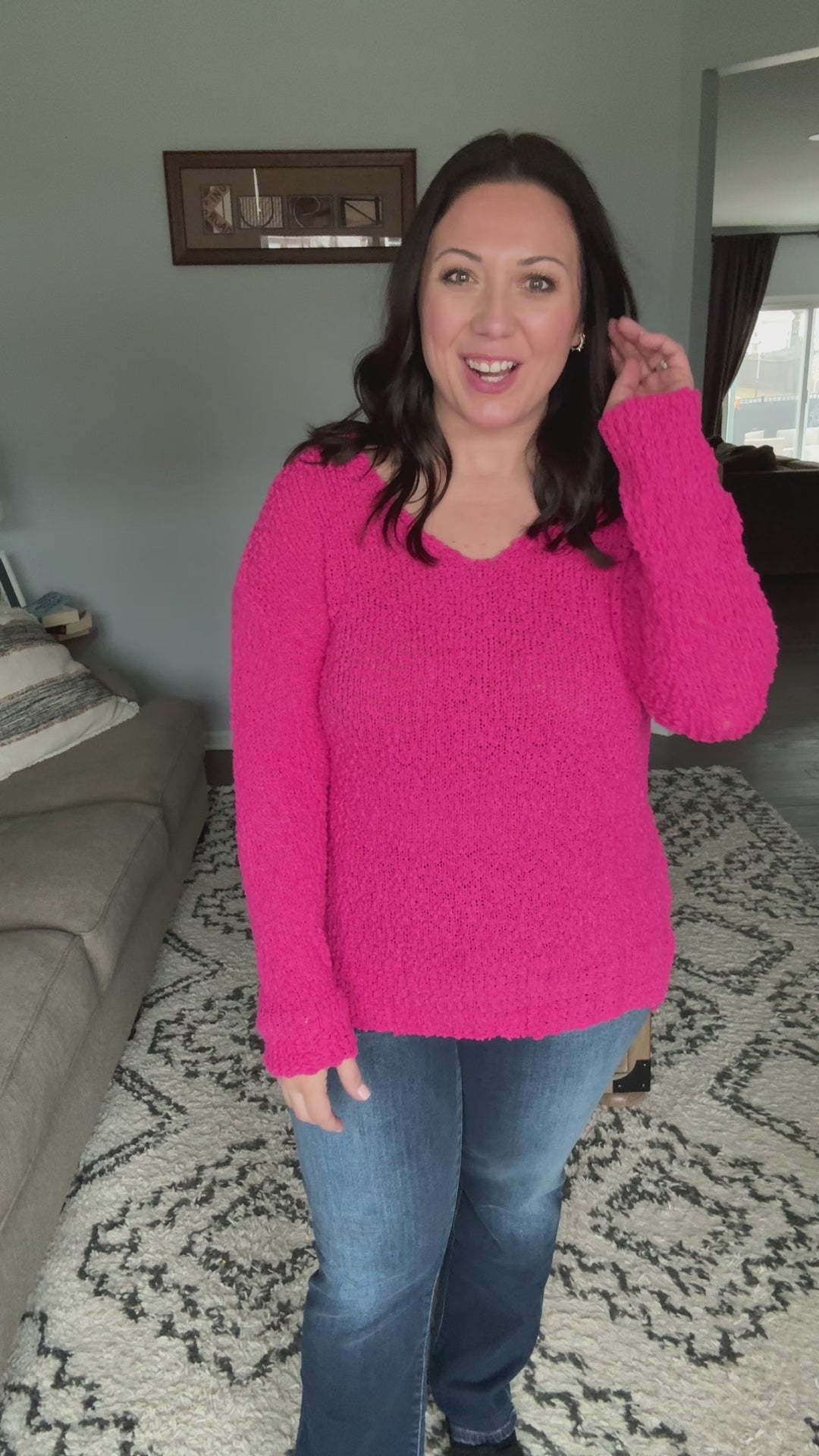 The High-Low Side Slit V-Neck Sweater is versatile piece for your wardrobe. With its high-low hem and side slits, this sweater offers a modern and chic look. The V-neck adds a flattering touch to the neckline, making it a great option for layering over camisoles or wearing on its own. This sweater can be dressed up or down, making it a versatile choice for various occasions. It is a lighterweight popcorn sweater material with a loose knit.
