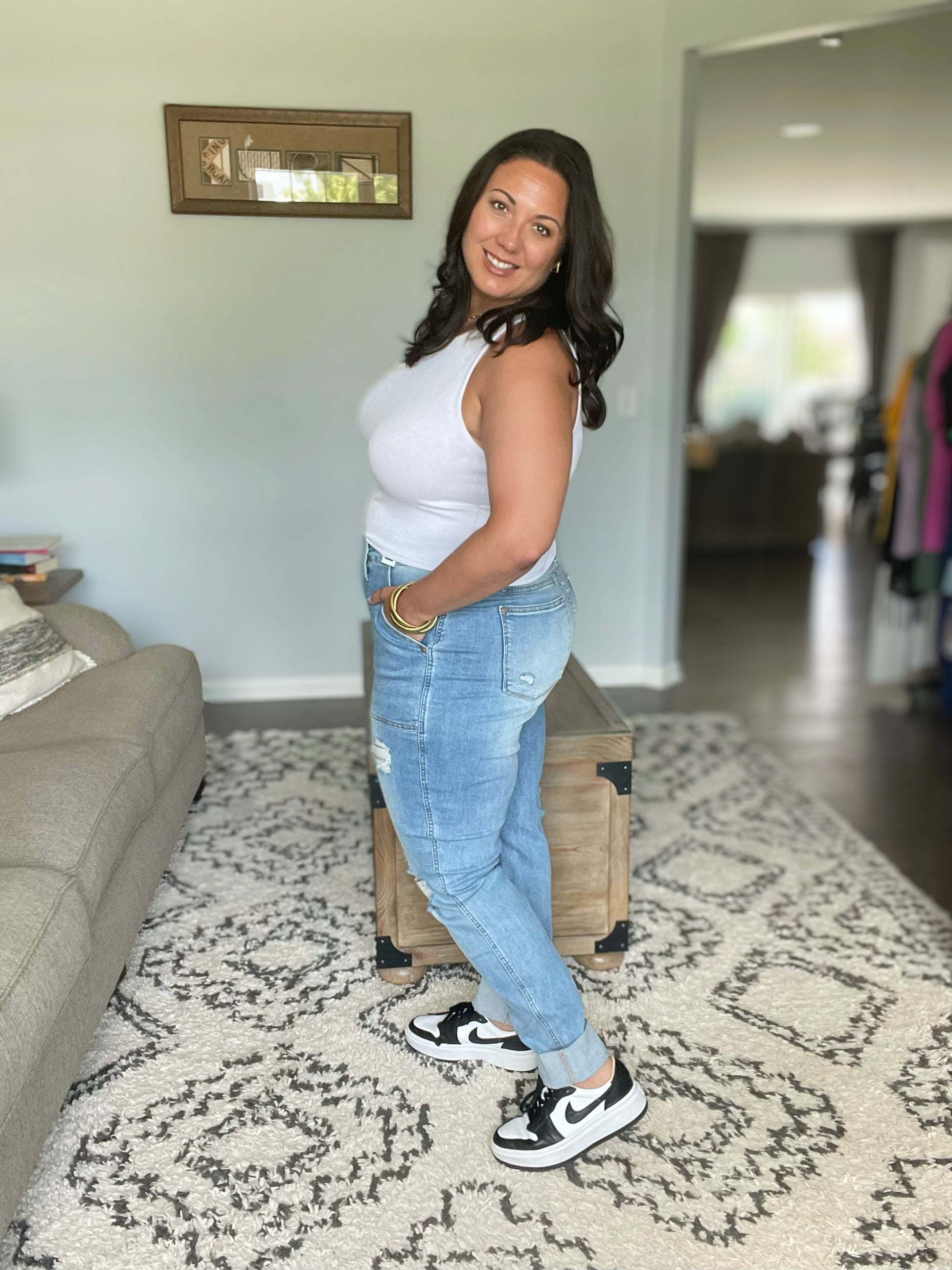 Up your denim game with our Aiden High Rise Patch Pocket Distressed Boyfriend Jeans from Judy Blue! Featuring a unique hybrid design that combines the comfort of joggers with the style of boyfriend jeans. The light wash and distressed details add a trendy touch, while the 4-way stretch ensures a perfect fit. Add an optional cuffed hem for a touch of personality. Experience the best of both worlds with these jeans.