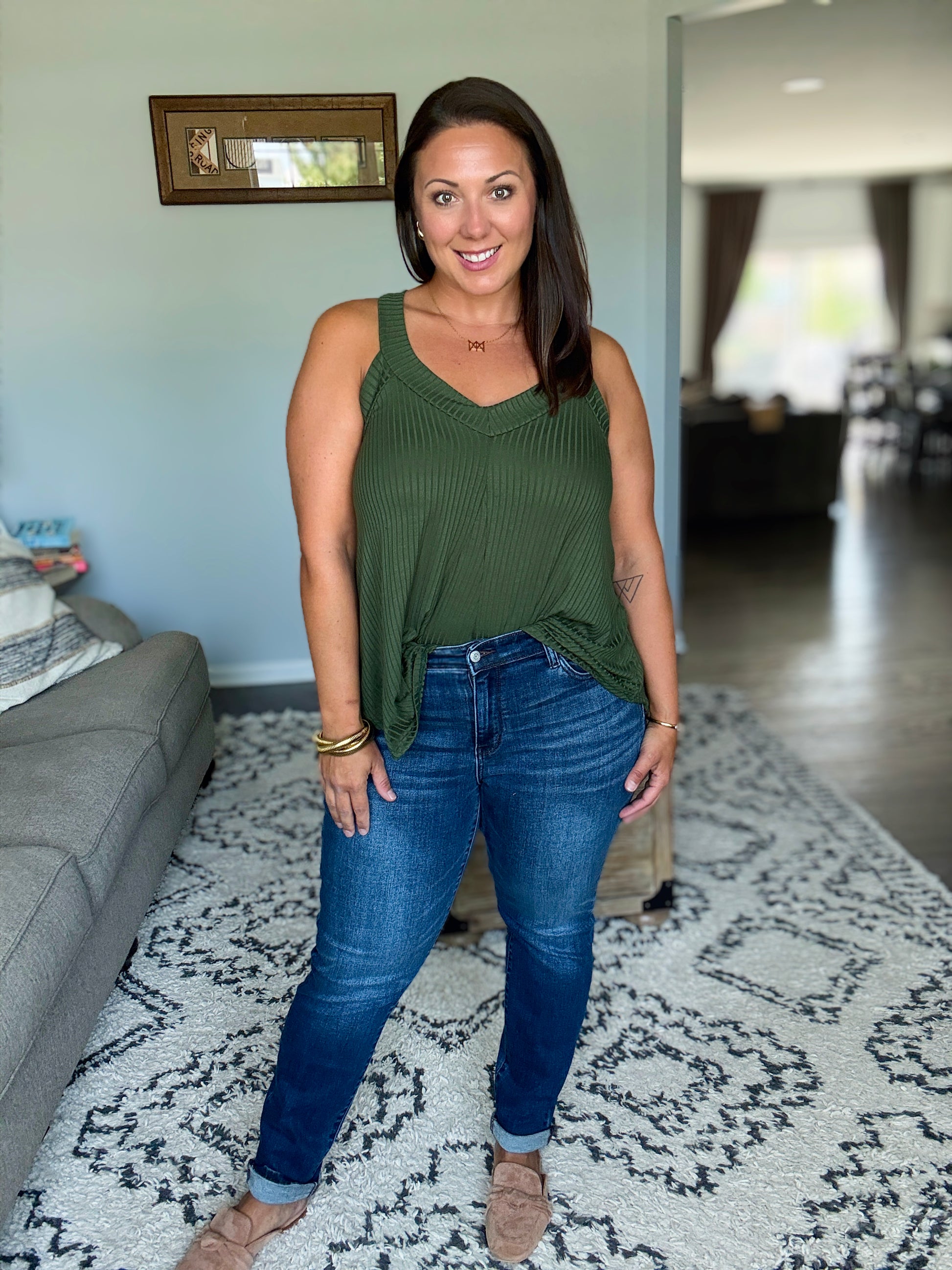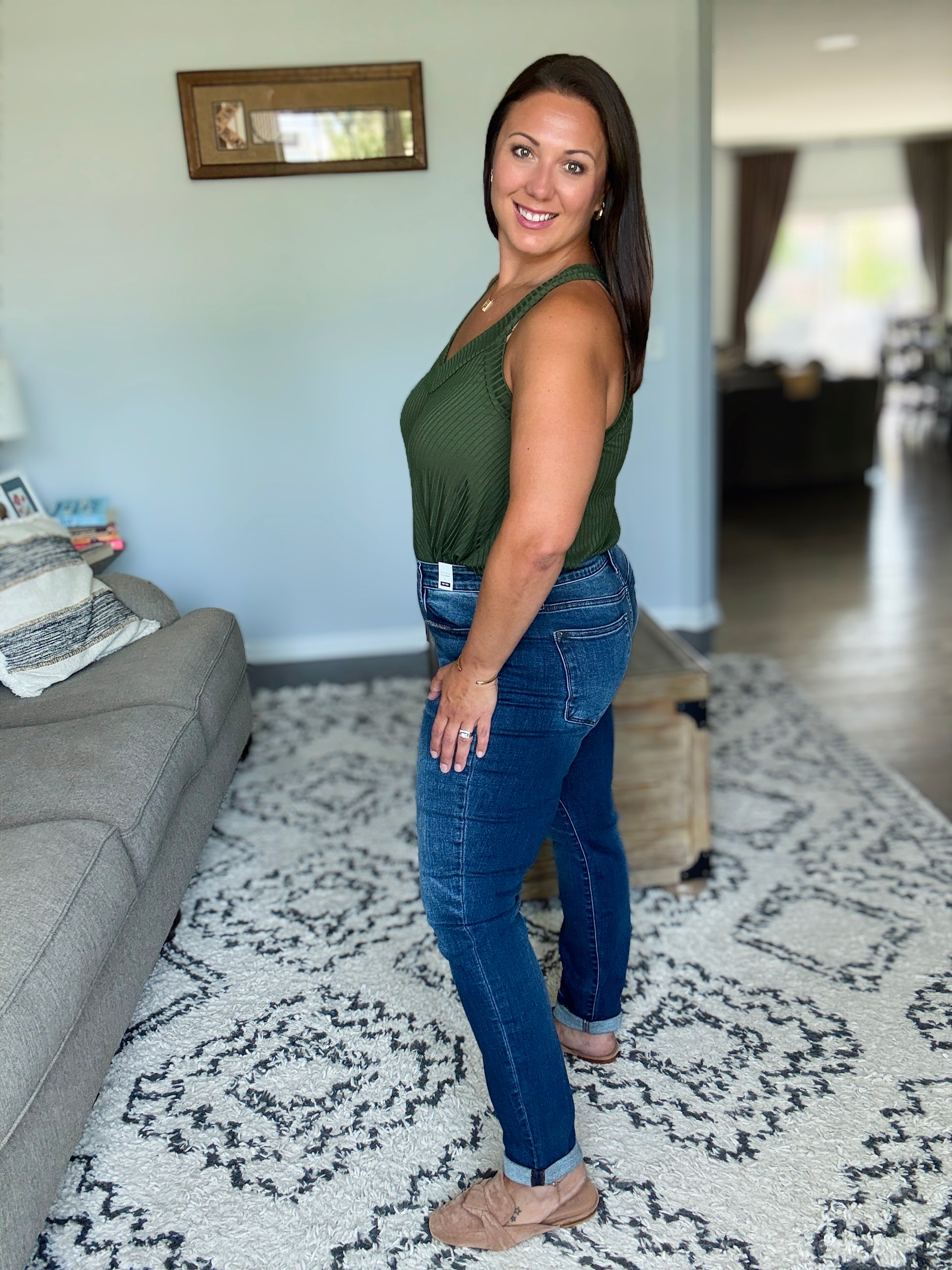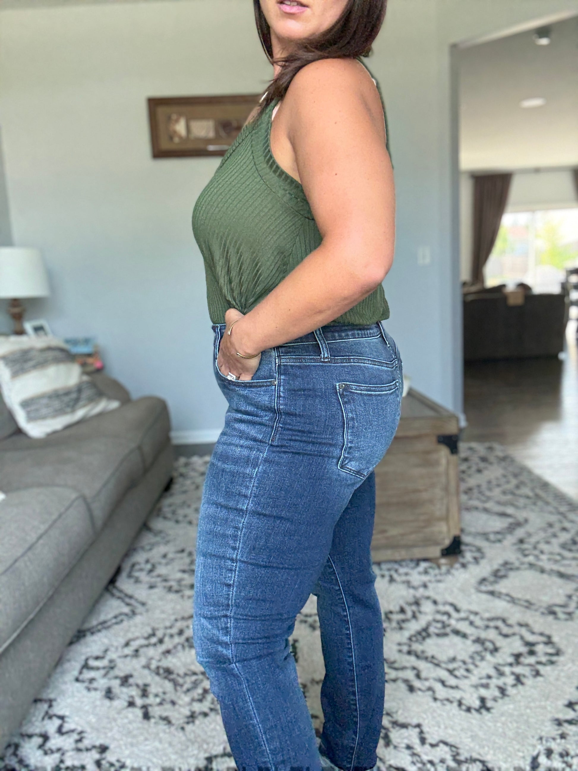 The Amber Cuffed Slim Fit Dark Wash Jeans from Judy Blue are just what you need for this upcoming season. What's not to love about a stretchy dark wash denim, slim fit, mid-rise and cuffed hem? These ultra flattering jeans are just what your closet is missing!
