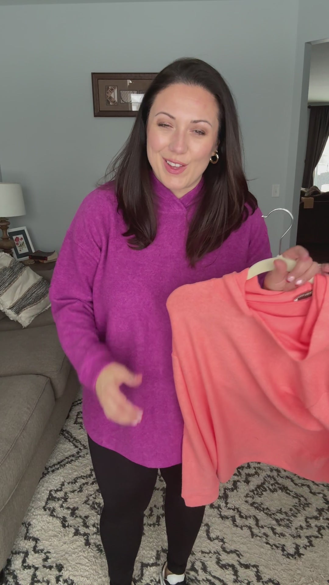 Amanda is wearing a 1XL/2XL in light plum and L/XL in coral