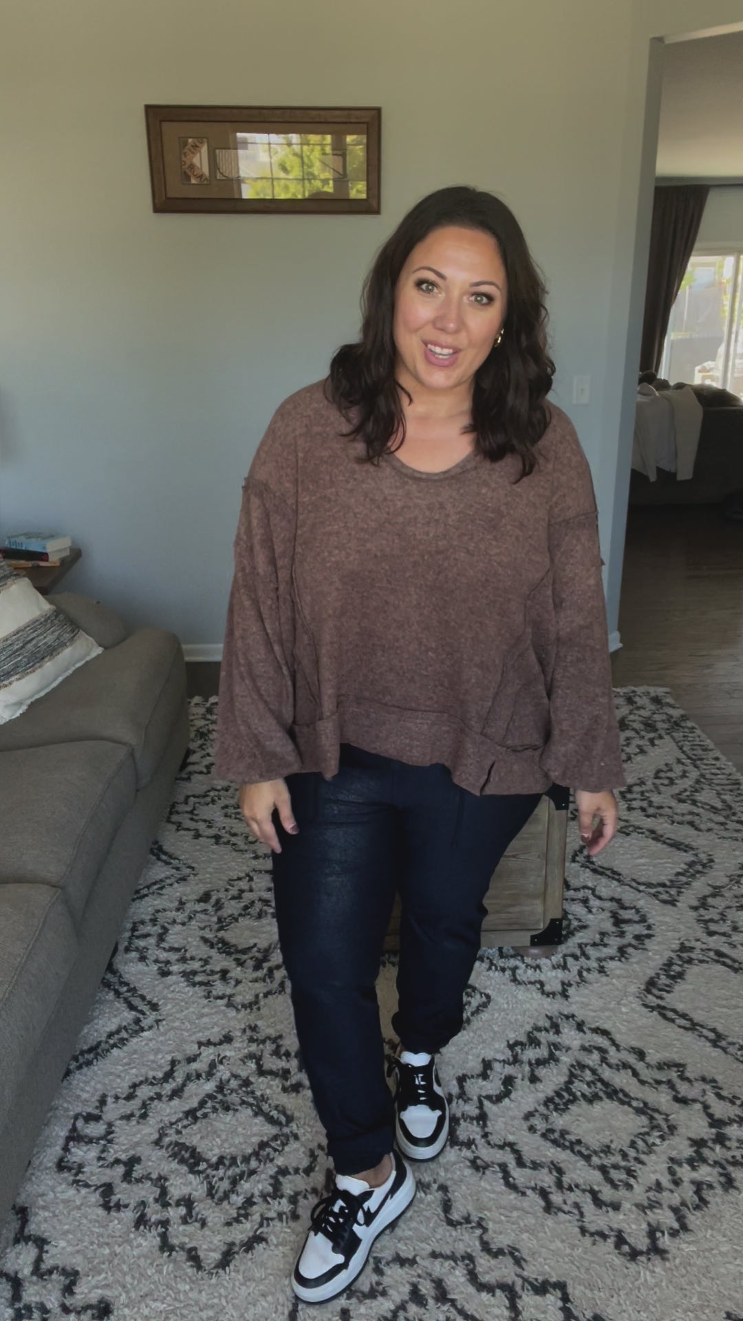 Video with black and red checkered pullover Amanda is wearing Large. Amanda is wearing a 2XL for more room in thighs in the wine tank and green tank. (old photo) Wearing 1X paired with the brown hoodie. The 2X are from 2 years ago and no longer fit.
