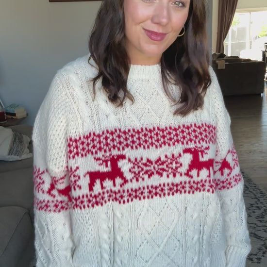 BiBi Christmas Theme Fair Isle Cable Knit Sweater in Ivory/Red