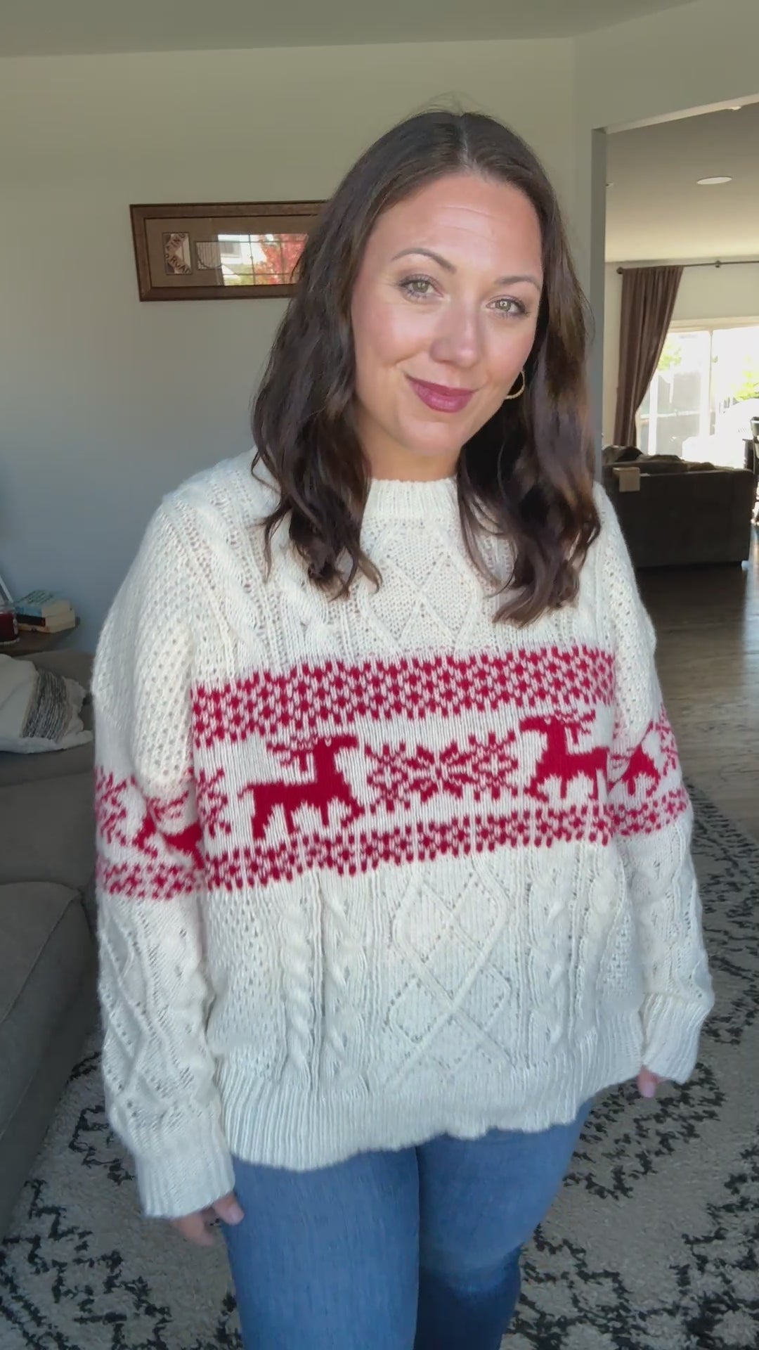 Celebrate the holiday season in style with this adorable Christmas themed Cable Knit Sweater. The festive Christmas-themed pattern adds a nostalgic and whimsical touch to this cozy holiday sweater. Made from cable knit fabric, it offers warmth and texture for a classic winter look. It has a soft feel -no itch! Perfect for holiday gatherings or festive occasions, this sweater will keep you comfortable and cheerful. Pair it with jeans or leggings for a festive and cozy outfit that captures the spirit of the season.
