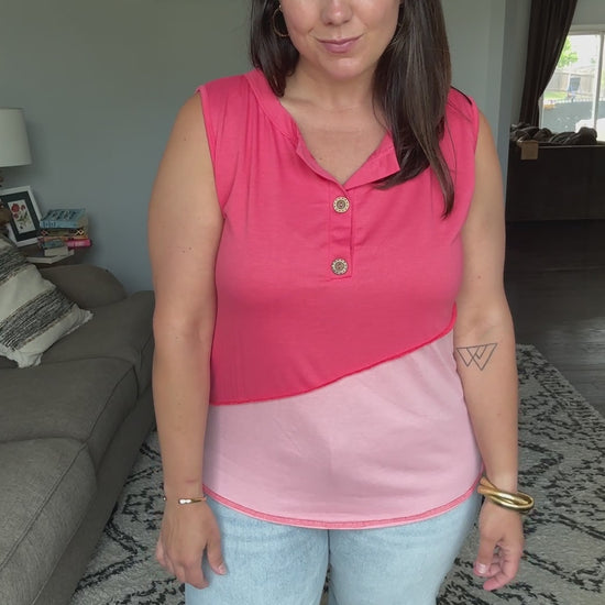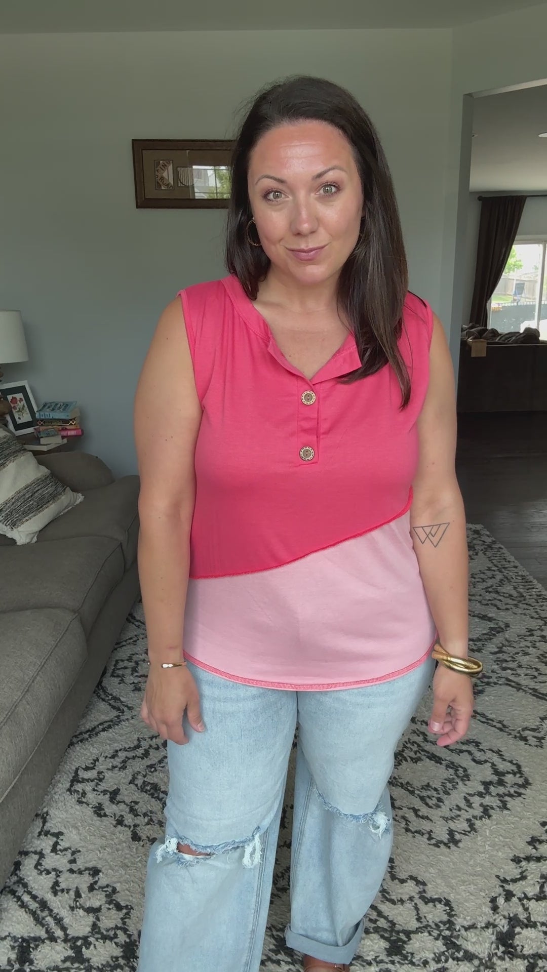 This sleeveless henley top features a stylish color block design with contrast reverse stitching details that add a modern and trendy touch. The buttoned Henley neckline offers a classic and versatile look. Perfect for adding a pop of color and visual interest to your outfit, this top can be paired with jeans or leggings for a casual yet chic ensemble.