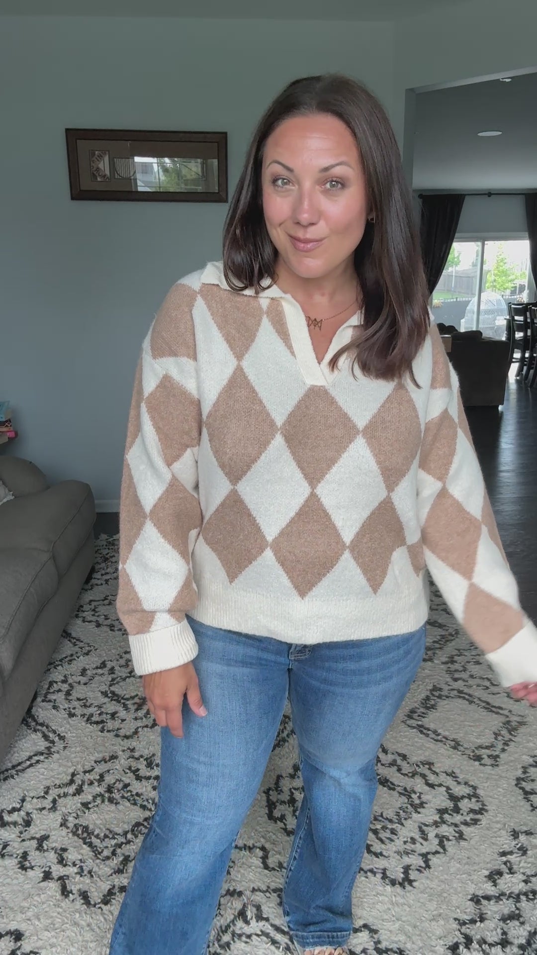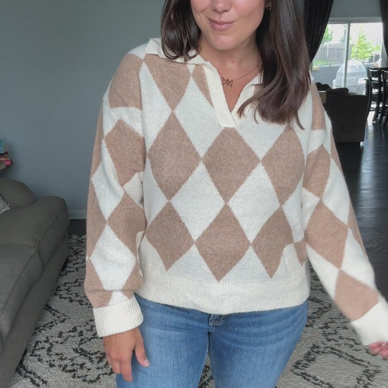 This stylish diamond pattern pullover features a sophisticated argyle design in warm neutral tones of beige and cream. Crafted from a super soft knit material with a classic polo collar, this versatile sweater offers both comfort and style. The geometric diamond motifs create visual interest while maintaining elegance. Perfect for casual or semi-formal occasions, this pullover pairs beautifully with jeans, shorts, or skirts. The relaxed fit ensures comfortable movement while the ribbed details at cuffs and hem provide structure. Made from quality knit fabric that's easy to care for and maintain its shape after washing.