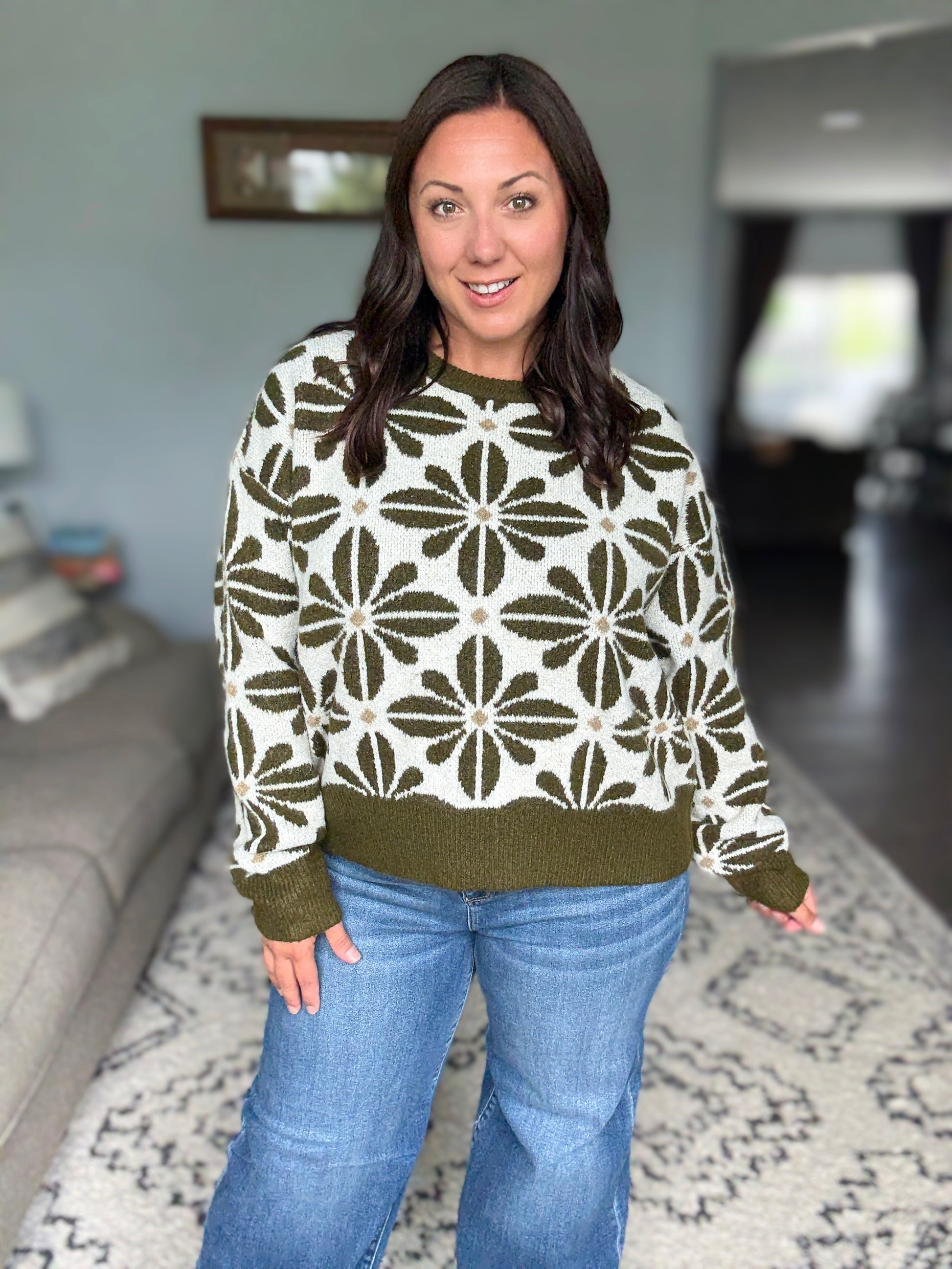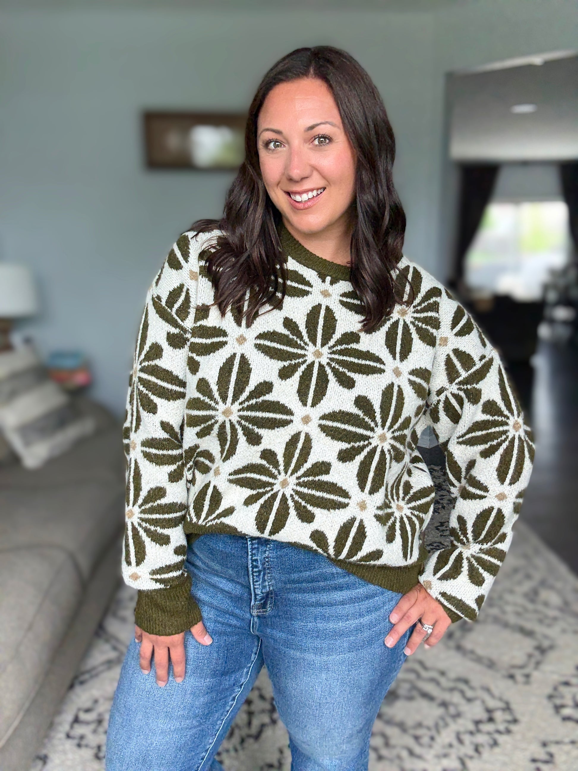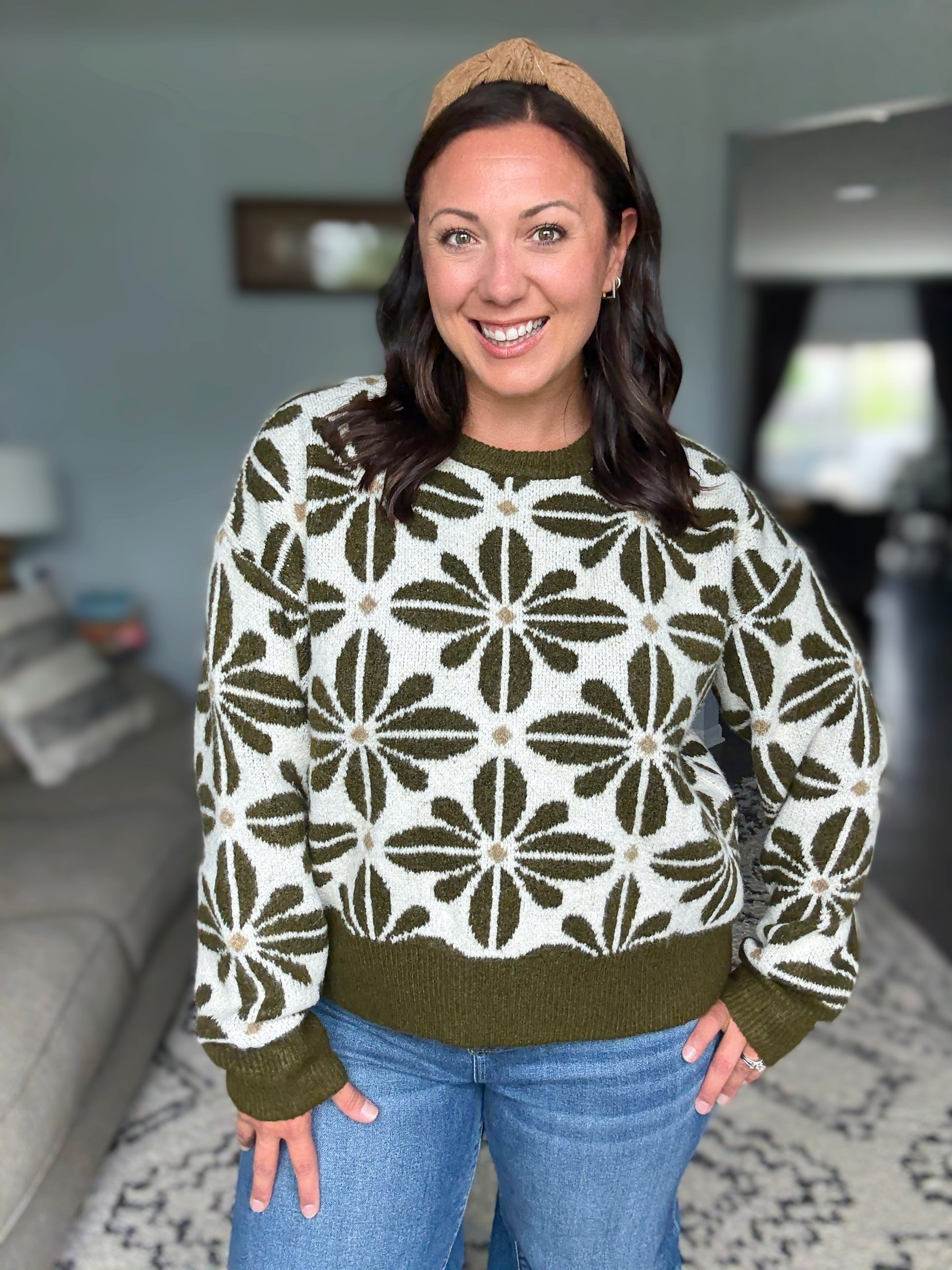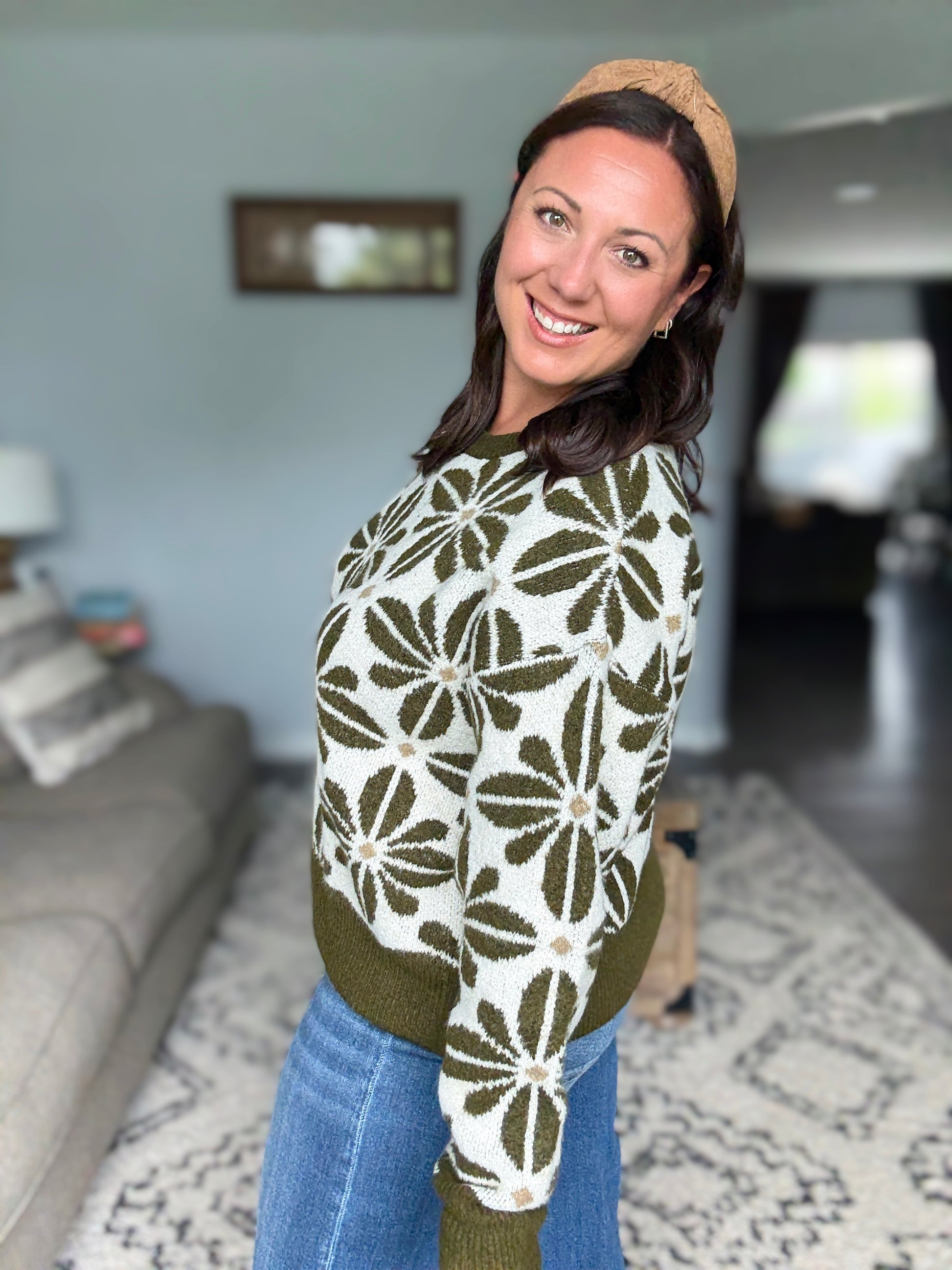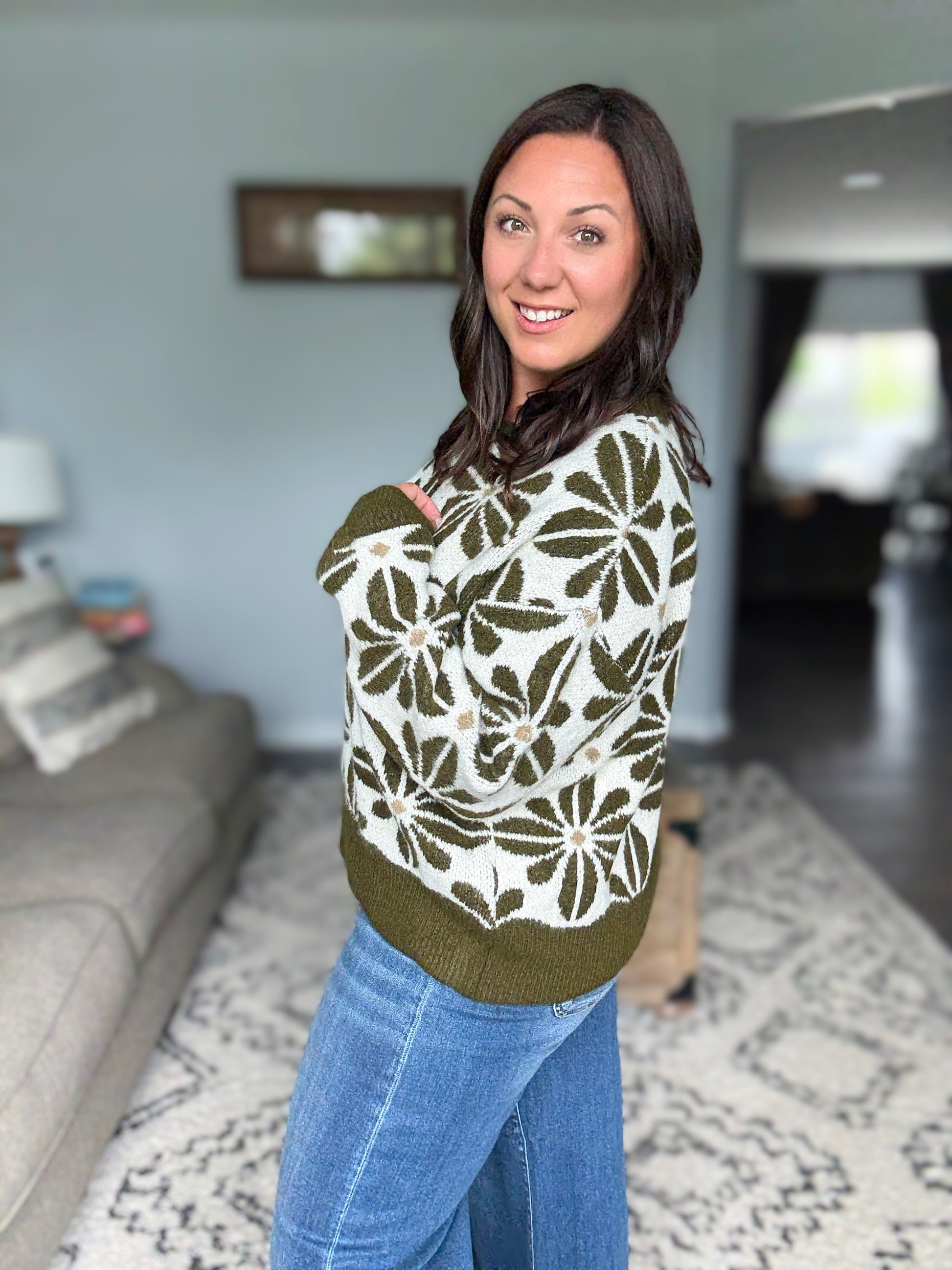 BiBi Flower Pattern Long Sleeve Sweater in Olive