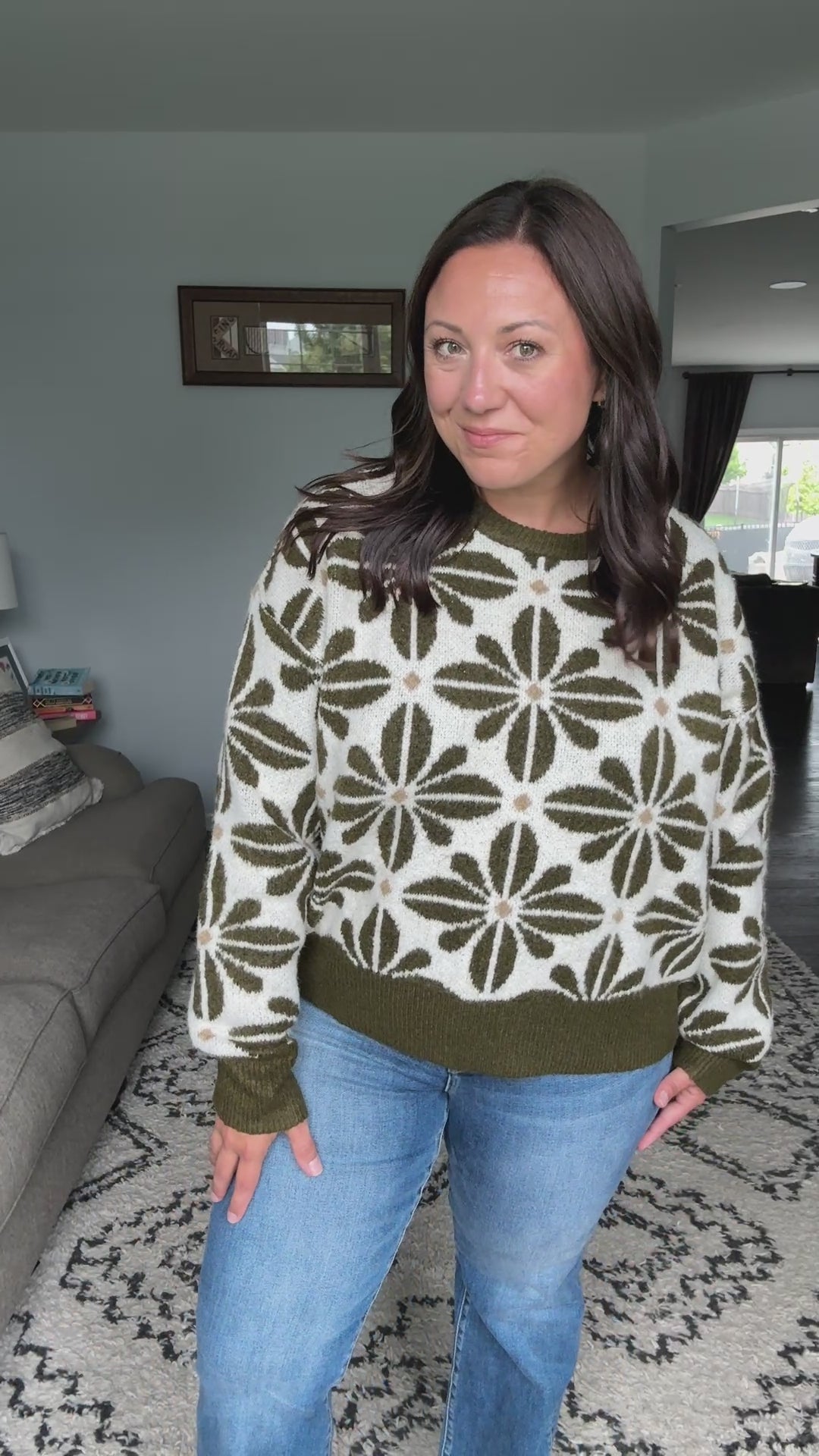 This trendy sweater features an eye-catching vintage-inspired floral jacquard pattern in olive green and cream tones. Crafted from soft knit fabric with excellent stretch and comfort, it offers a relaxed boxy fit perfect for casual everyday wear. The classic crew neckline and ribbed cuffs provide a polished finish, while the statement floral motif adds visual interest and boho charm. Ideal for layering or wearing alone.