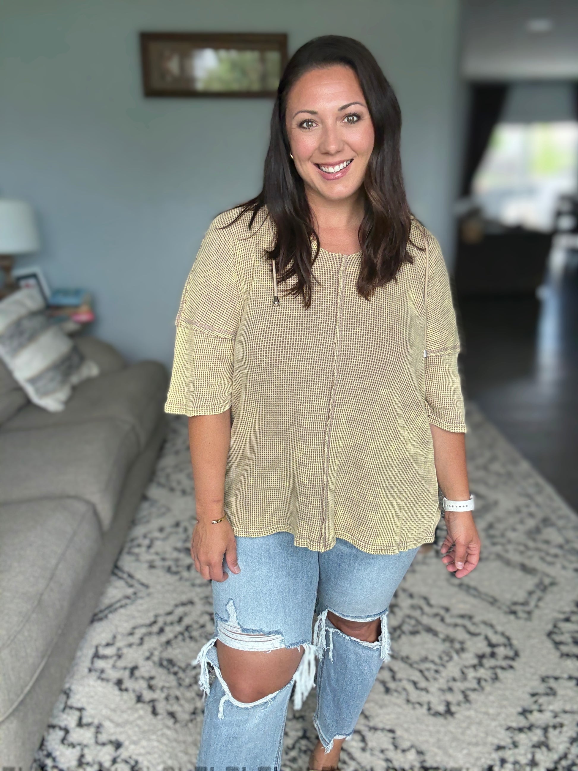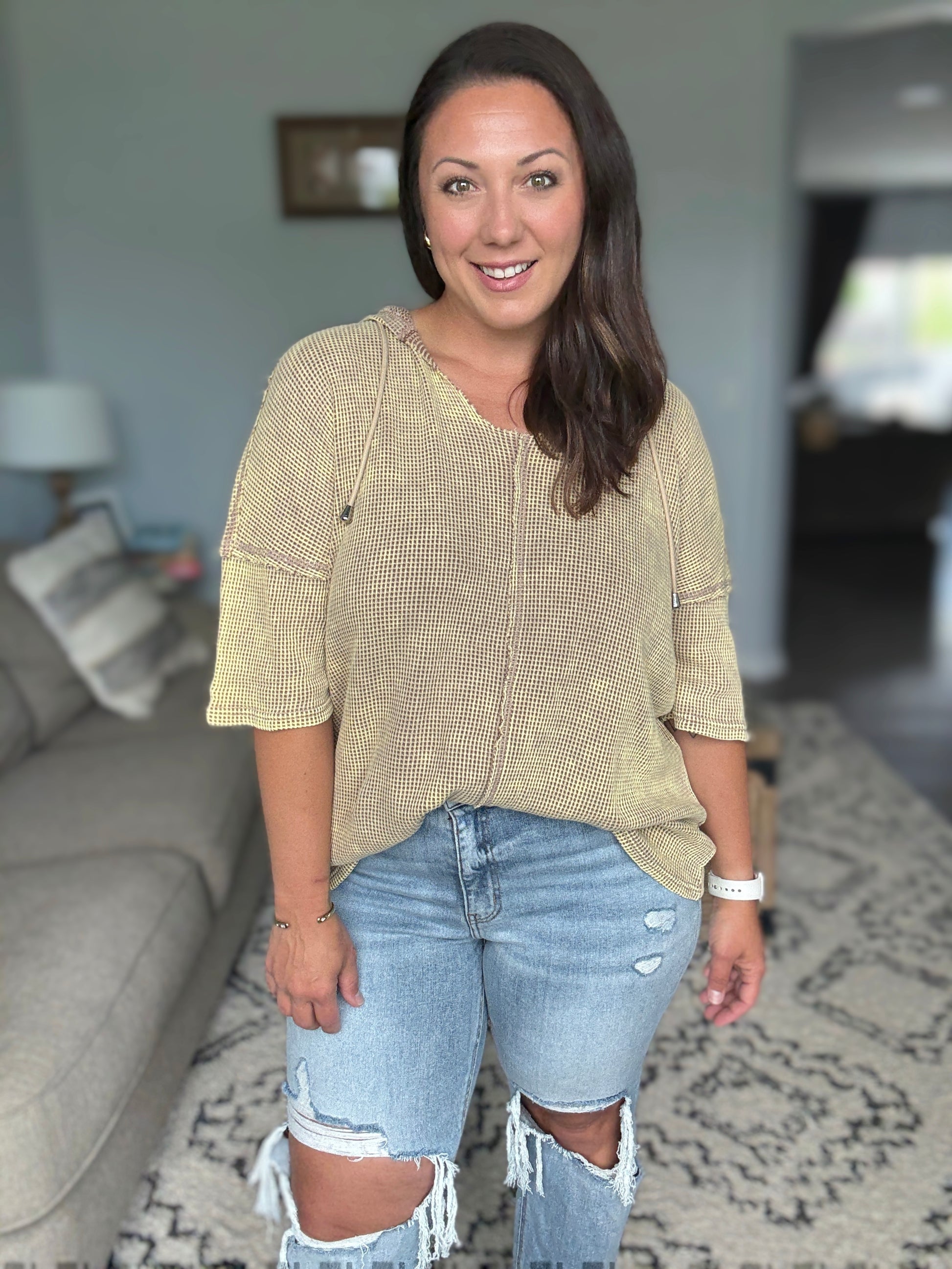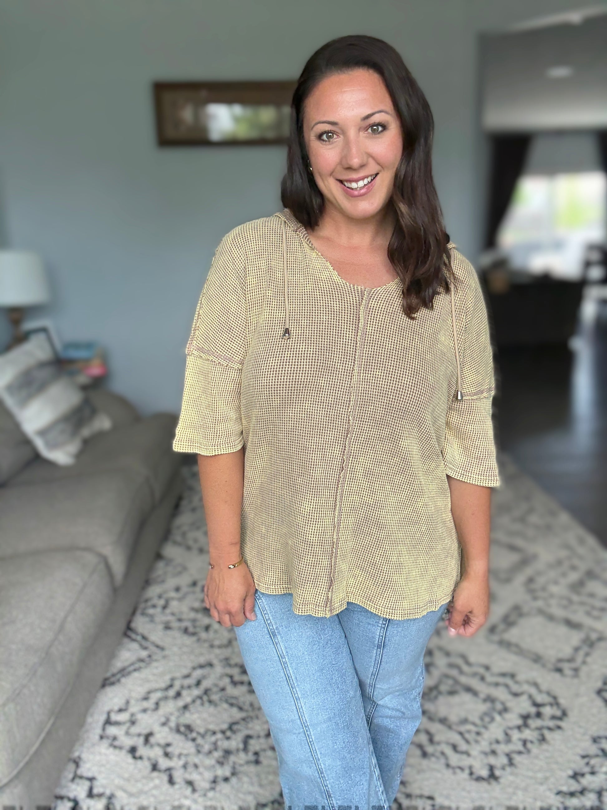 This short sleeve hoodie top is crafted from mineral washed waffle fabric, creating a trendy and lived-in look. Perfect for a casual and relaxed style, the hoodie adds a sporty touch to the design. The mineral wash finish adds a unique texture and depth to the color. It features an open neckline, front center seam and exposed seam details.