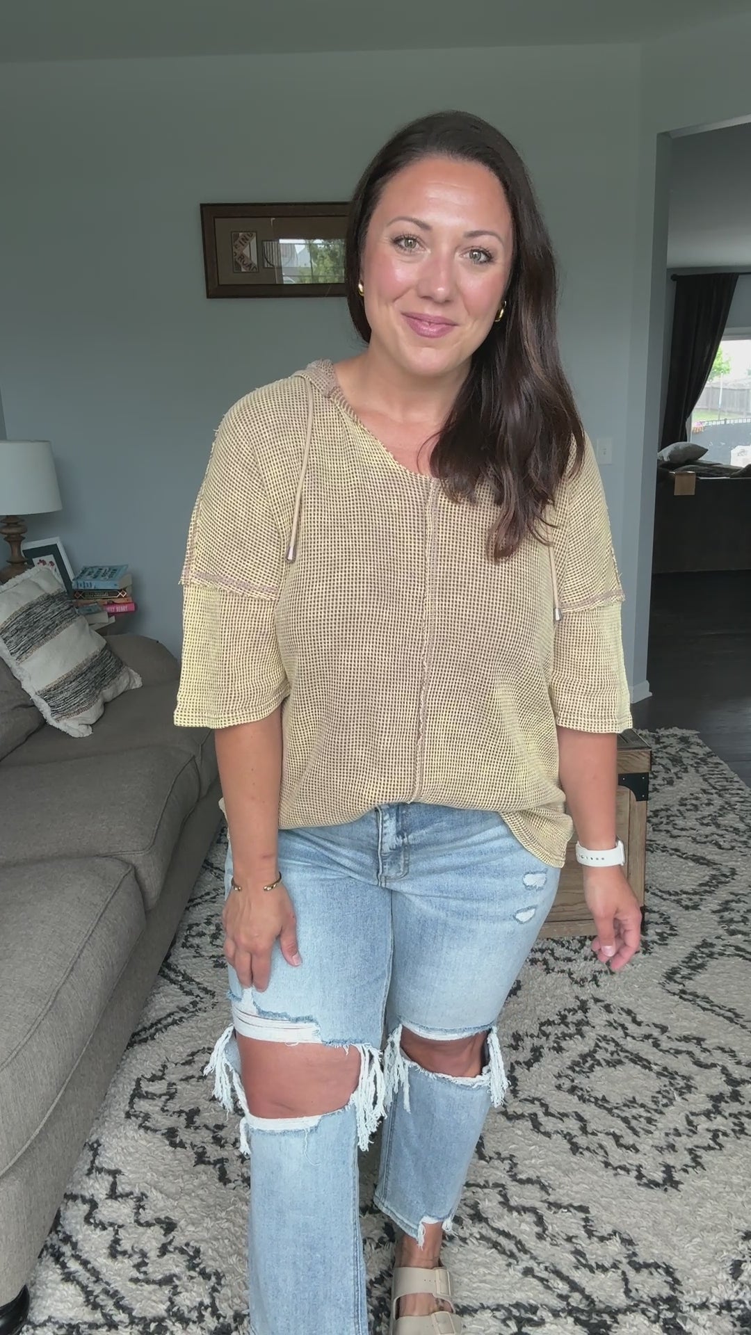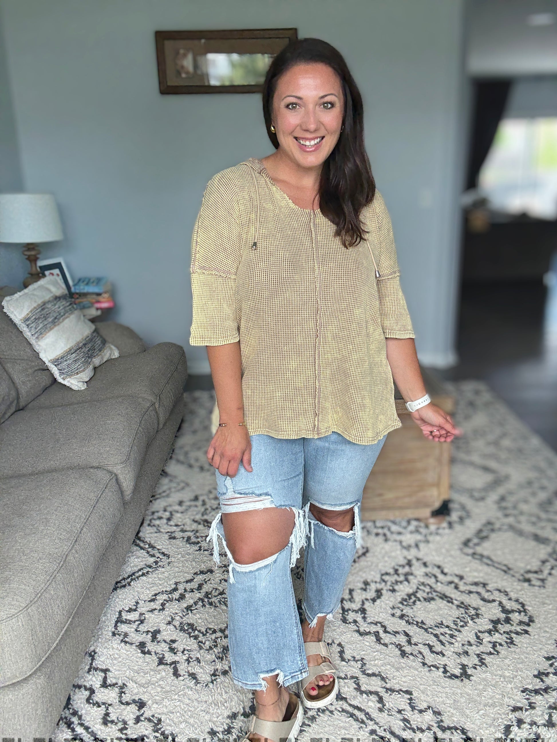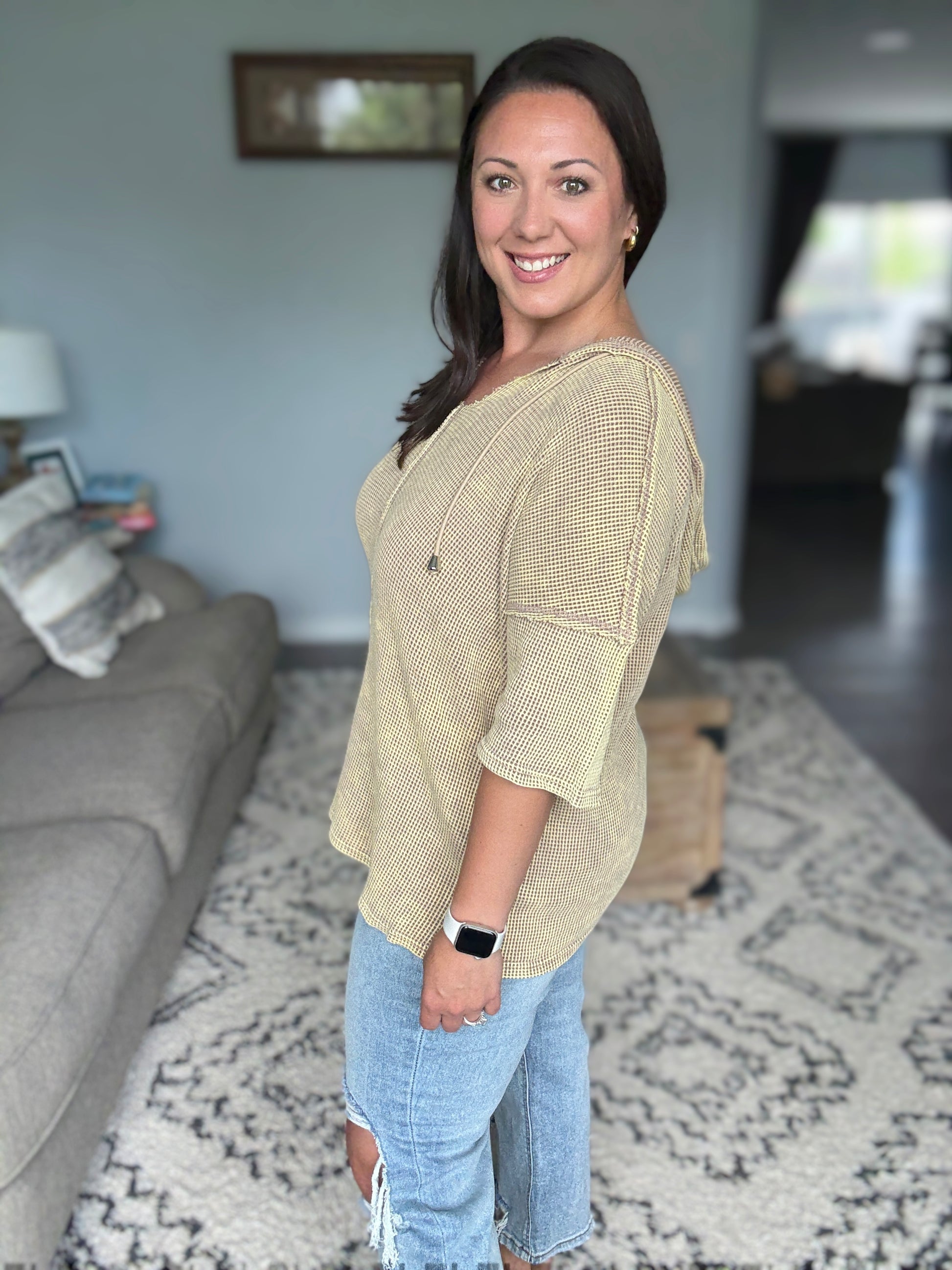 This short sleeve hoodie top is crafted from mineral washed waffle fabric, creating a trendy and lived-in look. Perfect for a casual and relaxed style, the hoodie adds a sporty touch to the design. The mineral wash finish adds a unique texture and depth to the color. It features an open neckline, front center seam and exposed seam details.