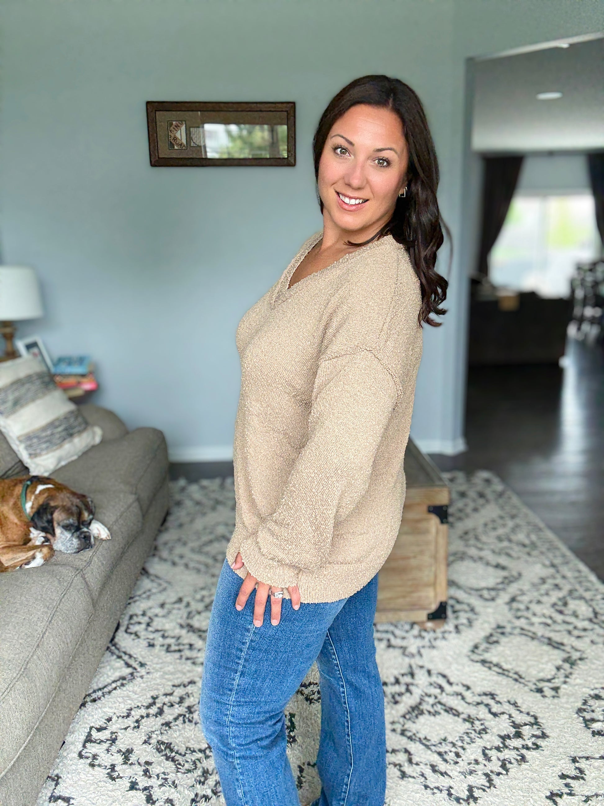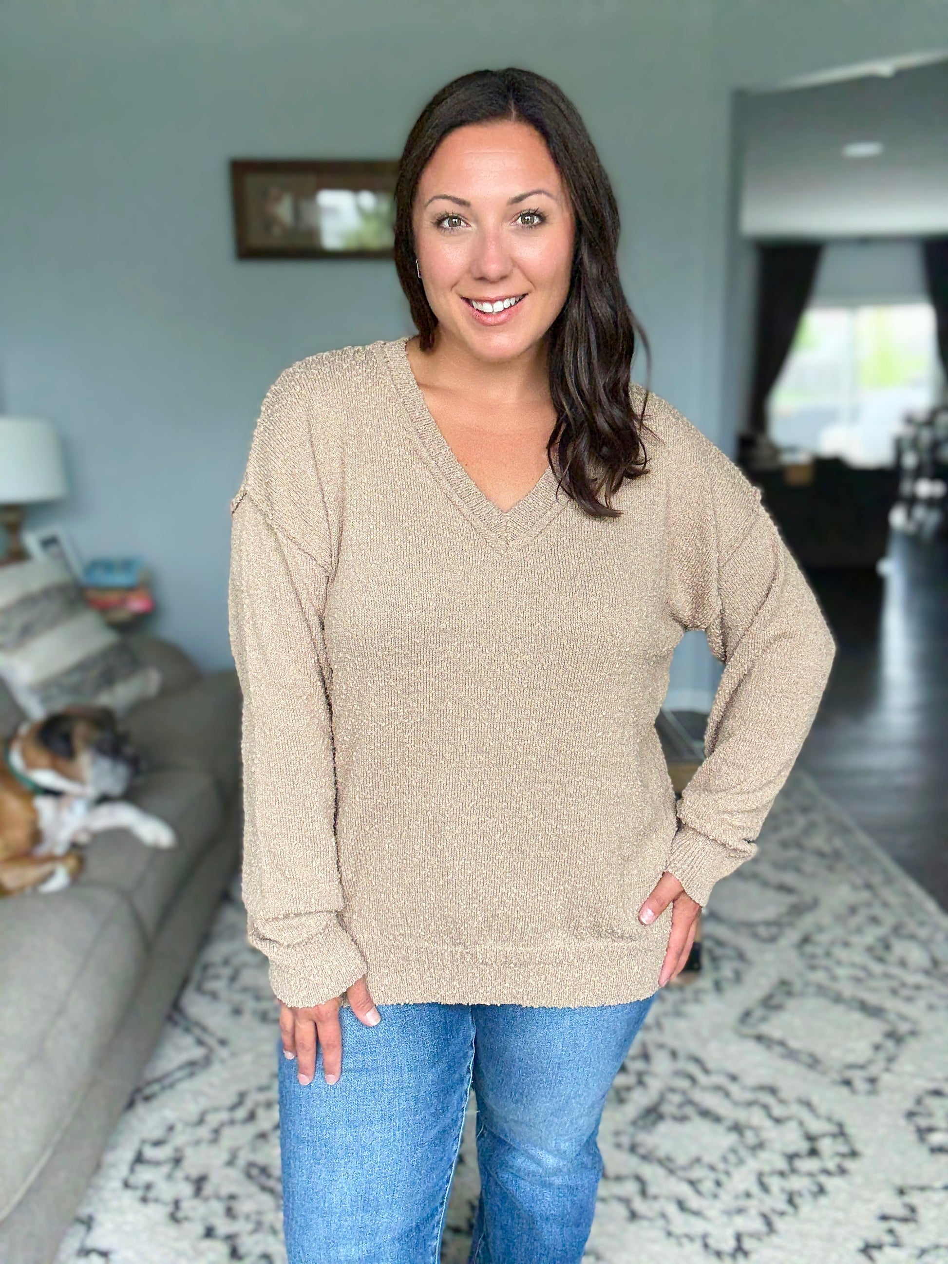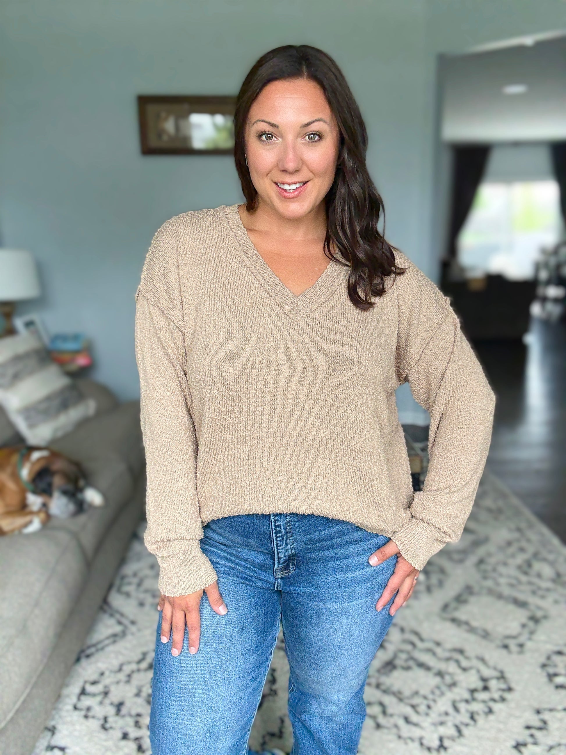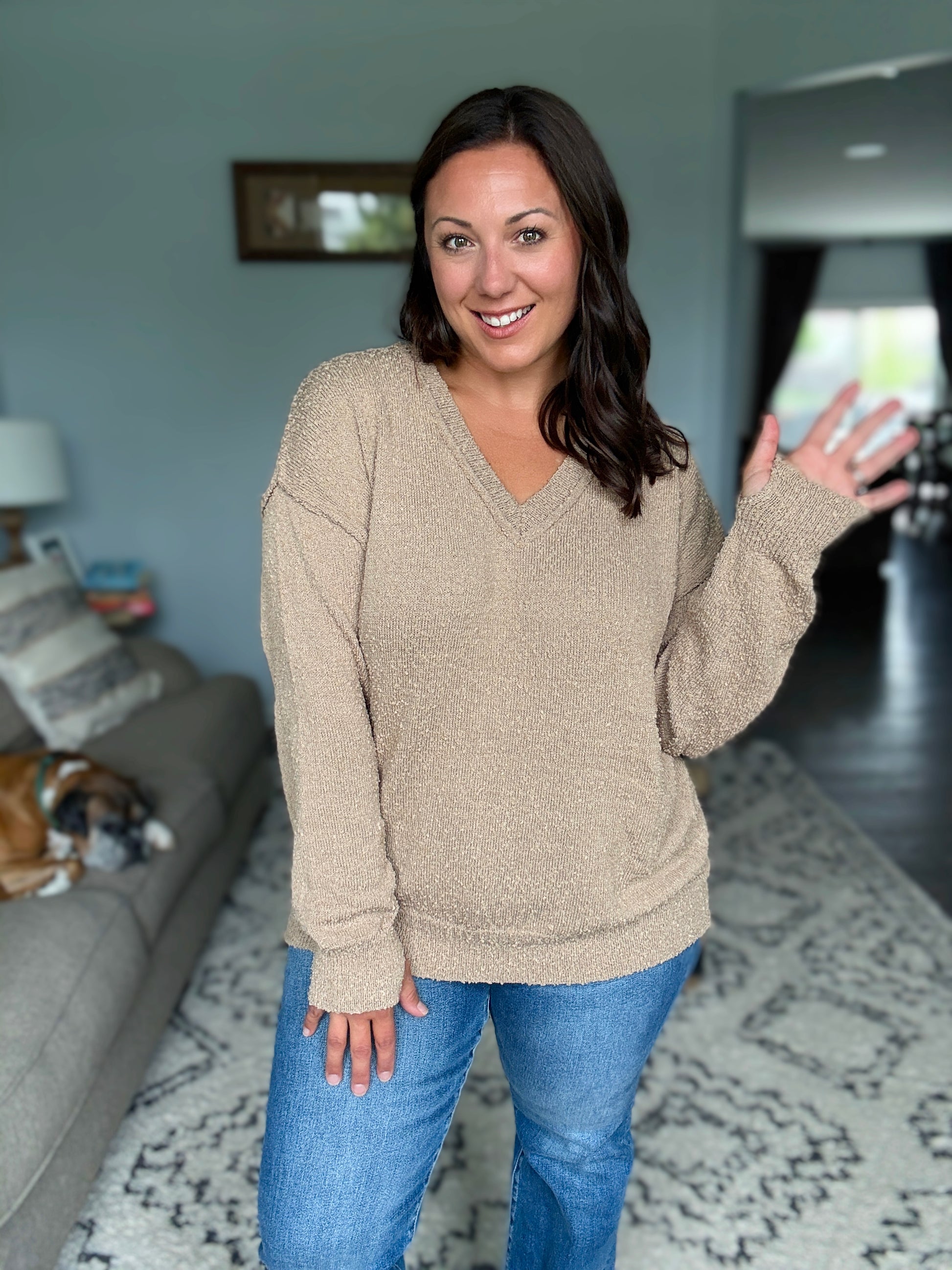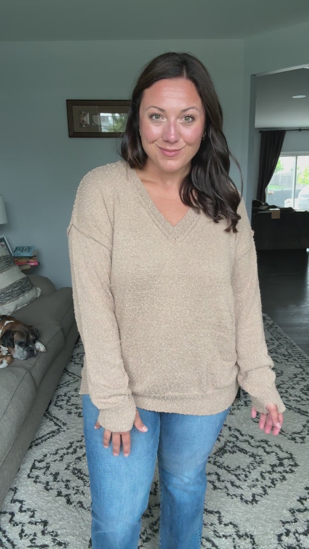 The Popcorn Texture V-neck Sweater is a unique and textured piece that adds dimension and interest to any outfit. It is soft and lighterweight and features a more relaxed, oversized fit and has thumbholes. This neutral sweater is a versatile and easy to wear style.