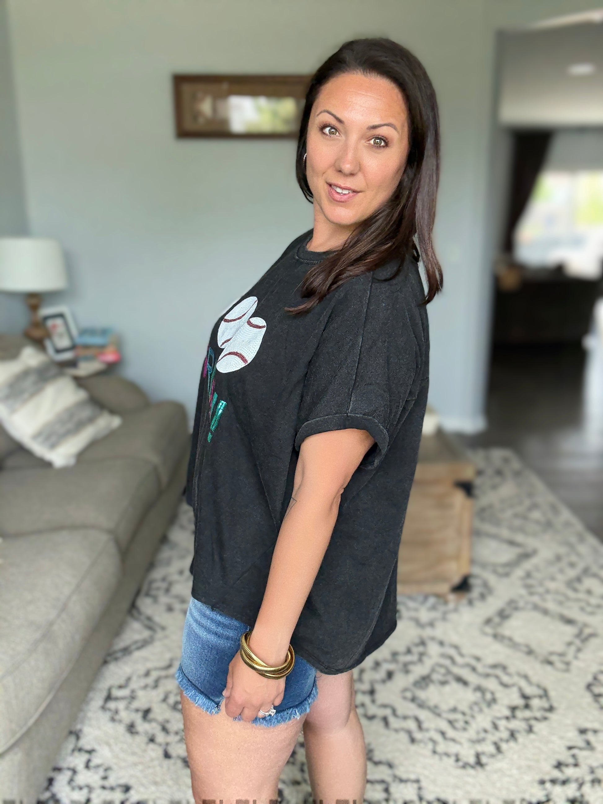 BiBi Sequin Baseballs Strike Washed Short Sleeve Top