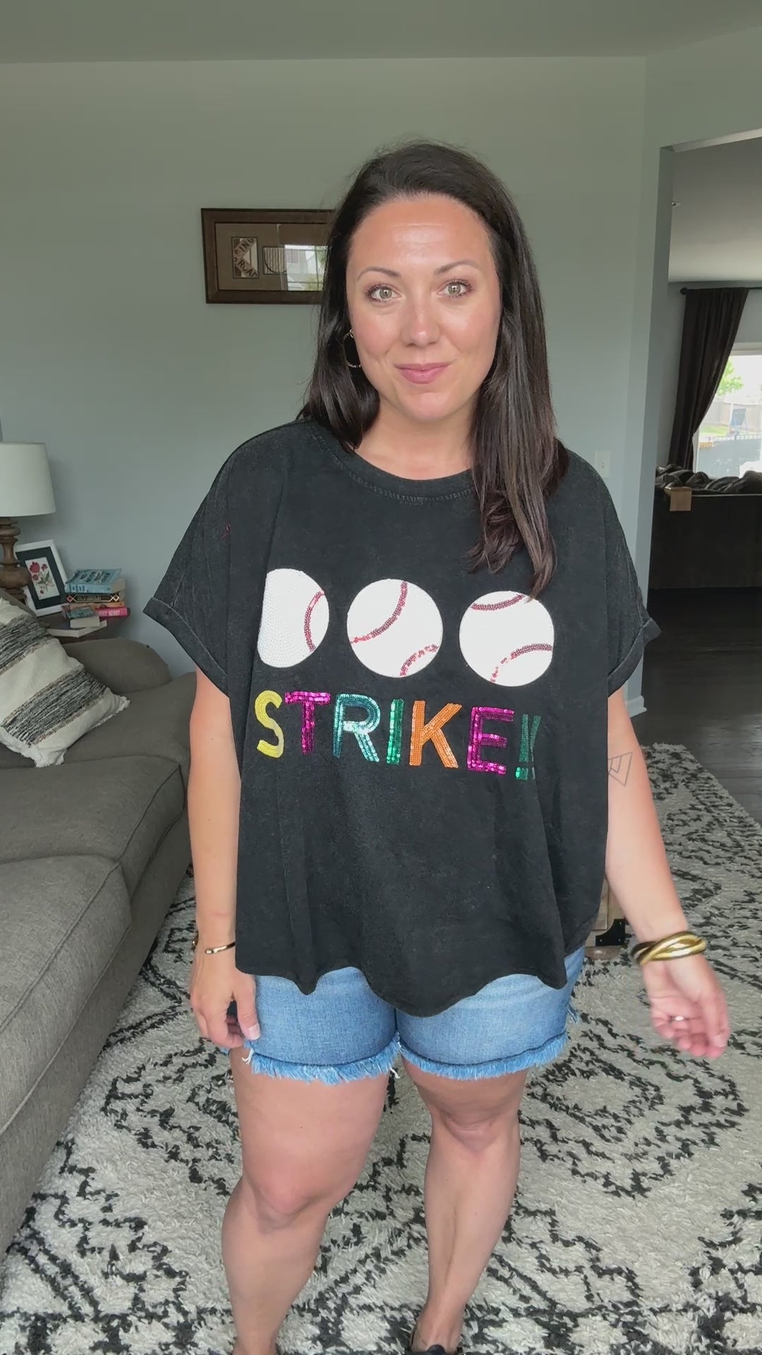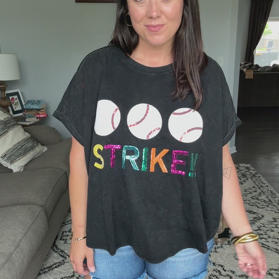 The Sequin Baseballs Strike Washed Short Sleeve Top combines sporty style with a touch of glam for the baseball fan who likes to be a little extra. This top features sequin baseball motifs and a colorful "STRIKE" on a washed cotton fabric for a trendy look. Perfect for adding a fun and playful element to your casual outfits.