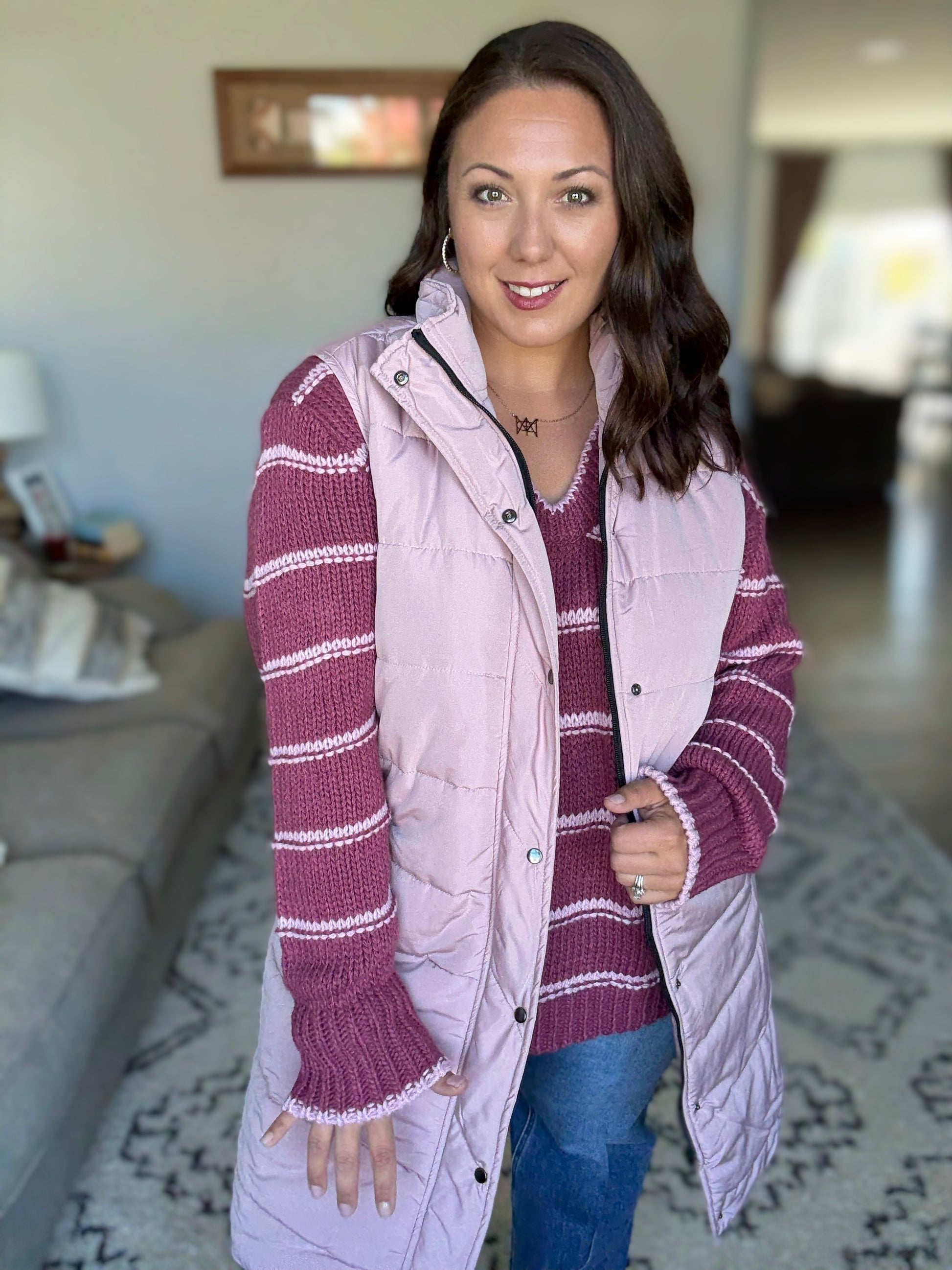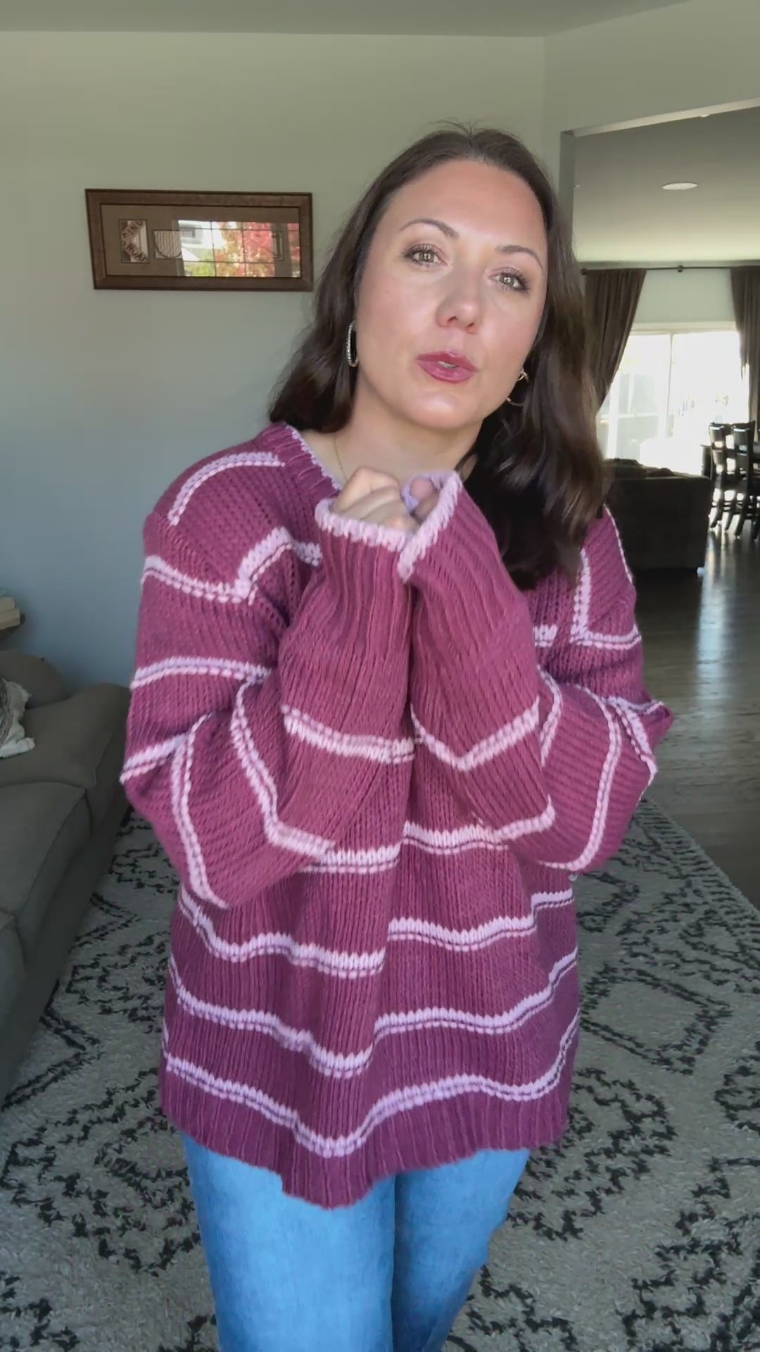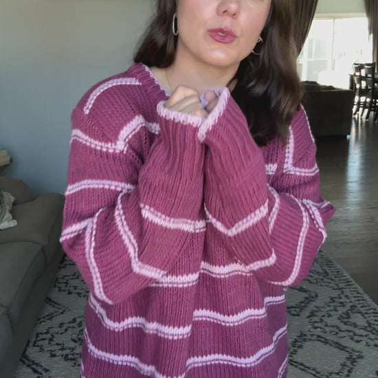 Stay cozy and chic with this gorgeous Plum and Blush Pink Striped Sweater. The striped pattern adds a classic and stylish touch to this sweater. The chunky knit and oversized fit make it a soft and cozy option to curl up in. The versatile design makes it easy to pair with jeans, pants, or skirts for various outfit options. Whether you're running errands, meeting friends for coffee or wearing it to your Thanksgiving gathering, his sweater is a great option.