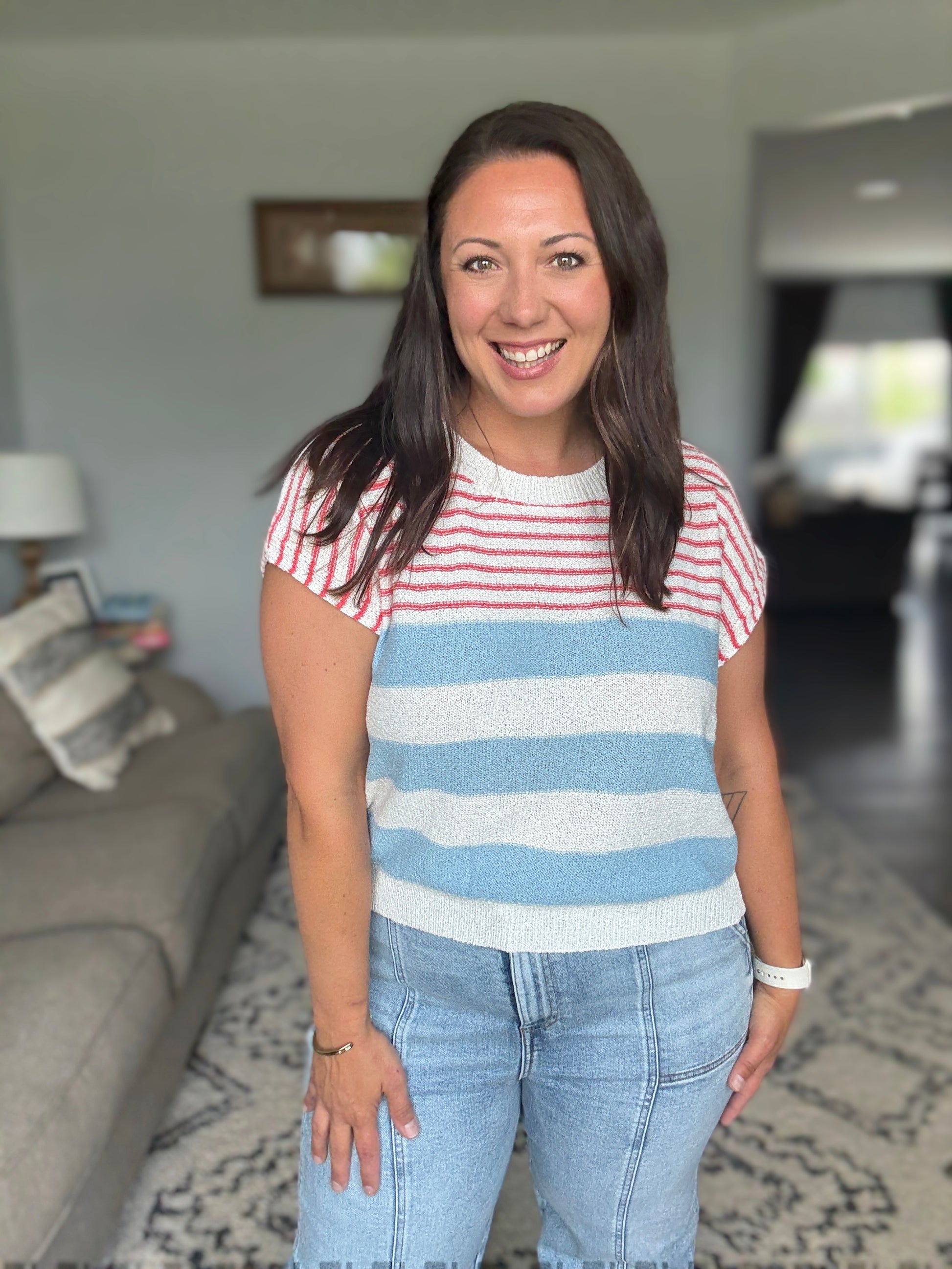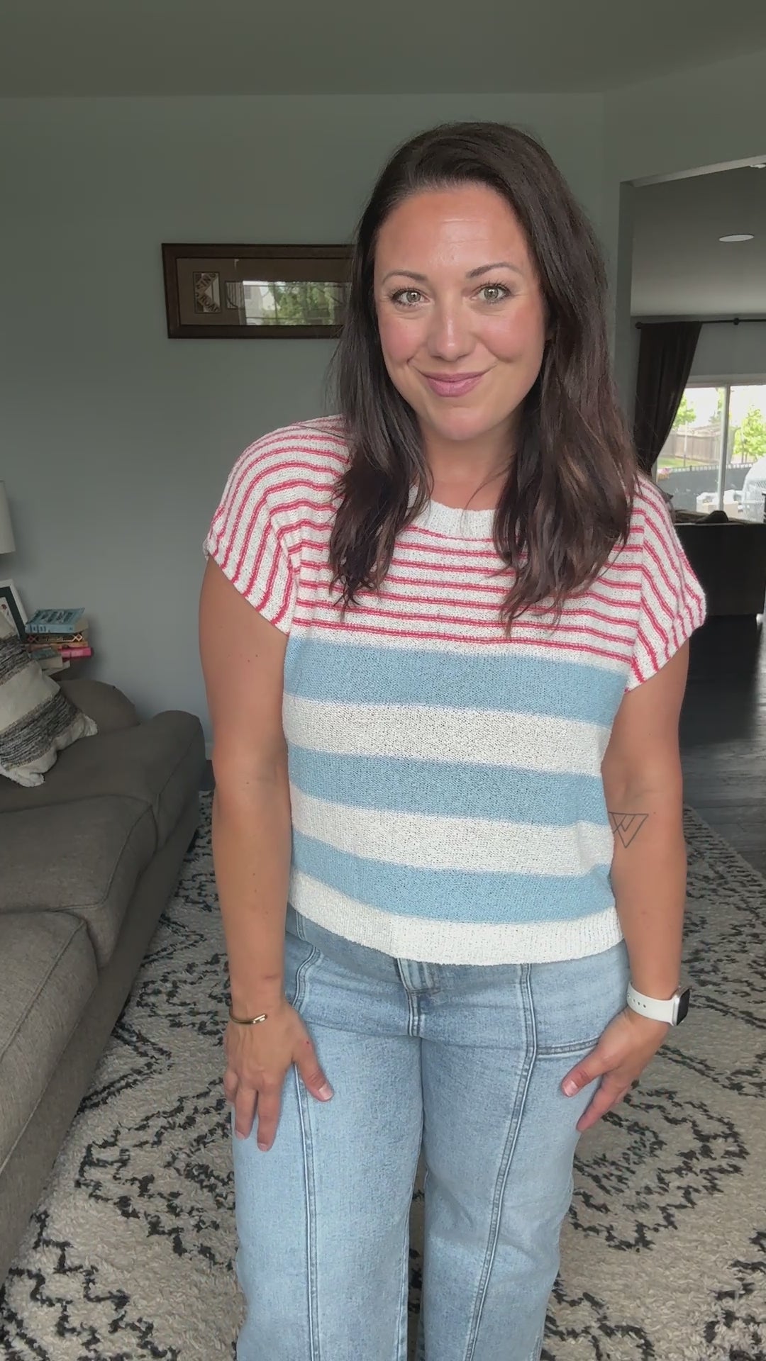 This stylish striped pullover features a contemporary color block design combining dark pink and powder blue horizontal stripes. Crafted from lightweight knit fabric, it offers comfortable breathability perfect for warm weather. The relaxed cropped silhouette with short sleeves creates a modern casual look. This versatile piece pairs beautifully with high-waisted bottoms and can transition from casual daywear to relaxed evening outings.