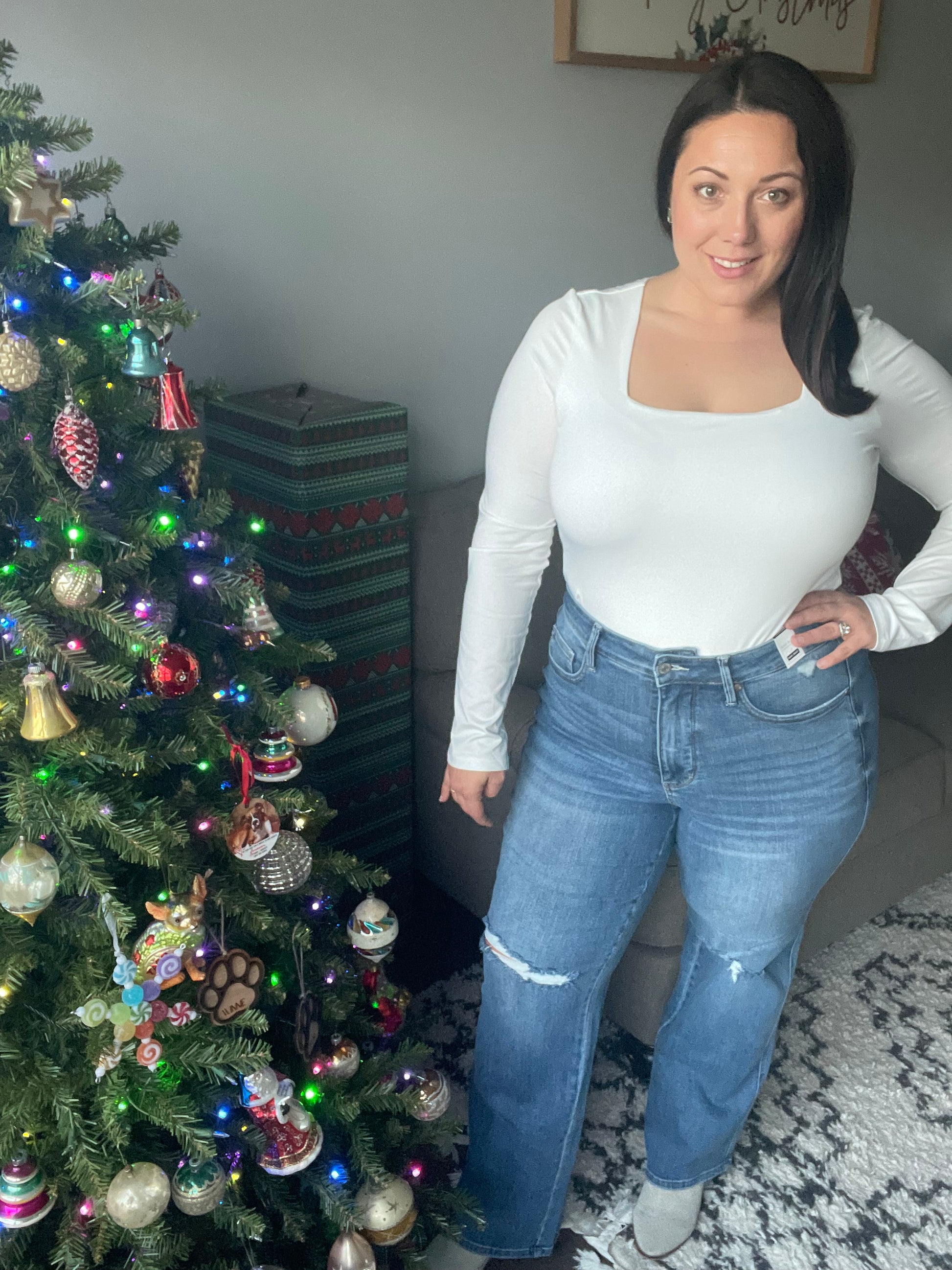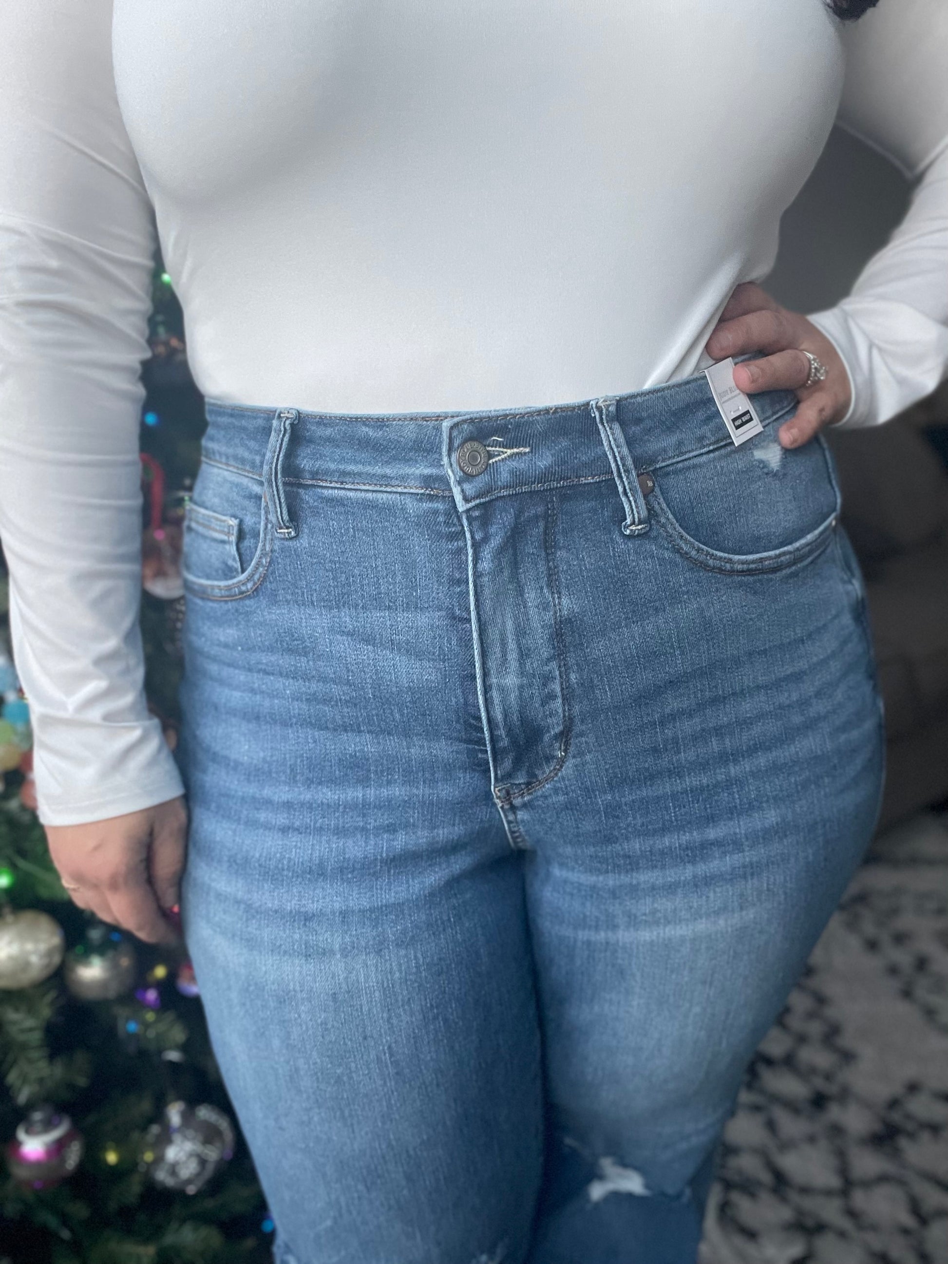 Introducing the Bree High Rise Control Top Distressed Straight Jeans from Judy Blue - the perfect blend of fashion and function. With a flattering high rise and tummy control technology, these jeans will give you a confidence boost. The distressed details and medium wash add an edgy touch to the classic straight silhouette.