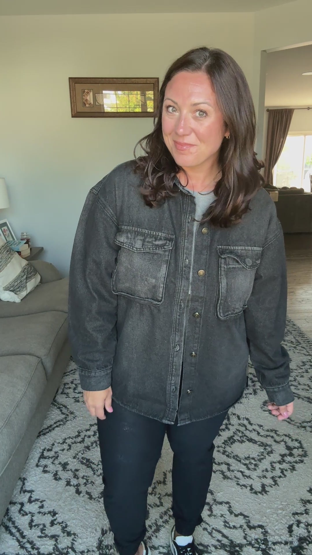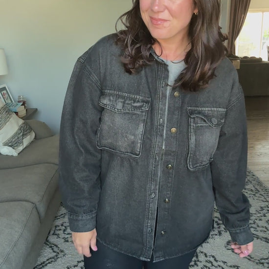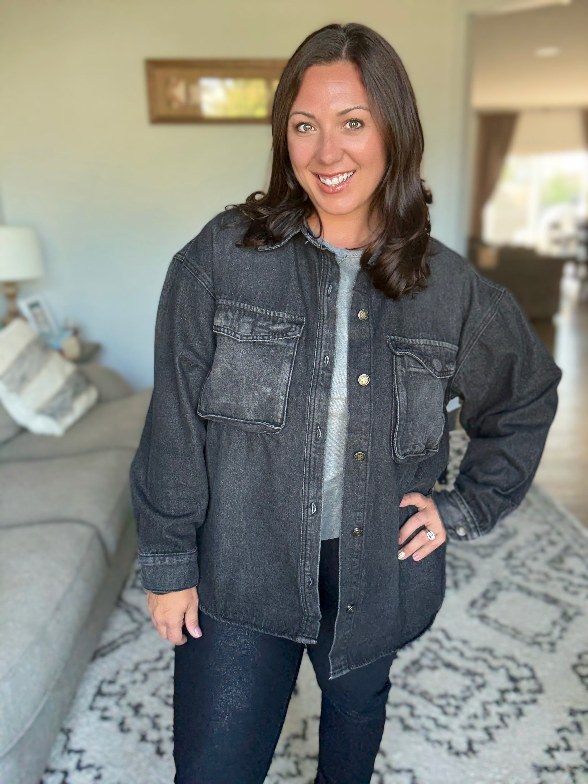 Our By The Fireside Shacket is the perfect layering piece for cool days. Crafted from washed black denim with gusseted pockets, its oversized fit and button front put a cozy spin on your favorite jeans-and-tee look.