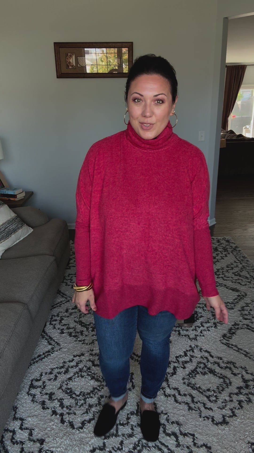 Stay cozy and stylish this winter season with our Cabin Holiday Brushed Melange Turtleneck Sweater in Dark Red. Made with soft brushed fabric, this relaxed poncho type sweater is the perfect addition to your wardrobe. Whether you're hitting the slopes or cuddled up by the fire, this sweater is perfect for all your holiday adventures.