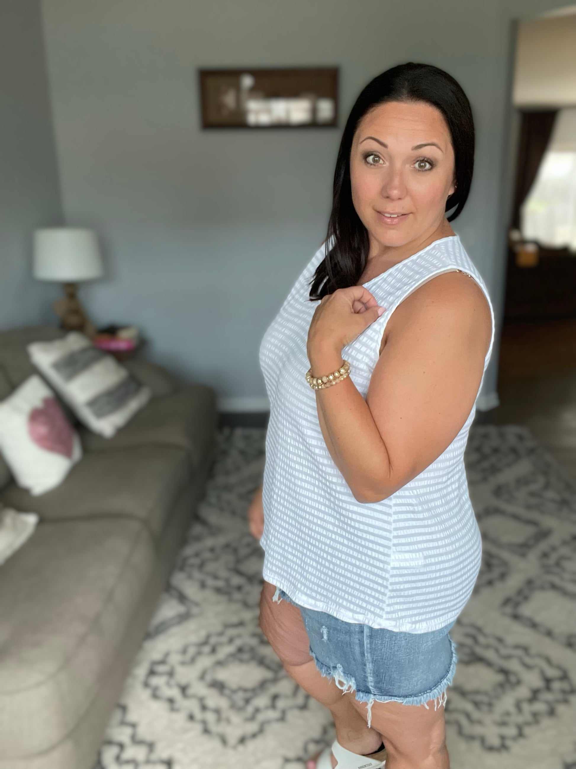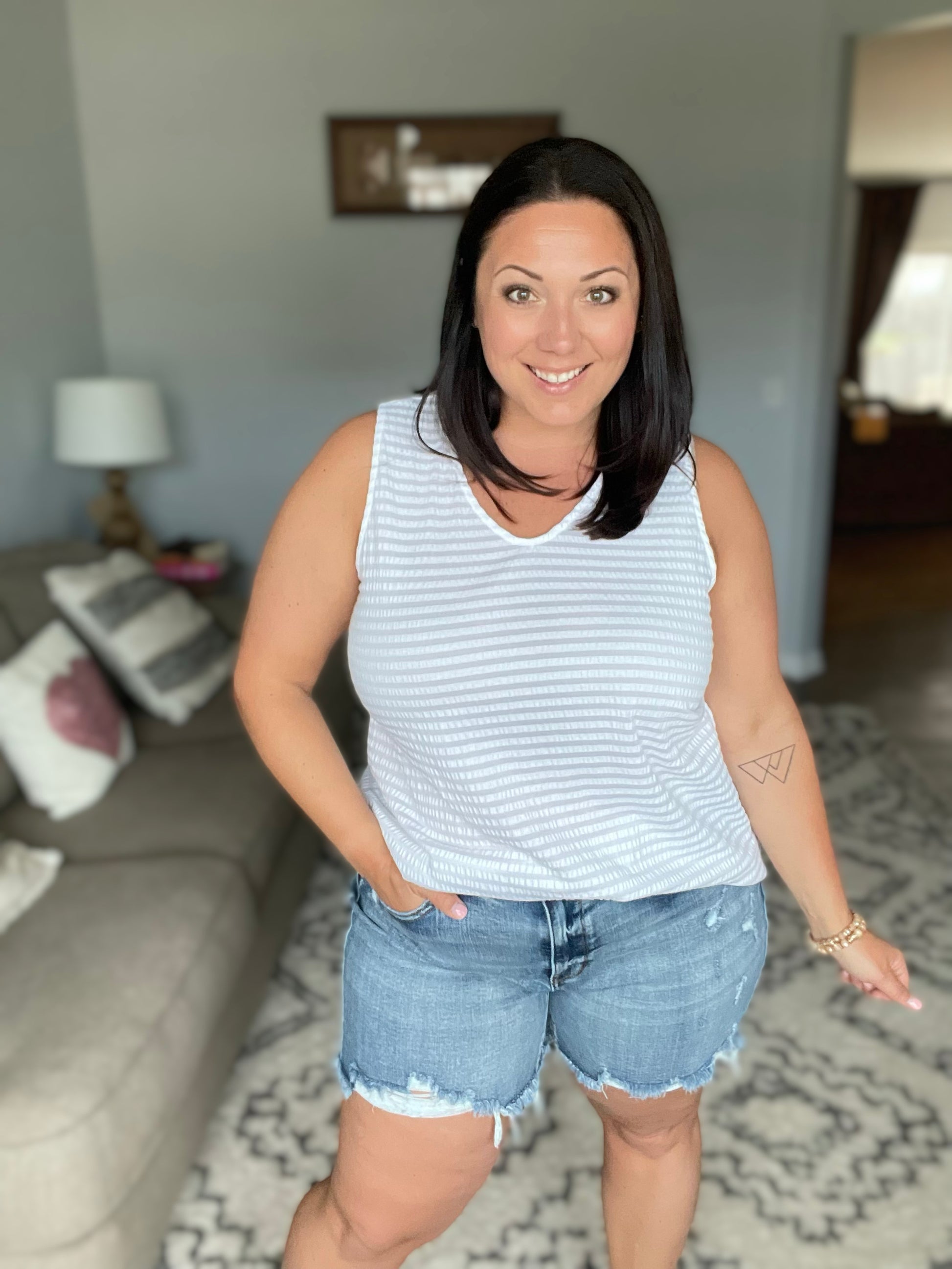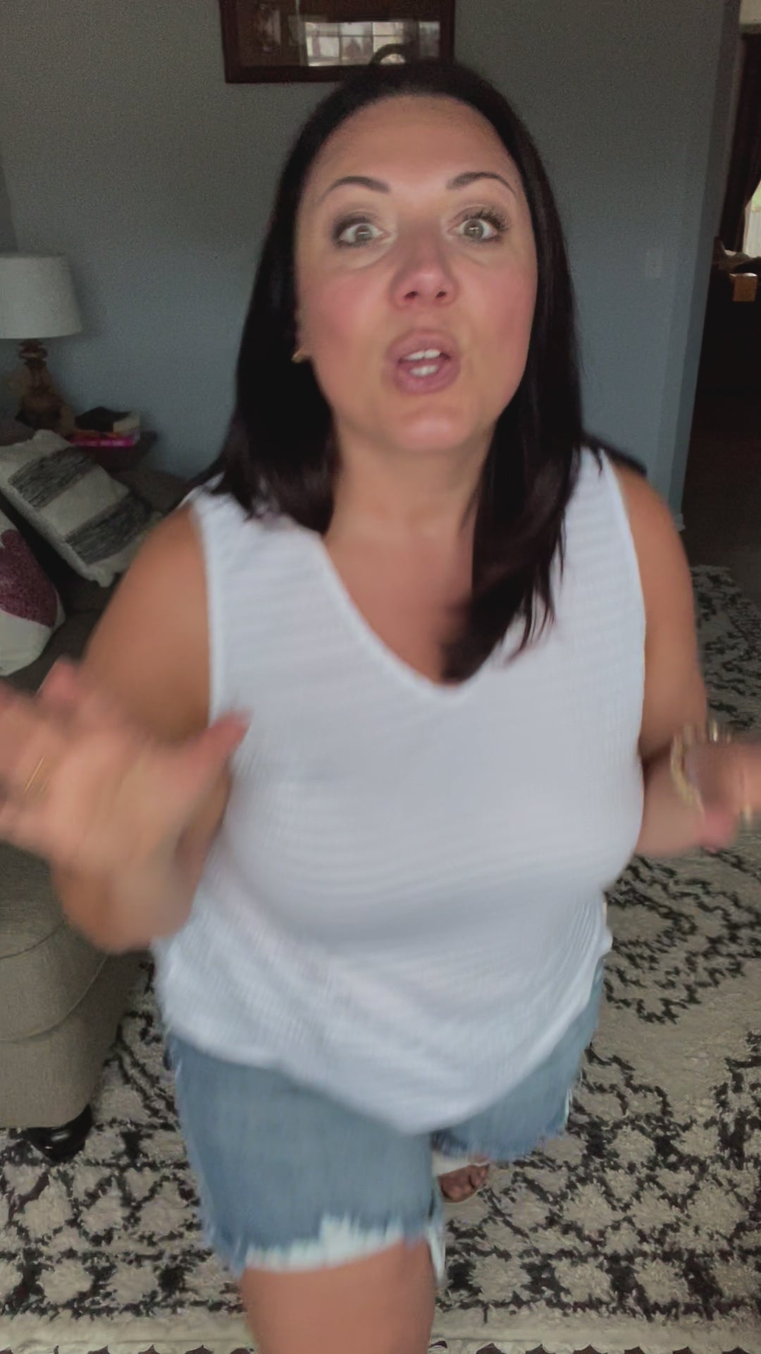 Amanda is wearing a 2X (thinking she wanted relaxed but who knew these had two buttons to accommodate for bloat days! Stick true to size!)