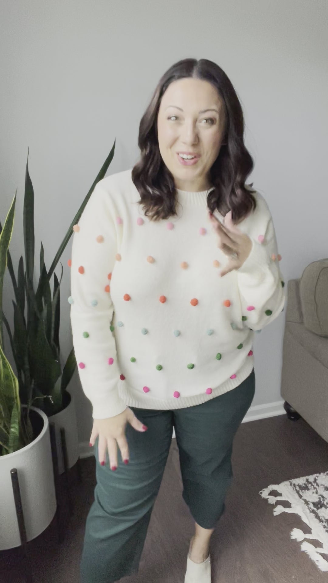 This Candy Buttons sweater features a cozy knit with rainbow-hued pom pom details for a unique look. The round neckline and long sleeves provide a comfortable fit, while ribbed hems complete the design. Cozy and stylish–all in one!