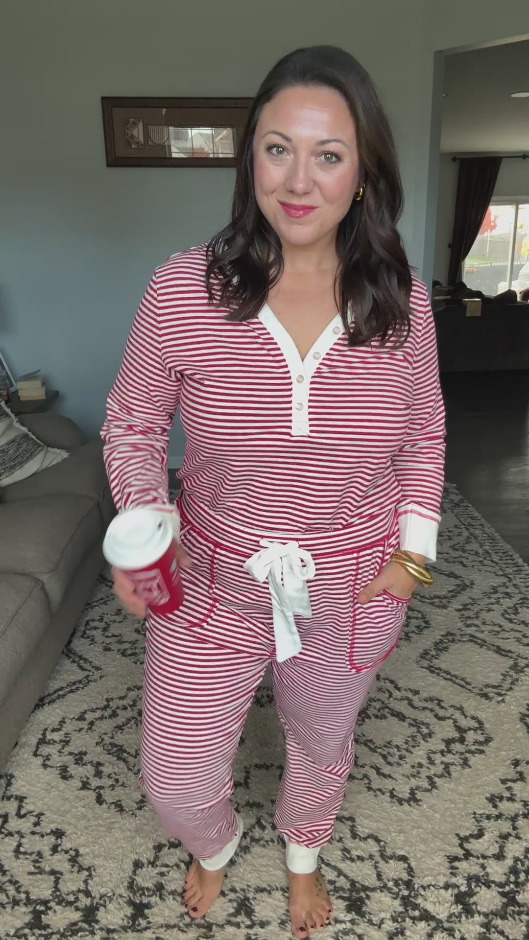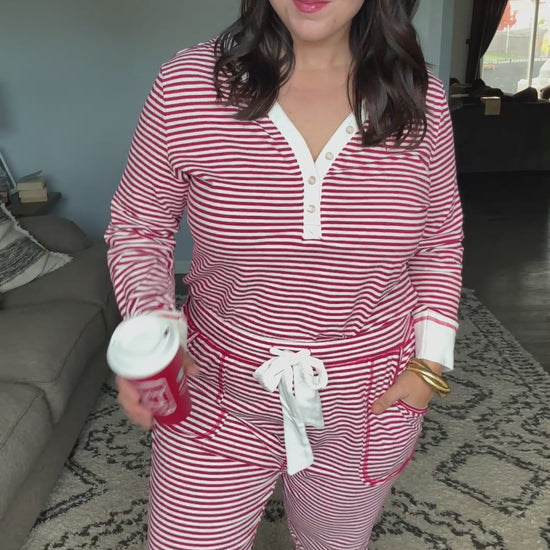Snooze in style with the Candy Cane Lane Pajama Set, designed for maximum comfort and charm. This lightweight jersey knit feels buttery soft against your skin while keeping you cool through the night. The V-neckline with functional neck buttons lets you customize your coverage, while the drawstring waistband and side pockets add both function and flair. Ribbed details at the neckline, cuffs, and hem create a polished finish, and exposed seams bring playful visual interest. Sweet dreams never looked so good.