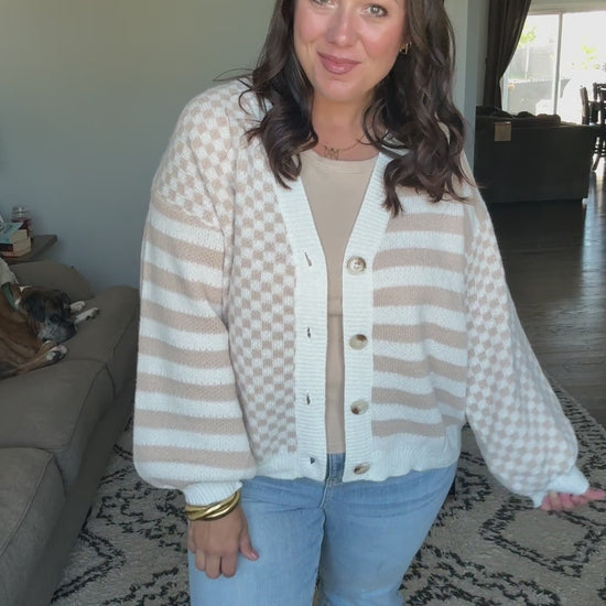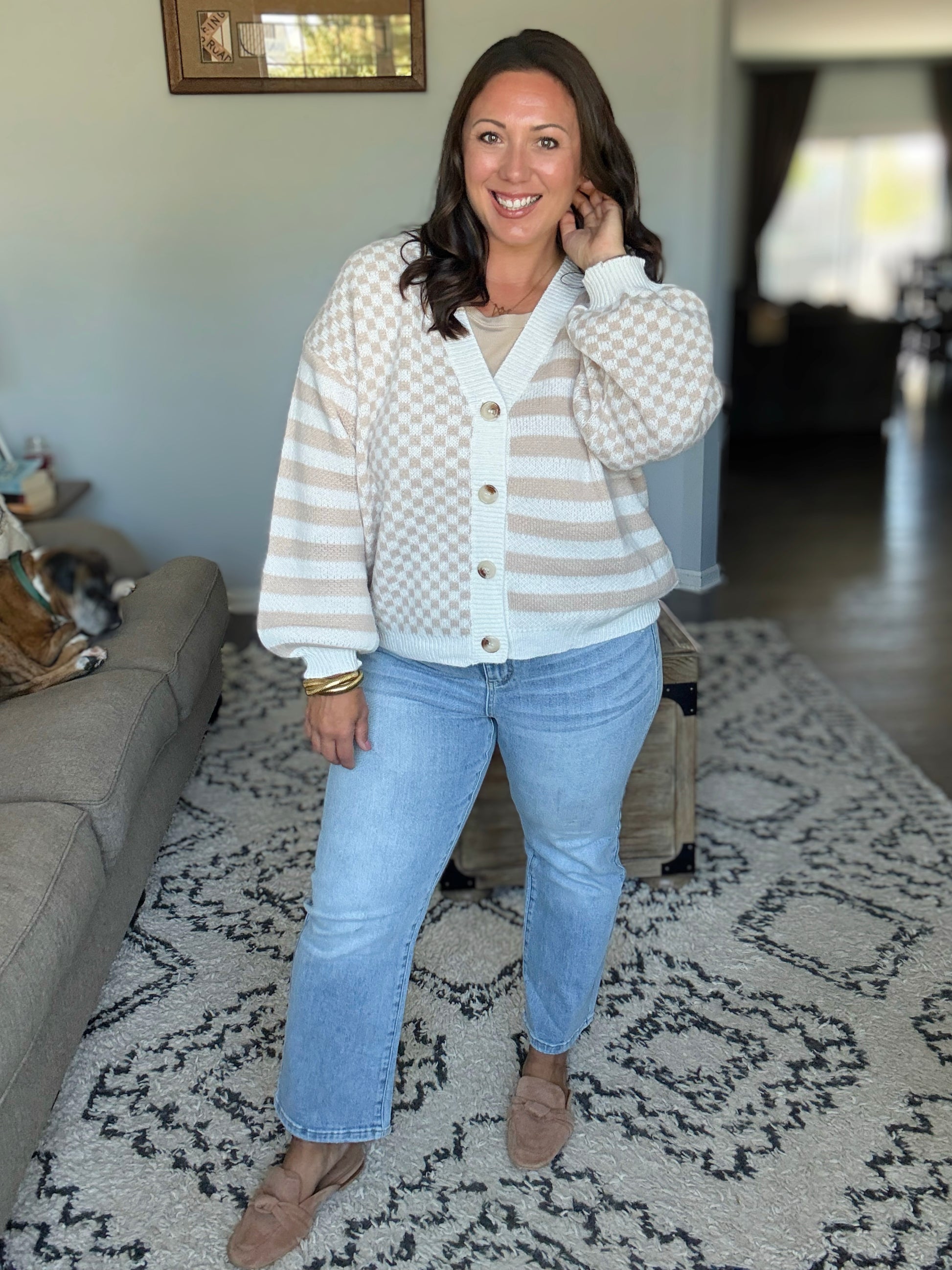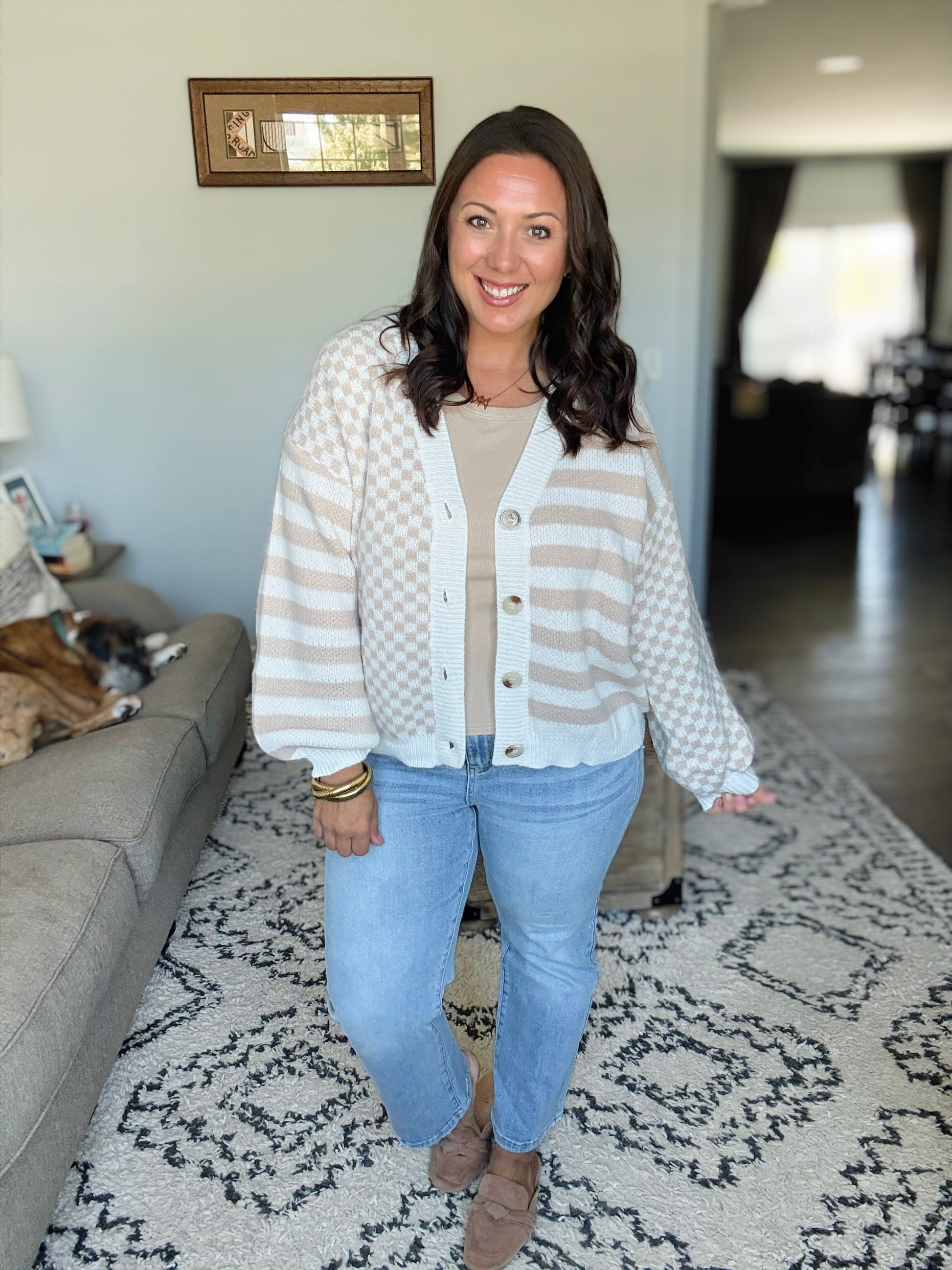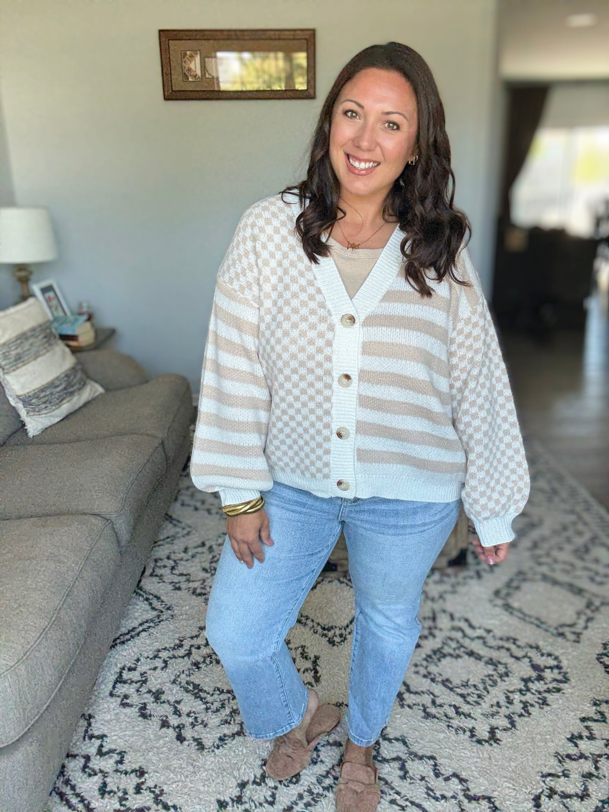 Wrap yourself in coziness in our Check That Line Cardigan and enjoy the mix of neutral checks and stripes. This ultra-soft knit sweater features a comfortable dropped shoulder and a classic button front design. Great for transitional layering, this cardi makes it easy to step out in style while staying warm!