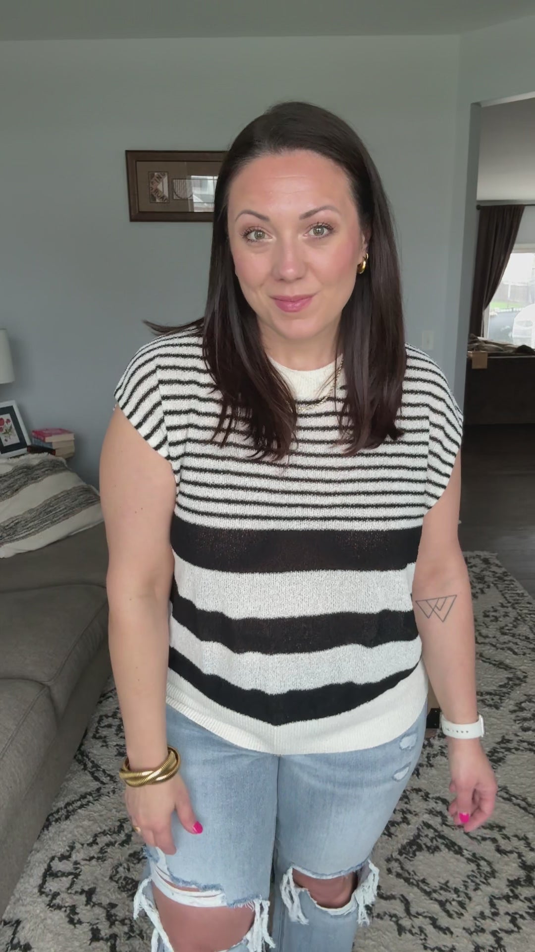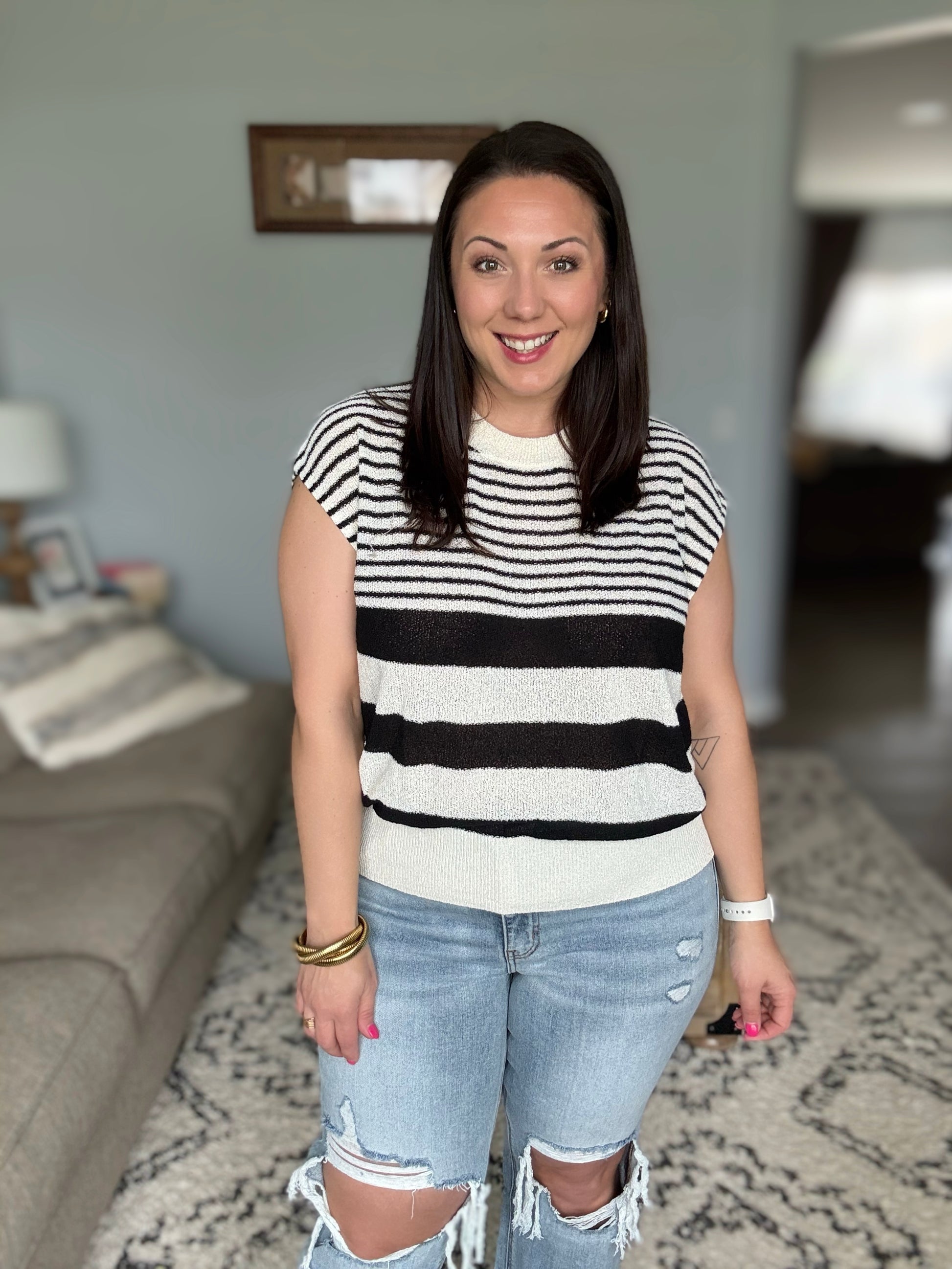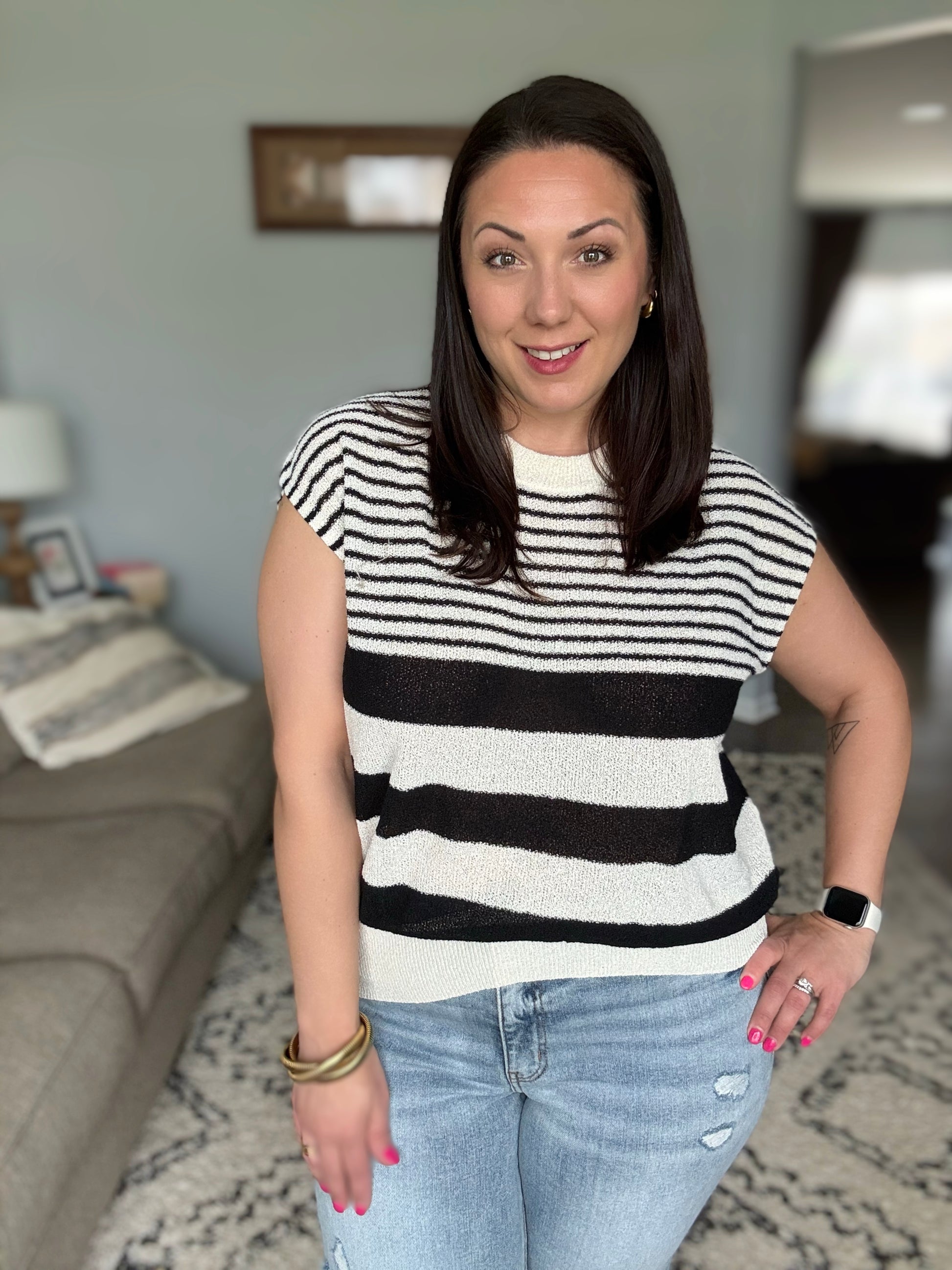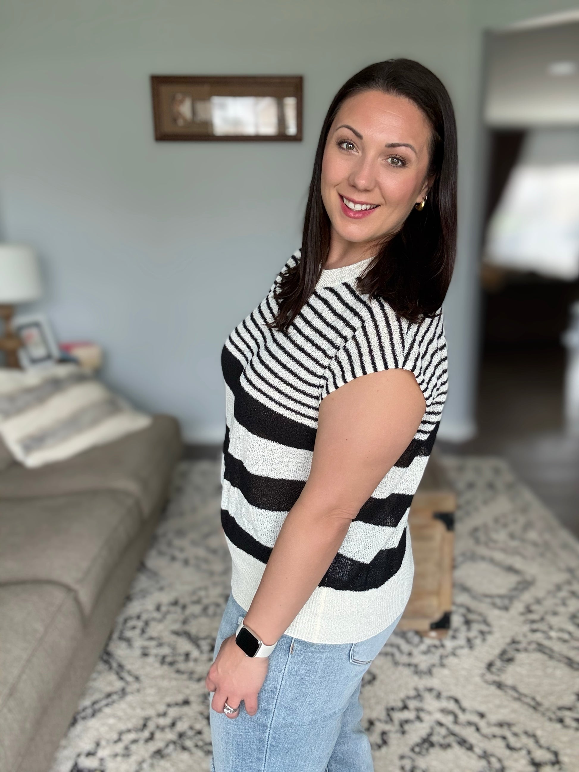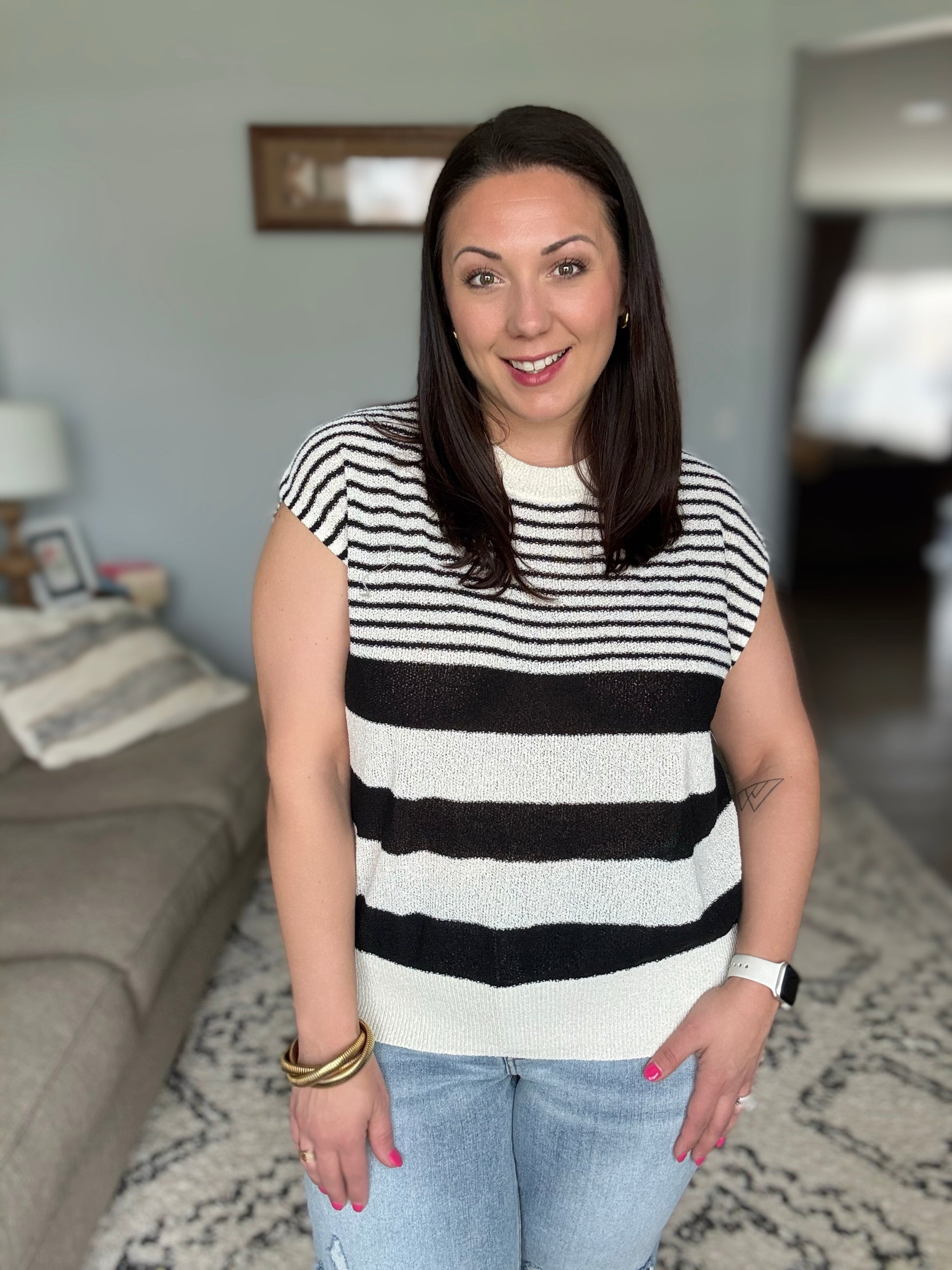 A perfect balance of effortless style and everyday comfort, the Chic and Sweet Striped Knit Top is a must-have for your wardrobe. The banded, ribbed round neckline and hemline add a structured touch, creating a flattering silhouette that’s easy to wear. Whether paired with denim for a casual day out or layered over a camisole for a polished look, this striped knit top is as versatile as it is stylish.