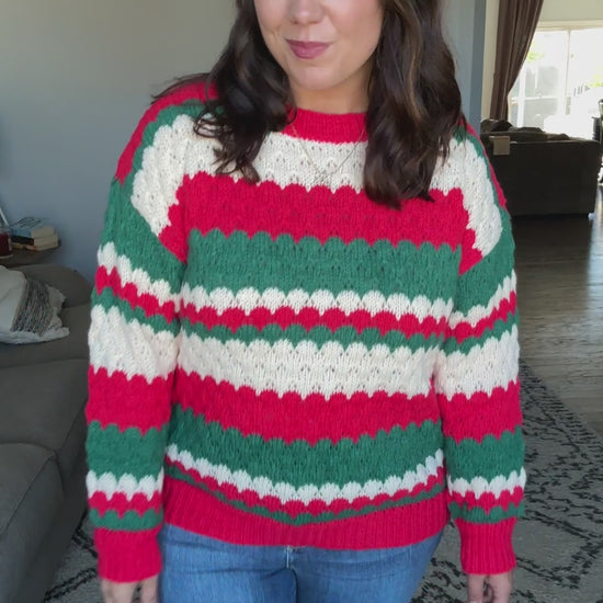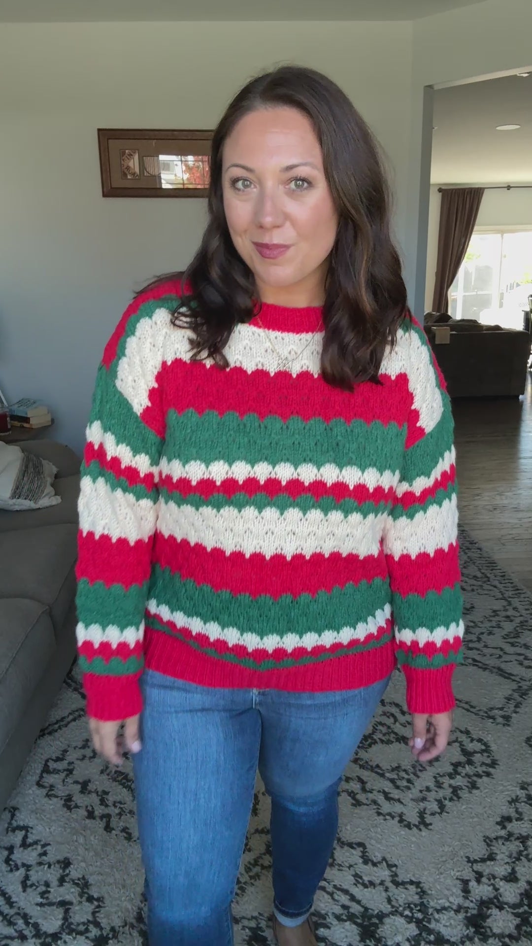 Snuggle up in our Christmas Stripes Sweater and let the holiday fun begin! These playful stripes dance in an almost chevron pattern, bringing cheer to chilly days. Deliciously thick and cozy, it's like wearing a warm hug that keeps Jack Frost from nipping at your nose. Perfect for decking the halls or lounging by the fire with hot cocoa! Festive colors of red, green and tan!
