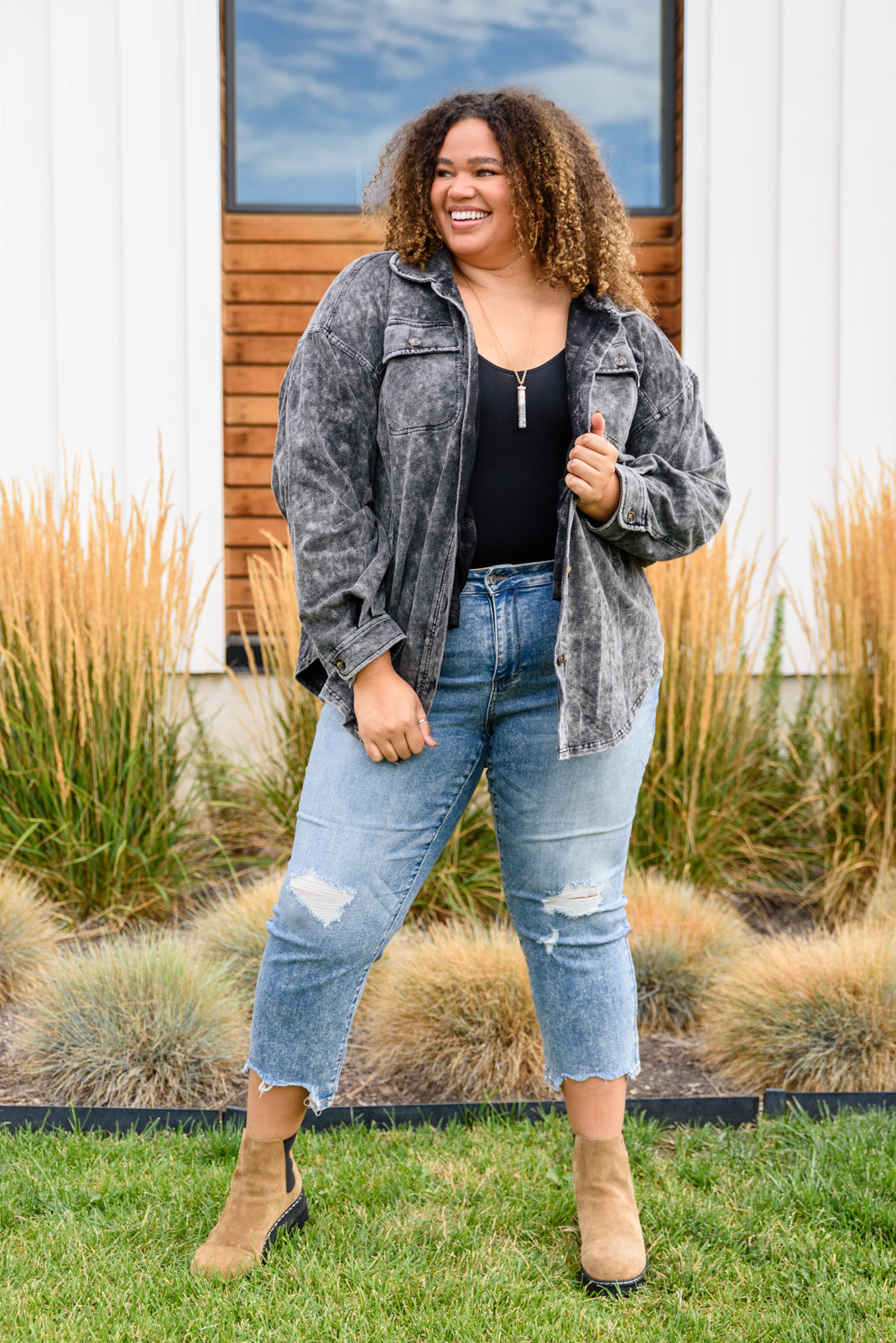 The Cityscape Cropped Chew Hem has your name written all over it! They were absolutely made for you with a mid rise waist, slight distressing through the legs, and a chewed hem placed in a subtle acid wash. The flared ankle fit is just another reason why we love these jeans! Show off your cutest shoes in these jeans and look great while doing it.