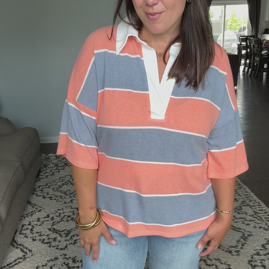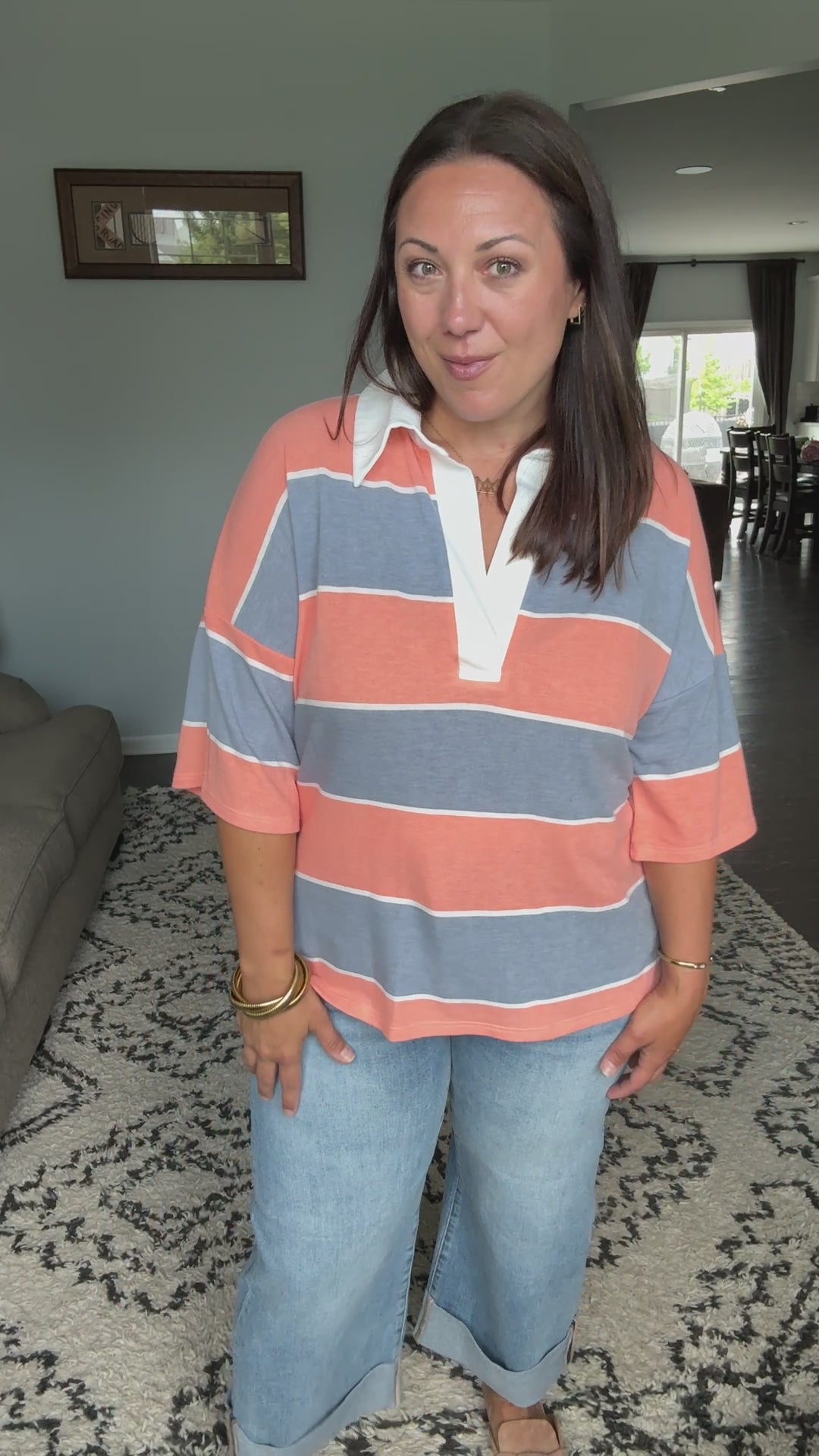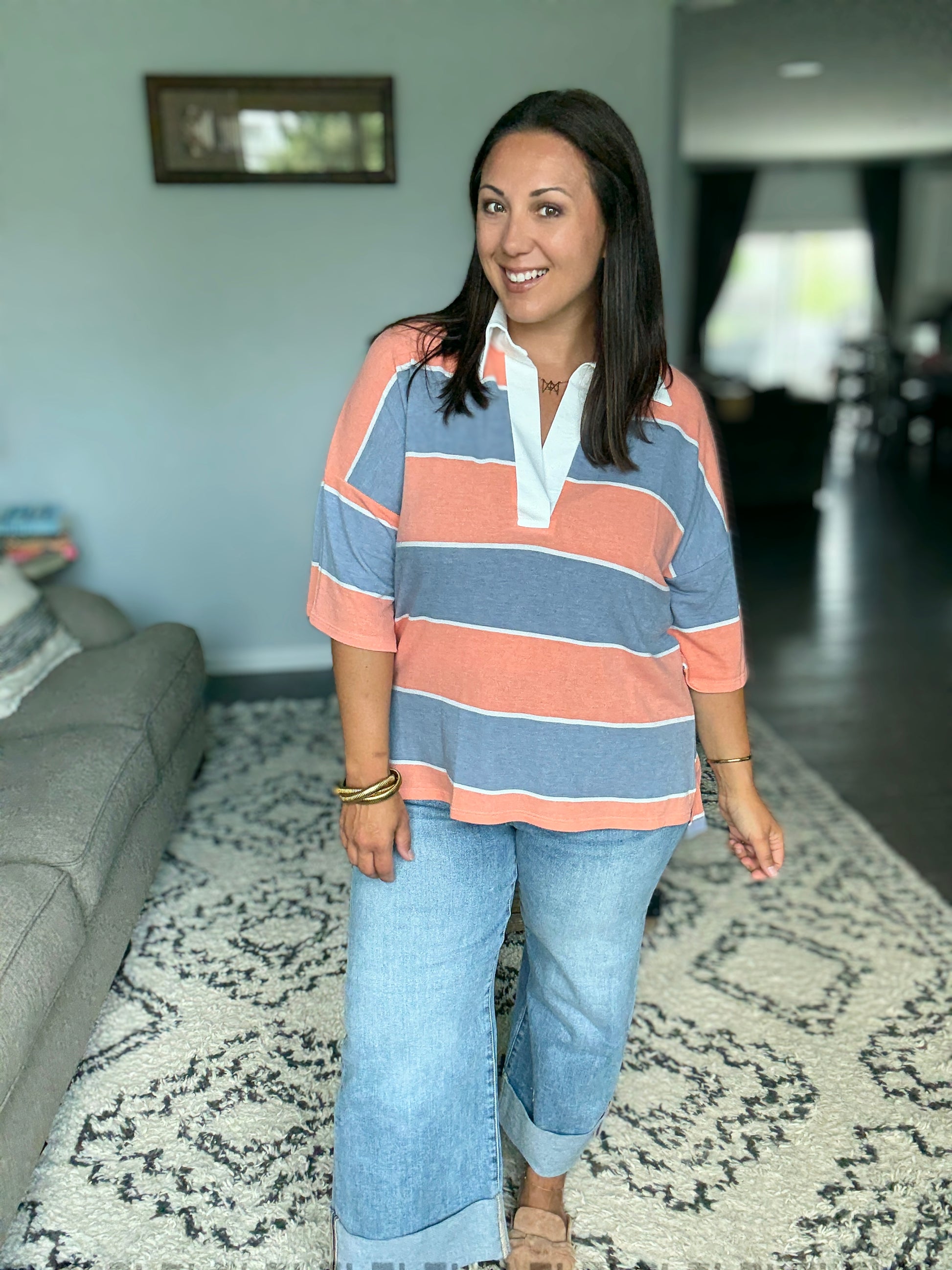 The Cloudbound Collared Casual Top in Orange and Denim combines comfort and style with its high-stretch French terry fabric. Featuring a contrast collared V-neckline and relaxed drop shoulders, this top offers a flattering, easygoing fit. The stepped hem and side slits add subtle movement and modern detail, making it a versatile choice for casual days when you want to feel both comfortable and confident.