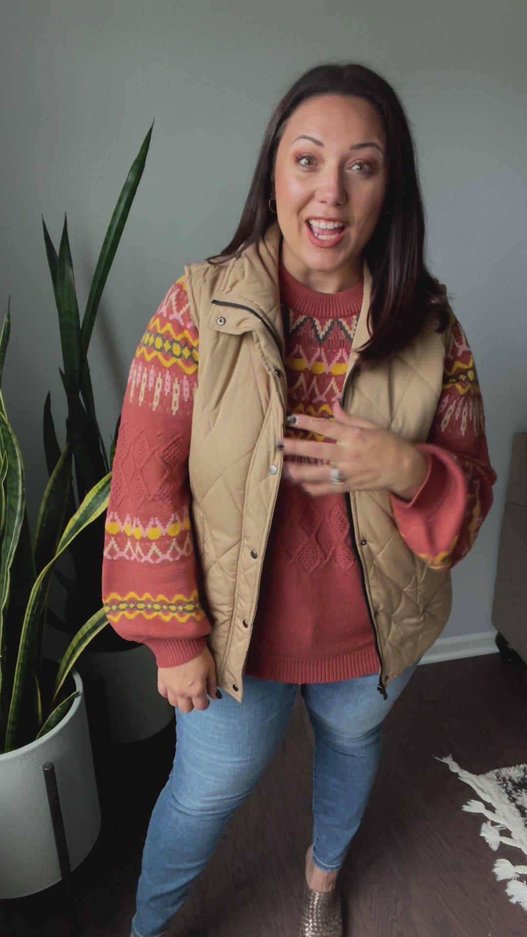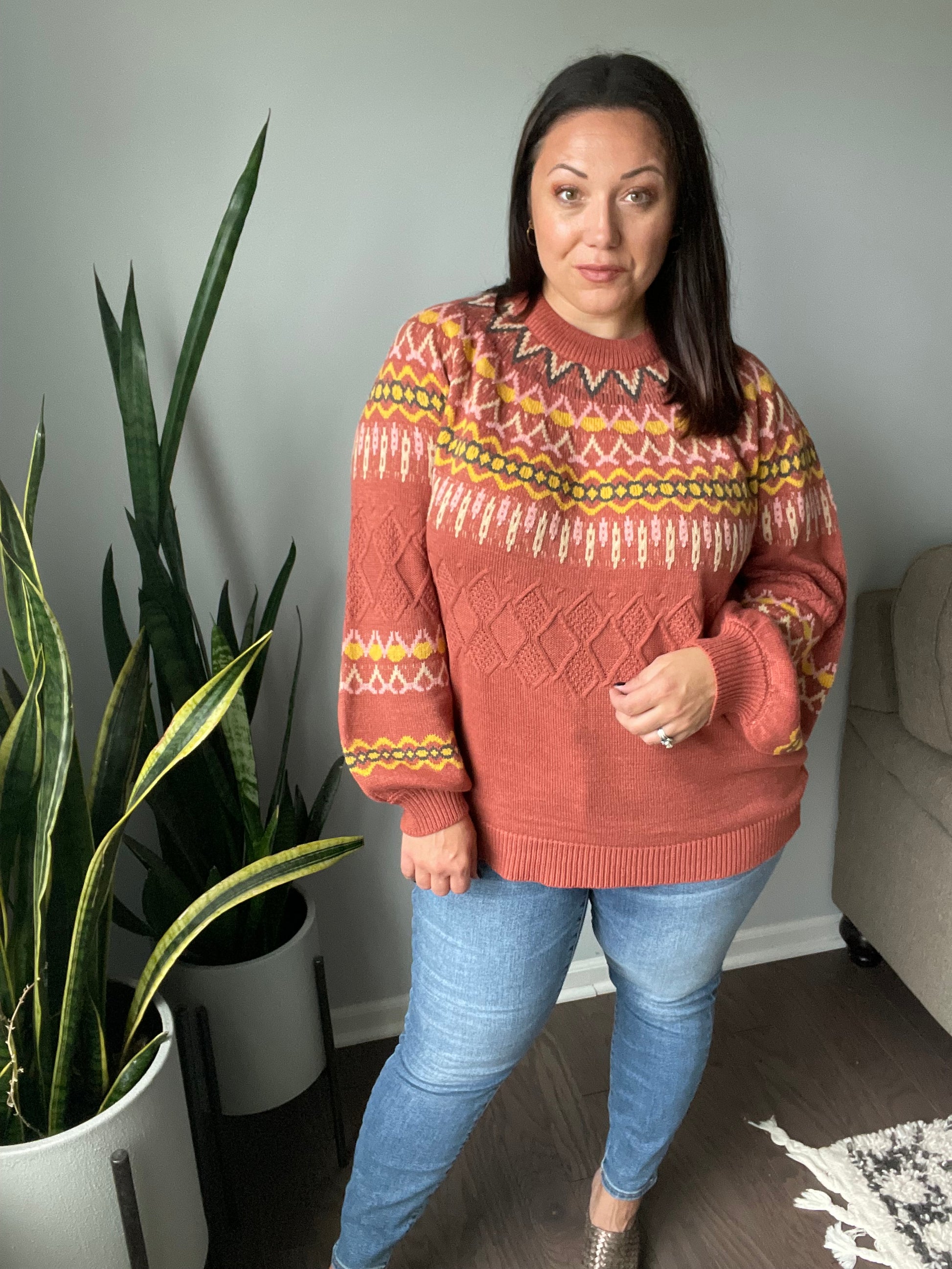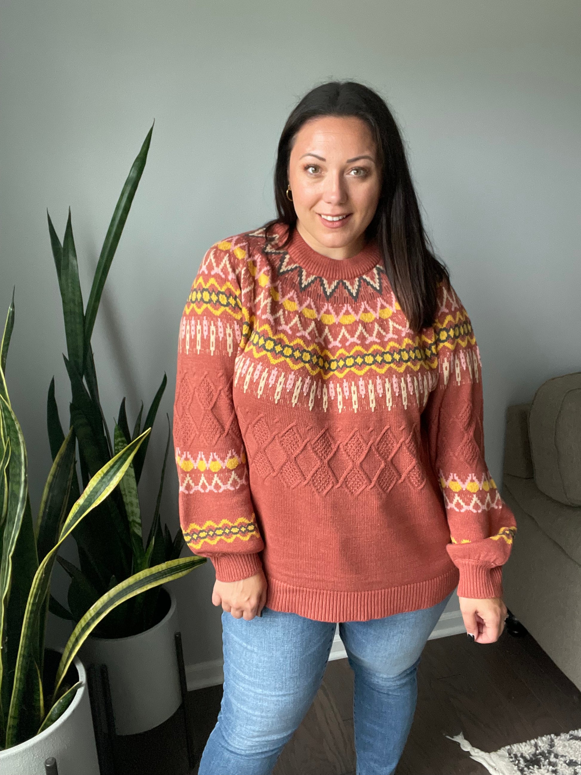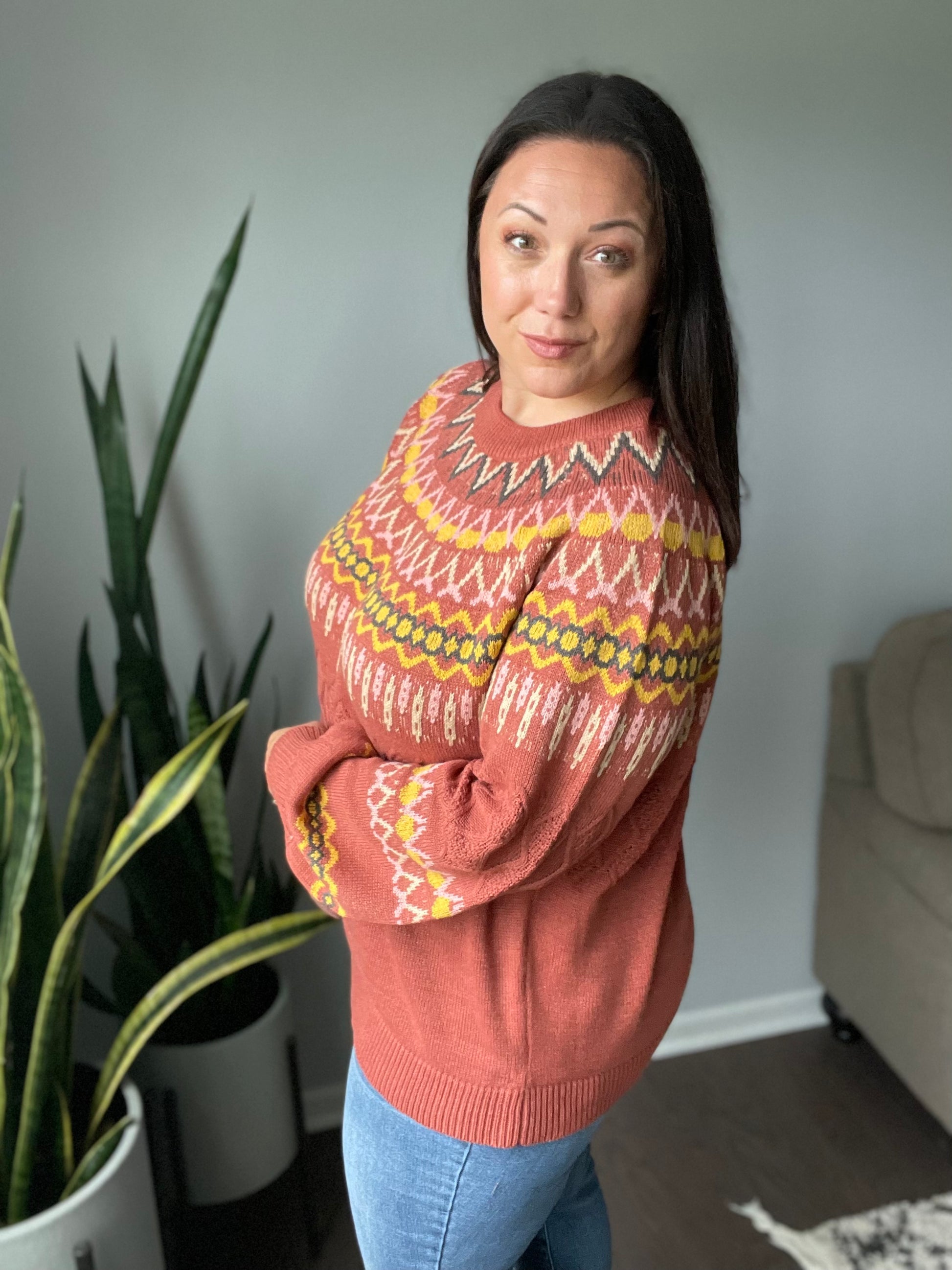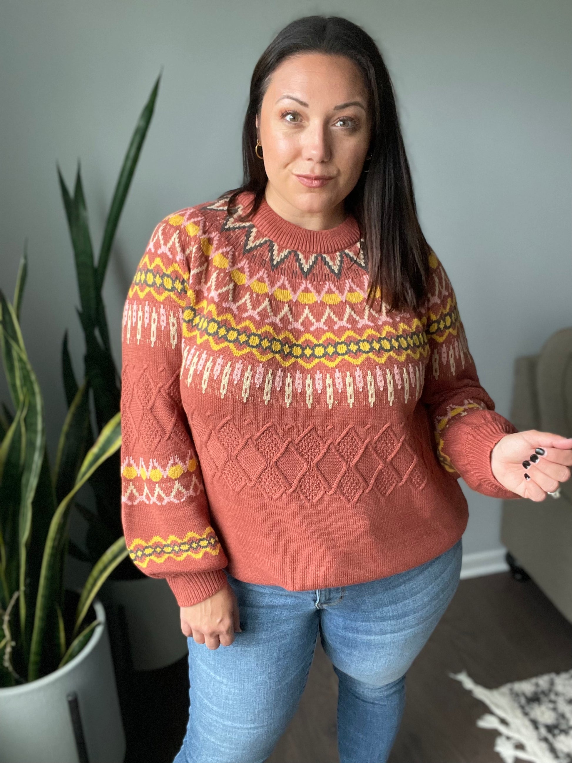This stylish Cozy Chalet Fair Isle Sweater offers a luxurious look and feel. Through its sweater knit and vibrant fair isle pattern, you'll love wrapping up in its rich colors and balloon sleeves on chilly days.