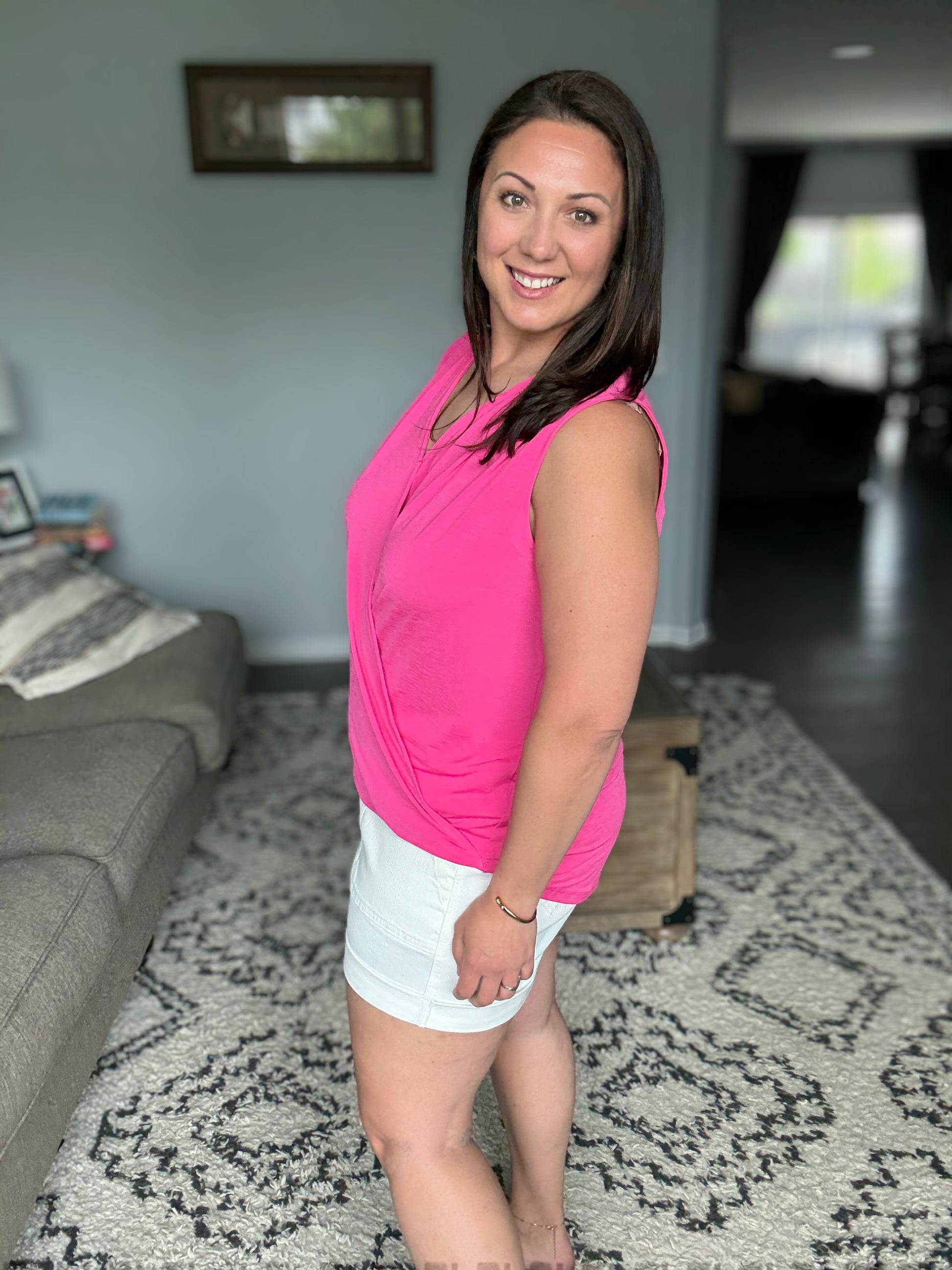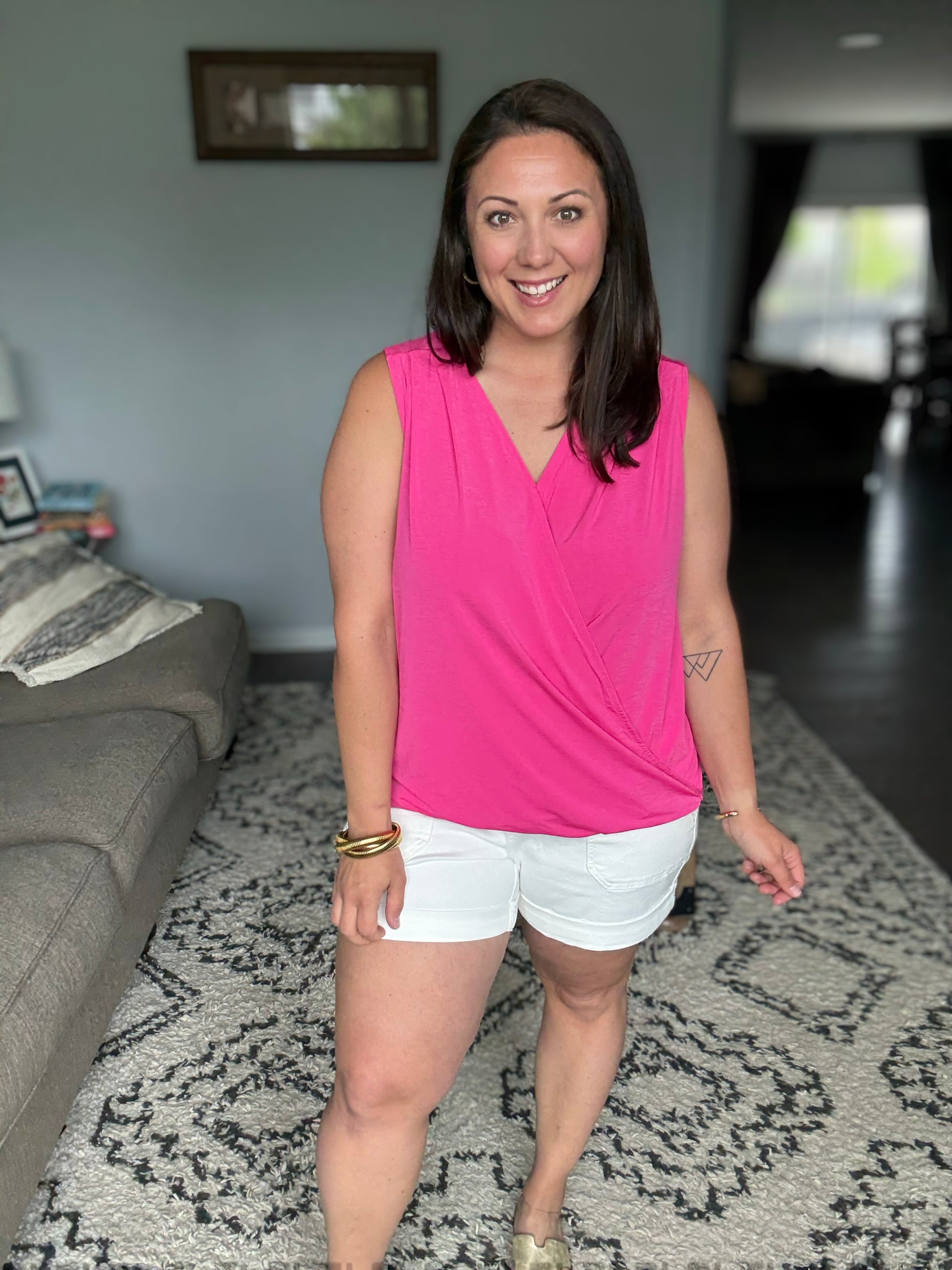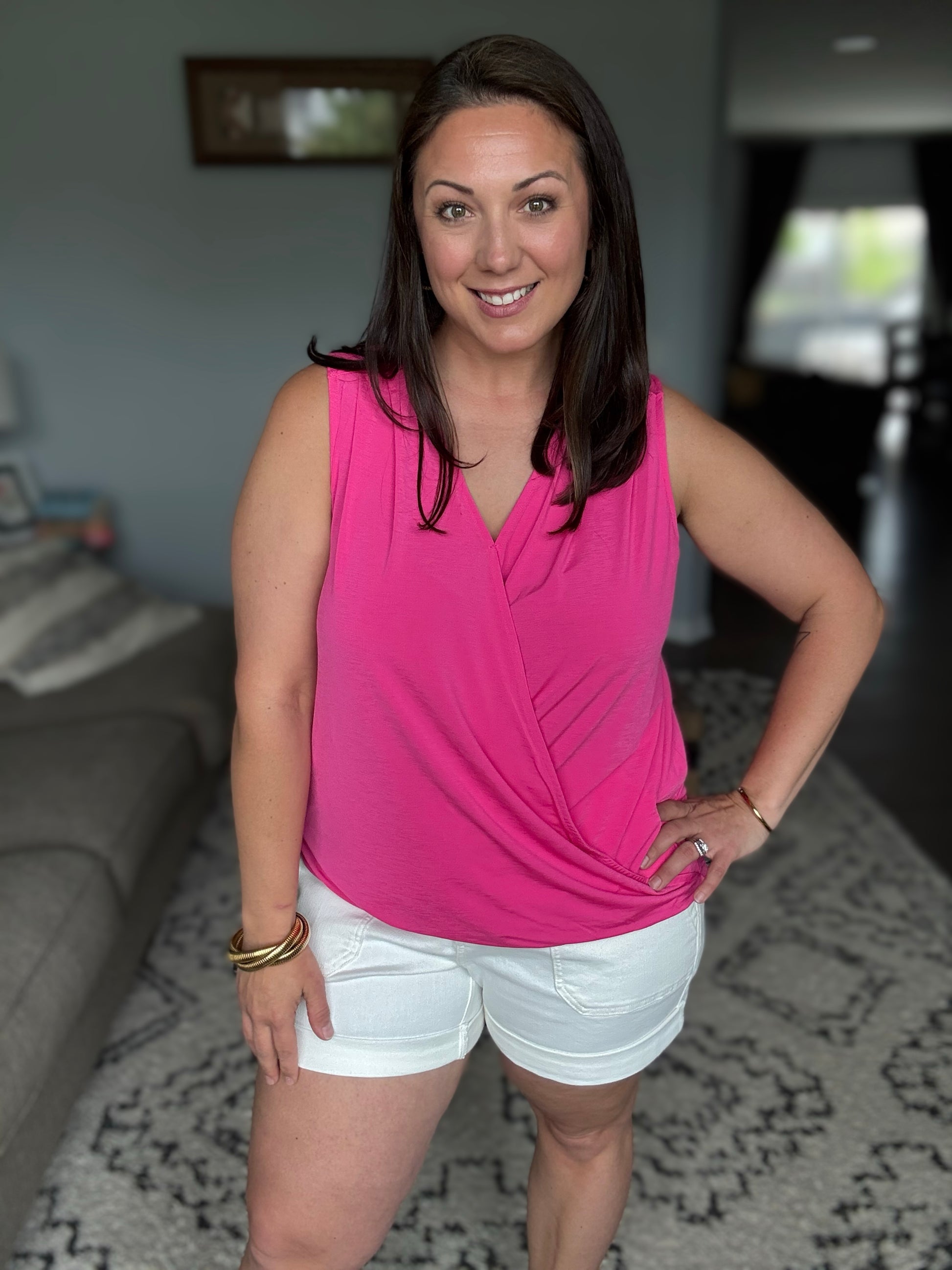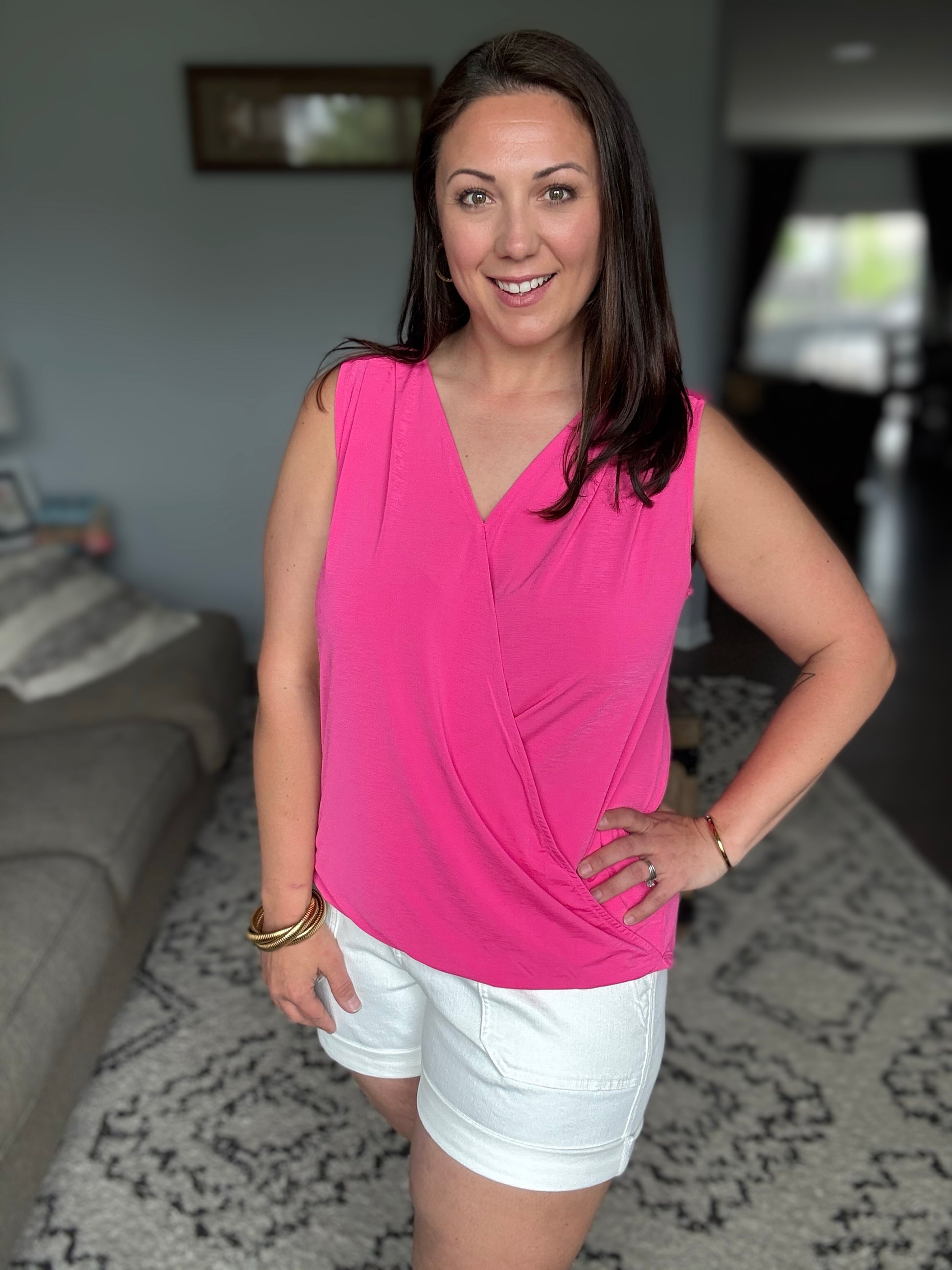 This wrinkle-free sleeveless top is your go-to for polished style, seamlessly taking you from your 9-to-5 to night out and beyond. Whether paired with heels or flats, the surplice detail brings a touch of elegance to your everyday wardrobe. Pair with any of the Magic pants to complete the look!