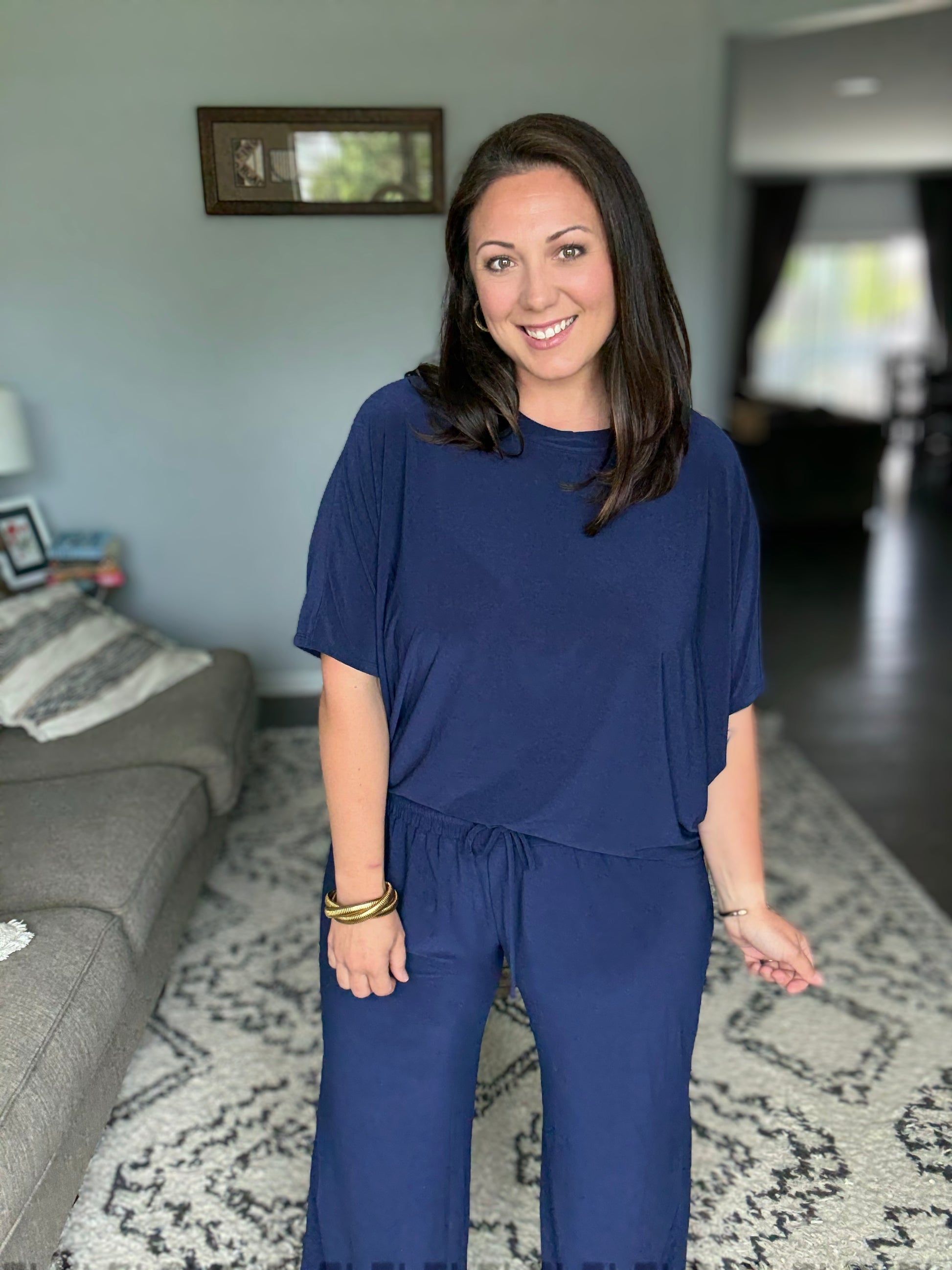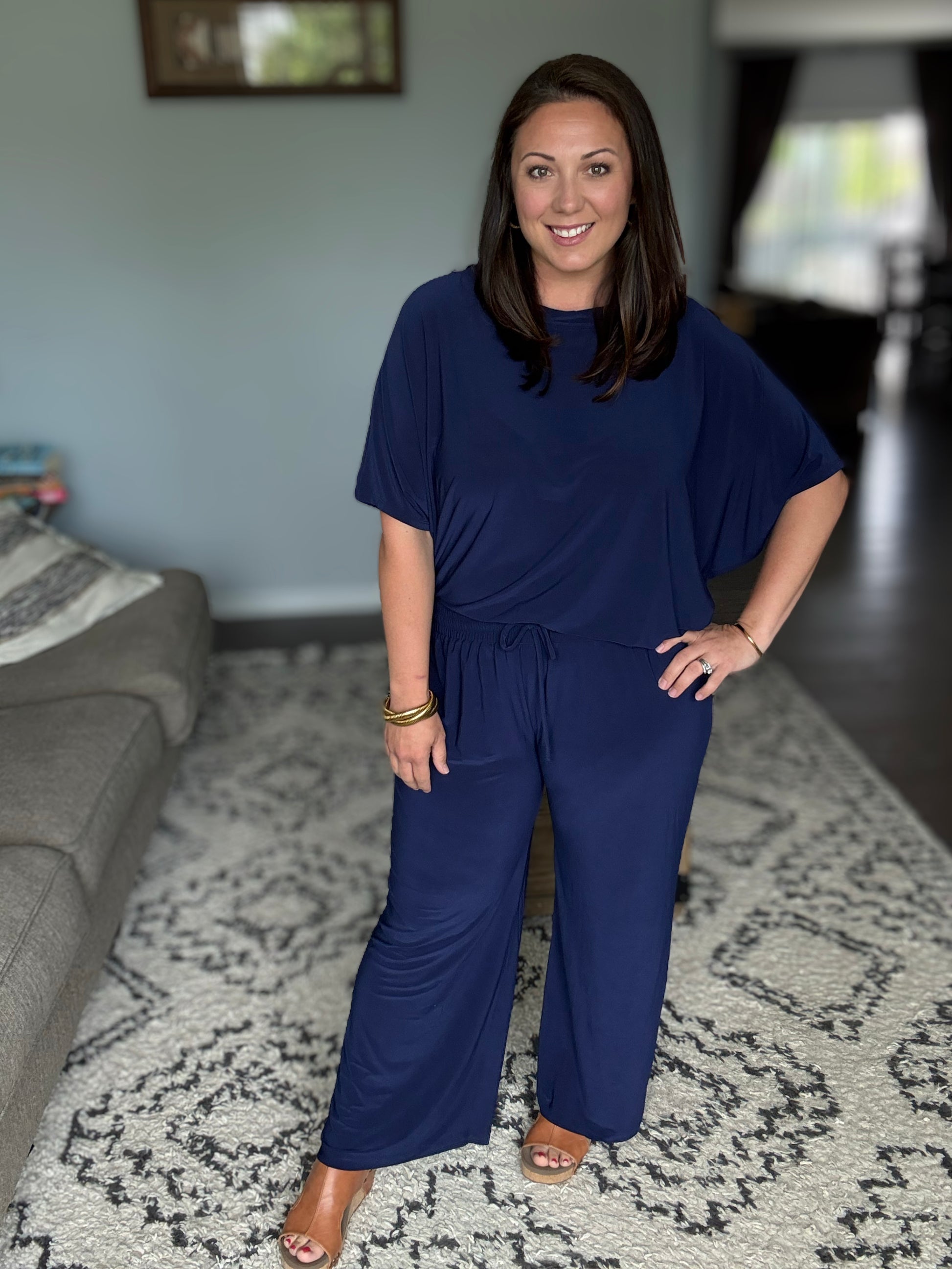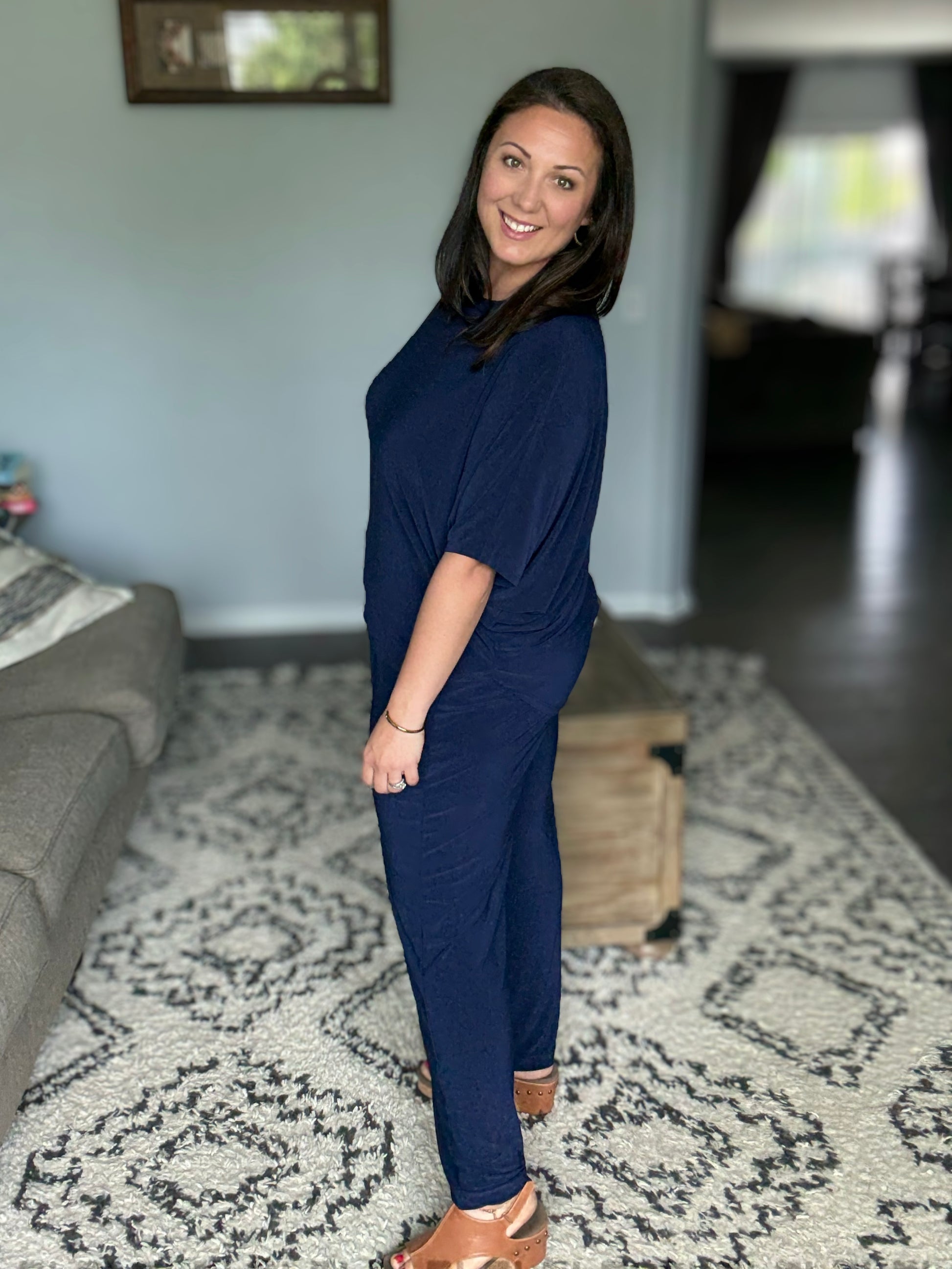 Amanda is wearing a Large in Navy