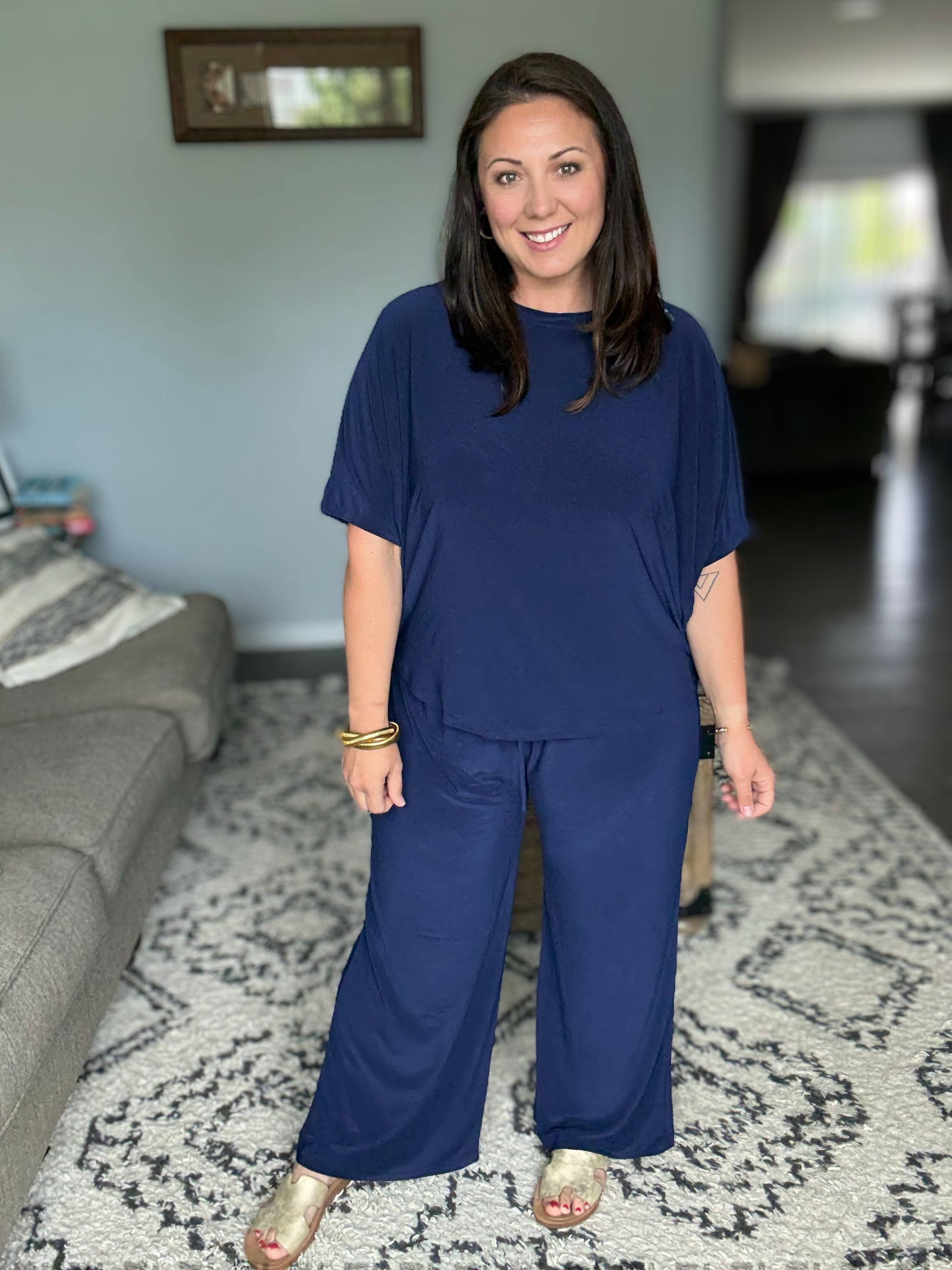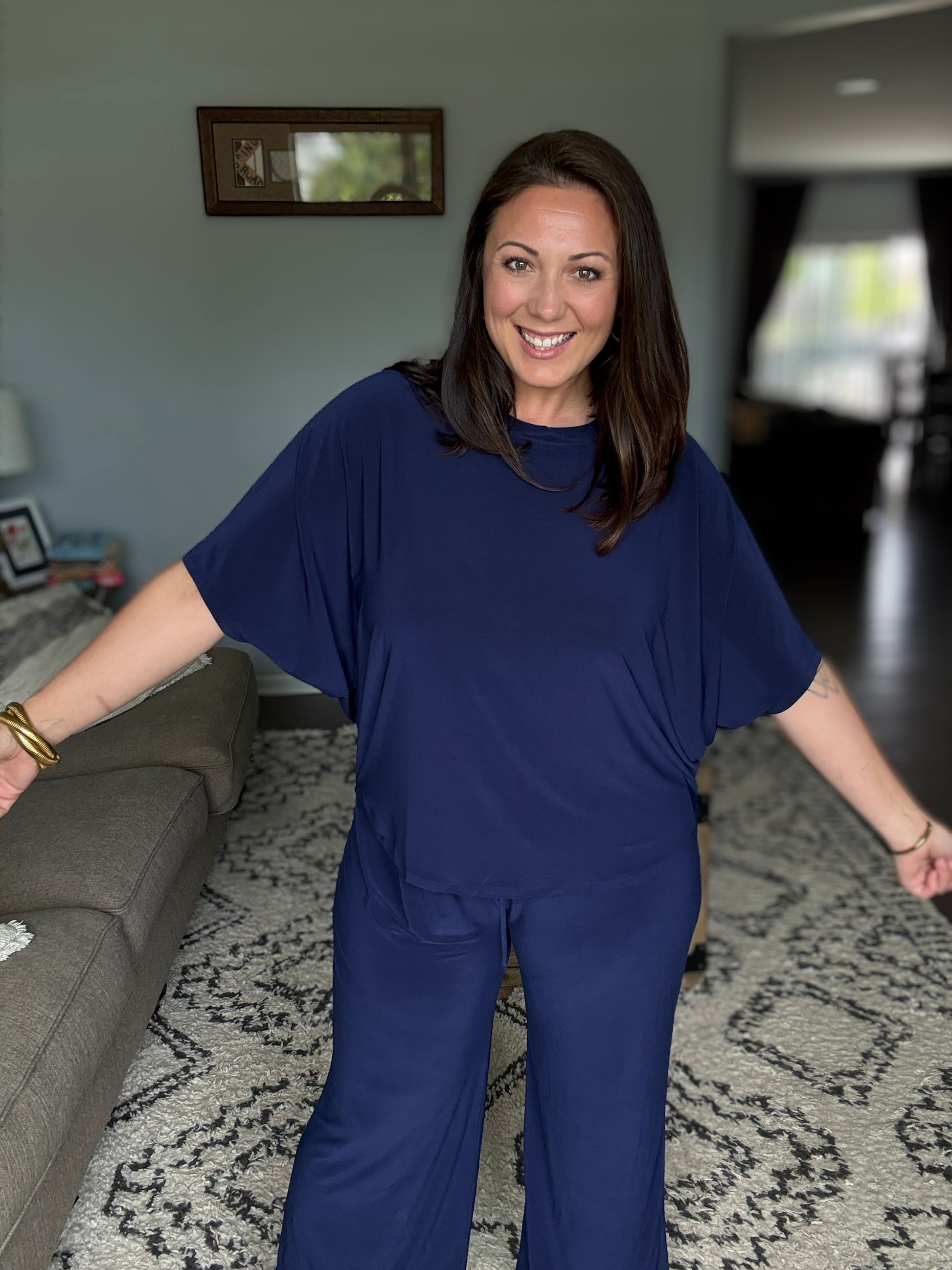 This wrinkle-free two-piece set combines chic style with modern functionality. Featuring a poncho-like dolman sleeve tunic top and flowy, wide-leg pants, it’s the ultimate blend of relaxed charm and travel-ready ease. The elastic waistband offers a comfortable, flattering fit with adjustable drawstring, making it THE go-to outfit from take-off to landing. Wear together or pair separately with other tops and bottoms for endless outfit options.