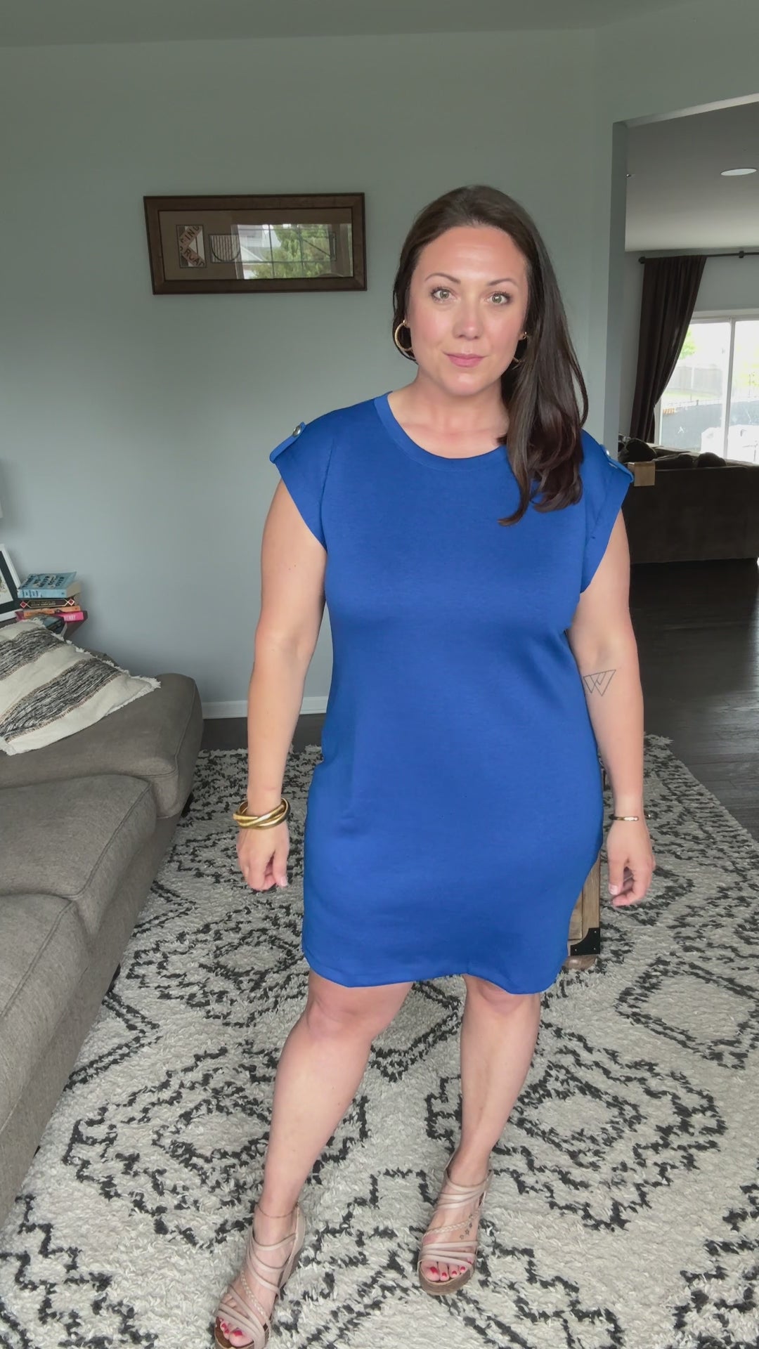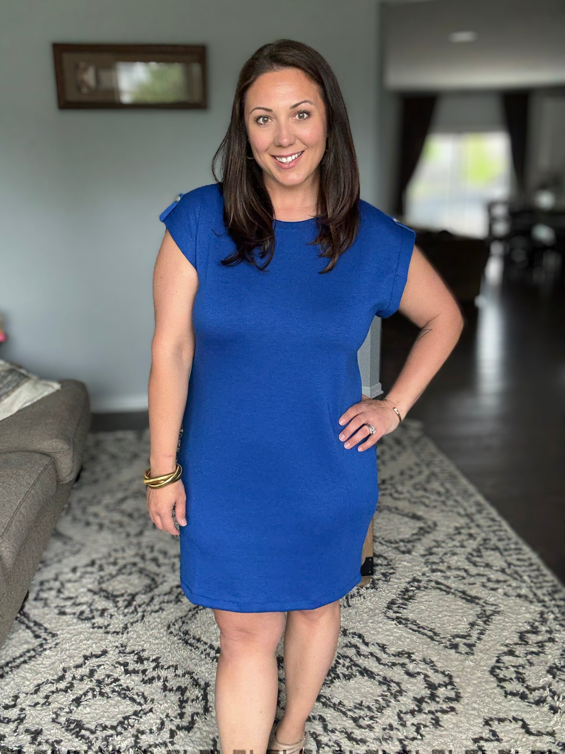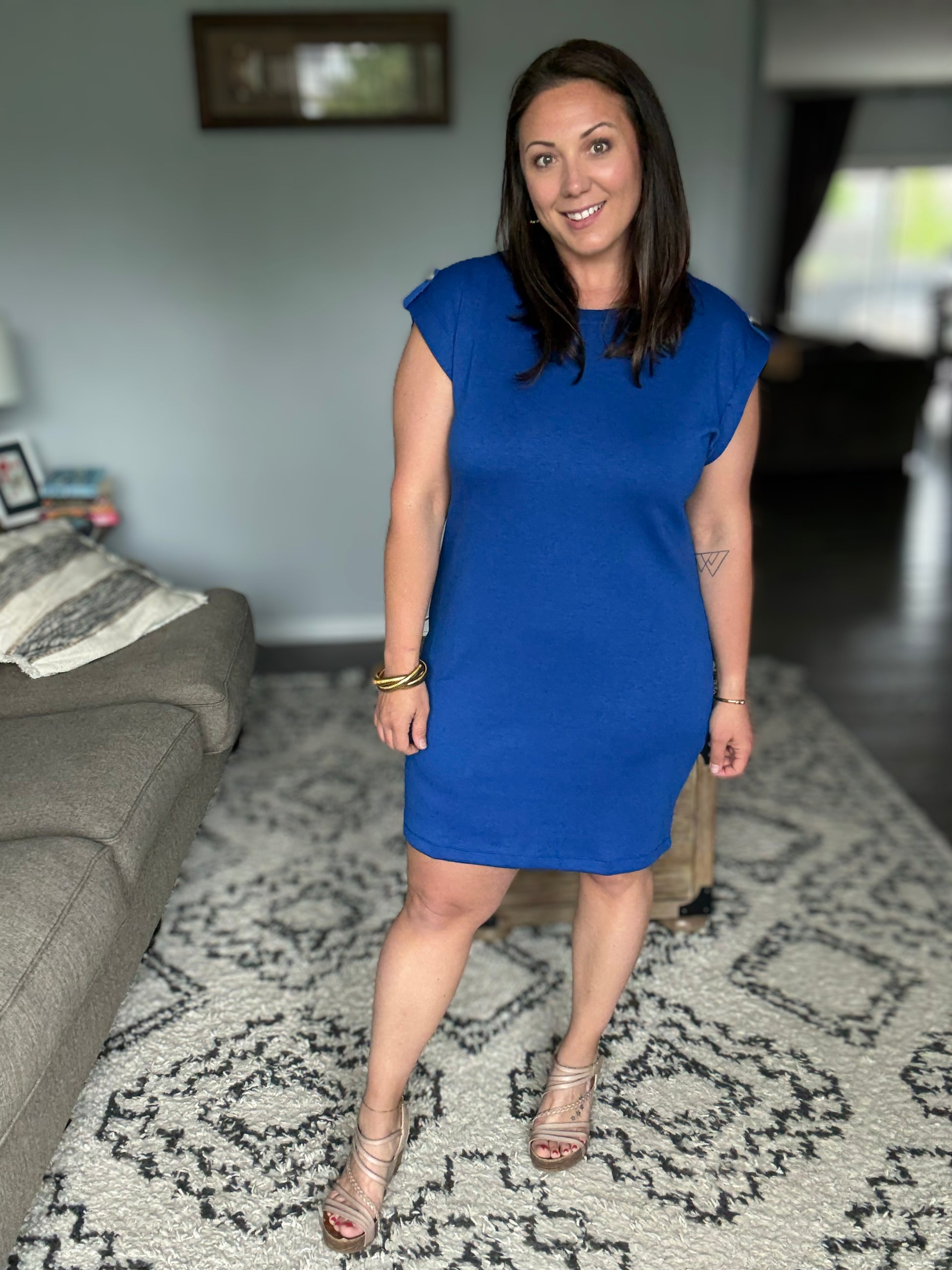 Amanda is wearing an XL in royal blue for more of a sheath dress fit and could do 1X for a looser type fit.