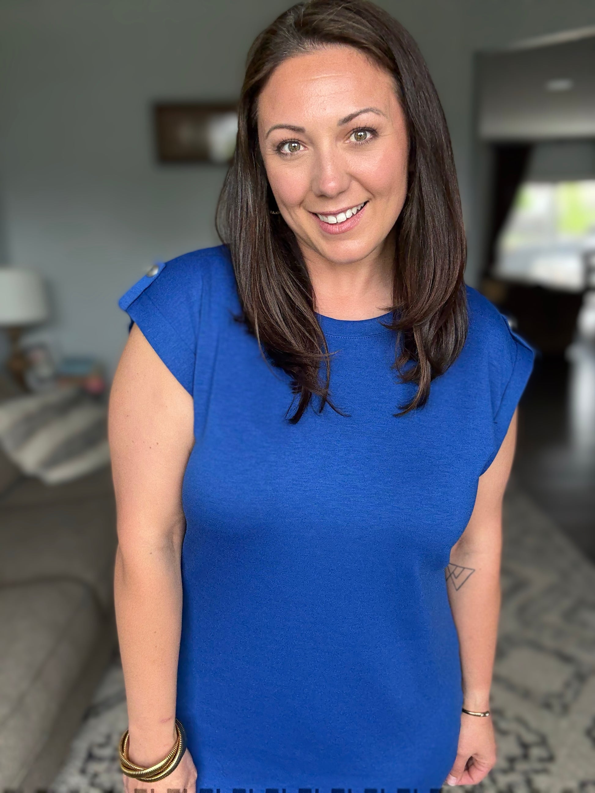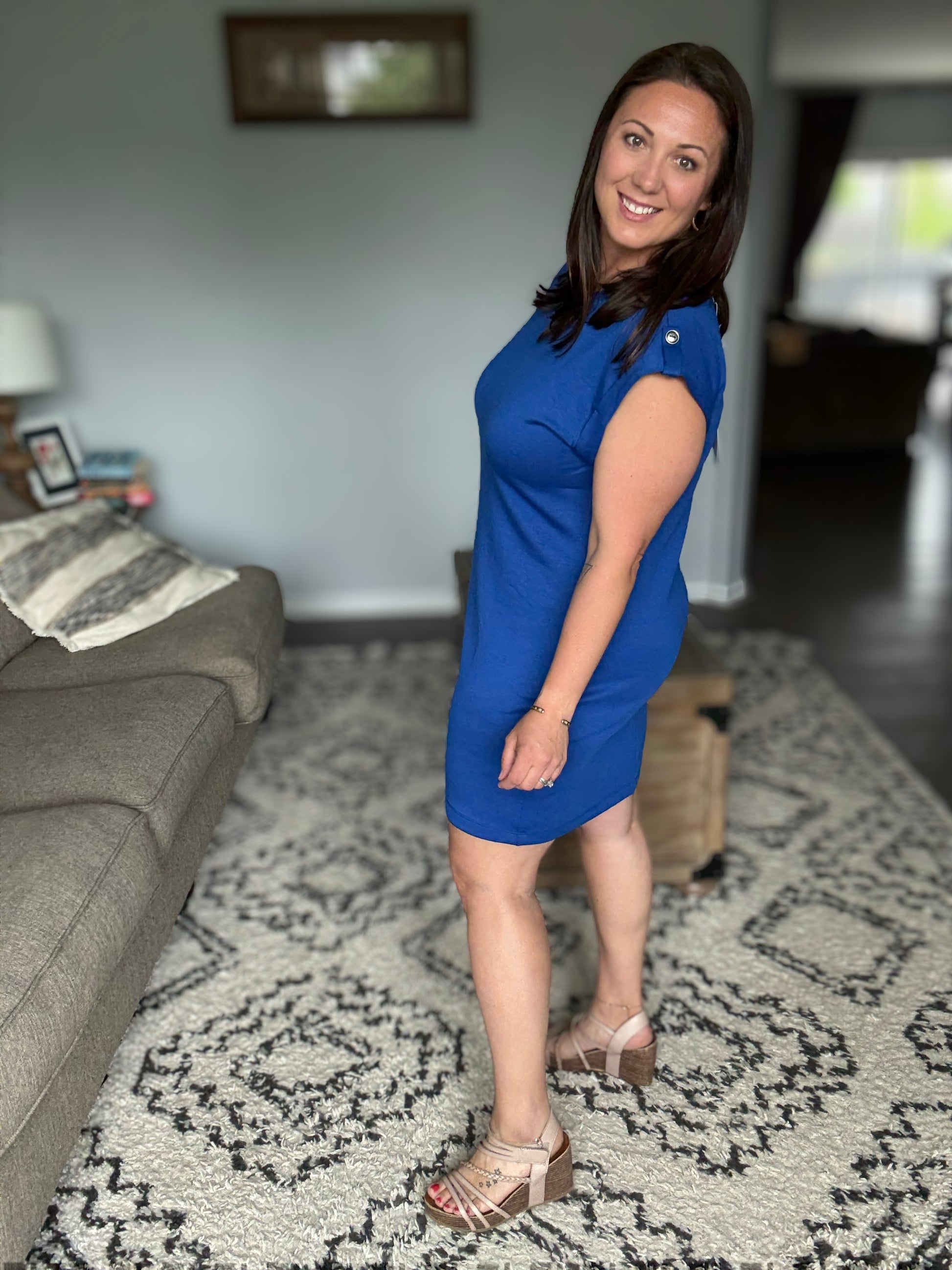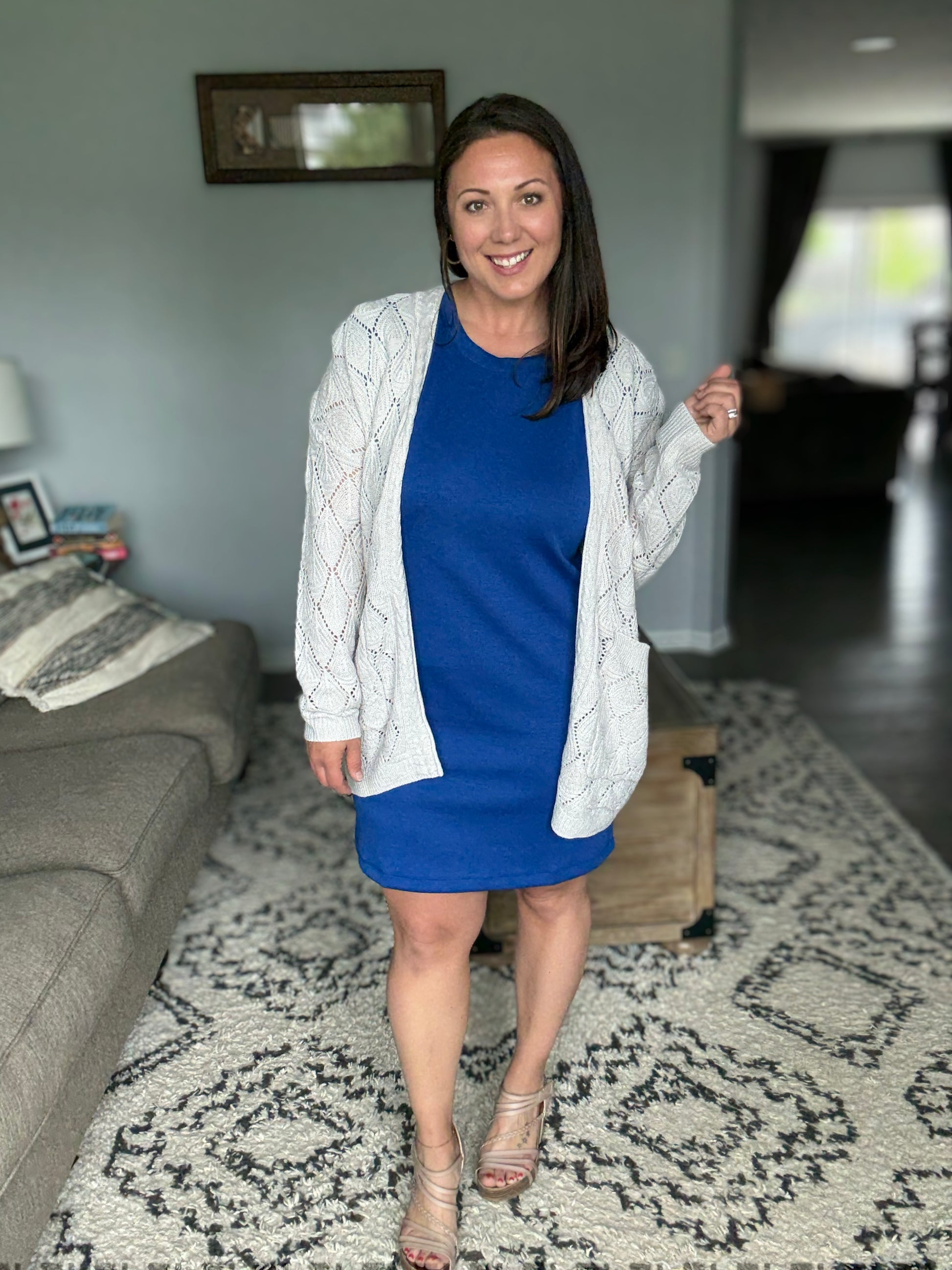 Amanda is wearing an XL in royal blue for more of a sheath dress fit and could do 1X for a looser type fit.