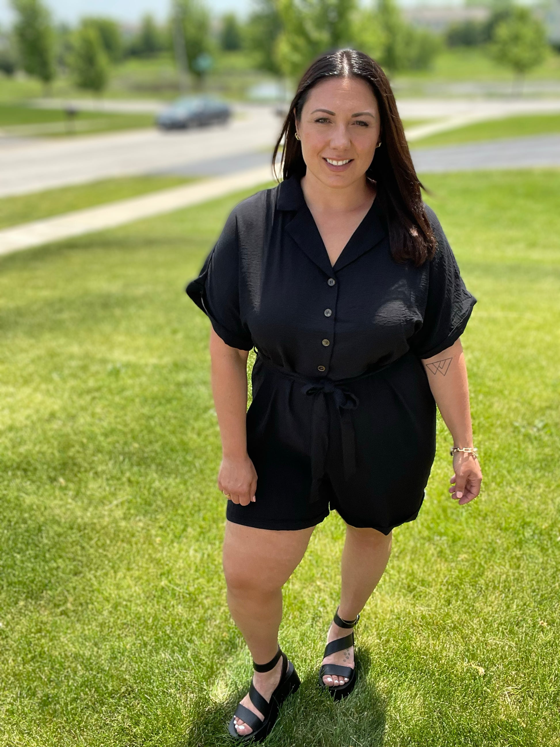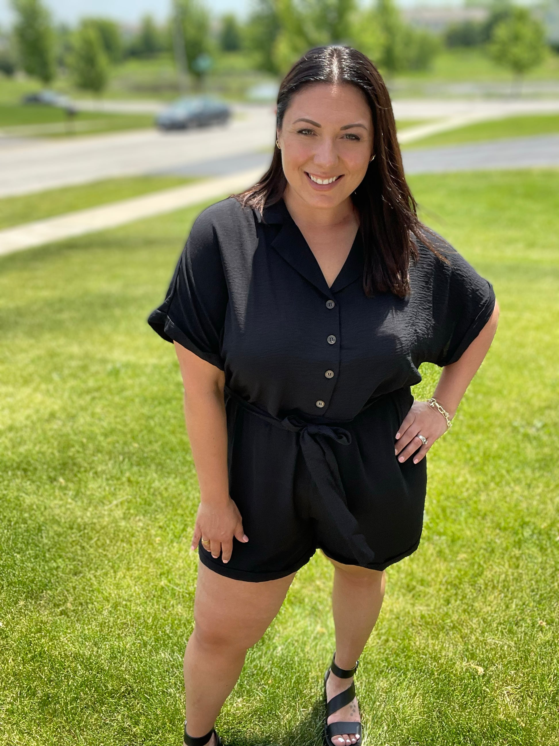 Stay cool and carefree in our Don't Worry 'Bout a Thing V-Neck Romper. Made with crinkle woven fabric, this romper features a collared neckline, dolman sleeves, and tacked cuffs. The front button closure and functional tie at the waist add a touch of practicality to this stylish piece. Perfect for any summer day!