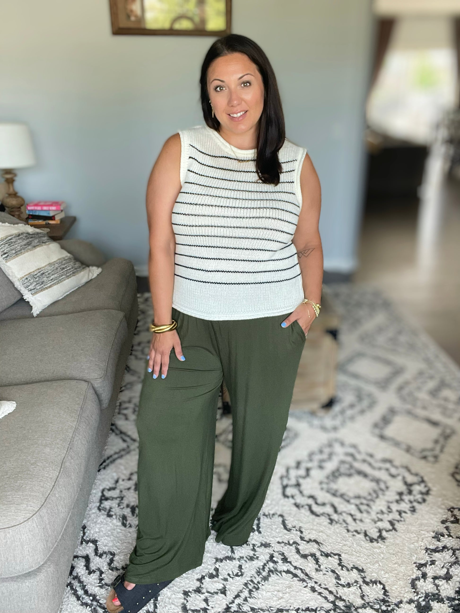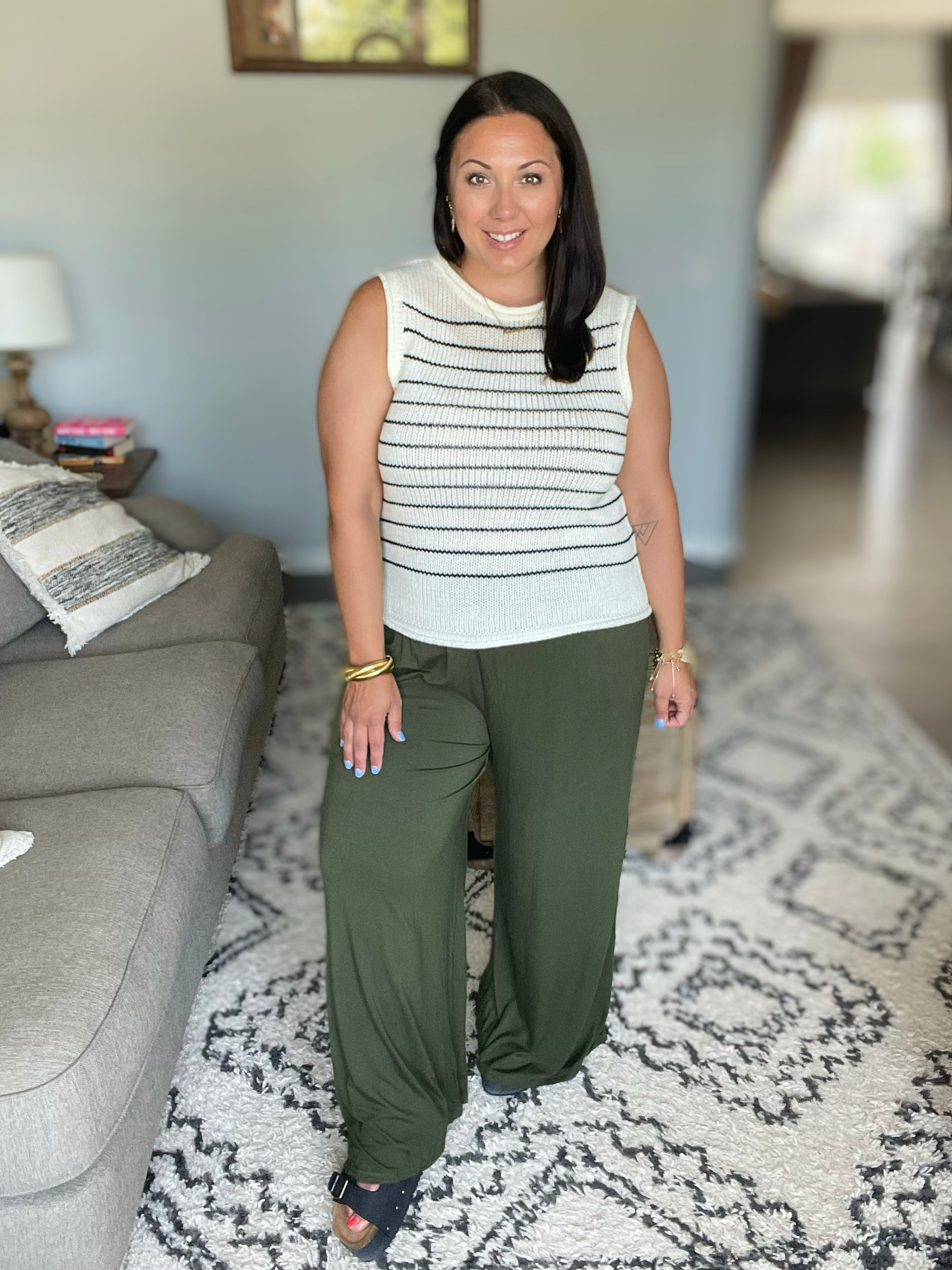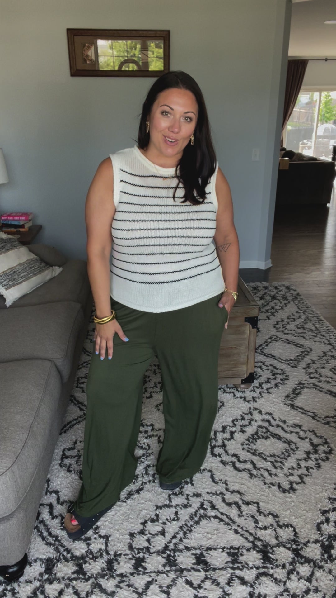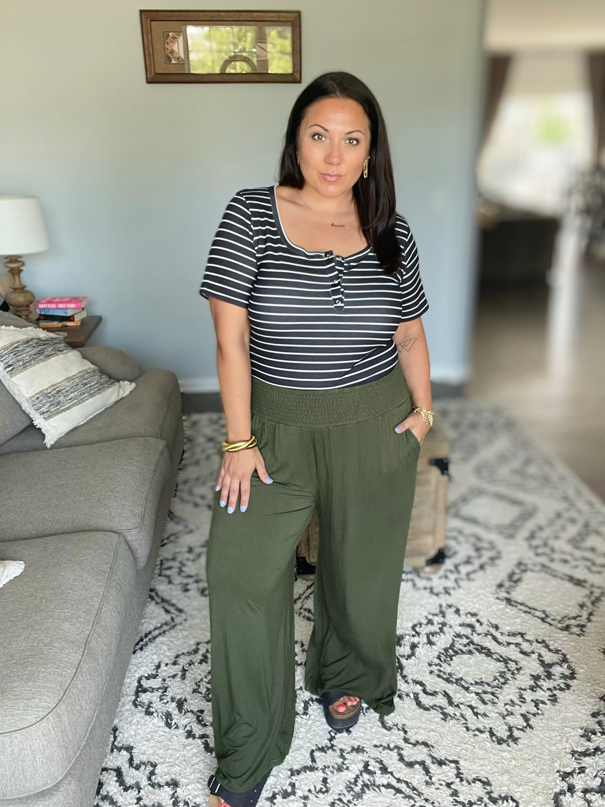Cute and comfy smocked waist, wide leg pants that are so versatile. Can easily dress up or down. But feel like your wearing pajamas the whole time!