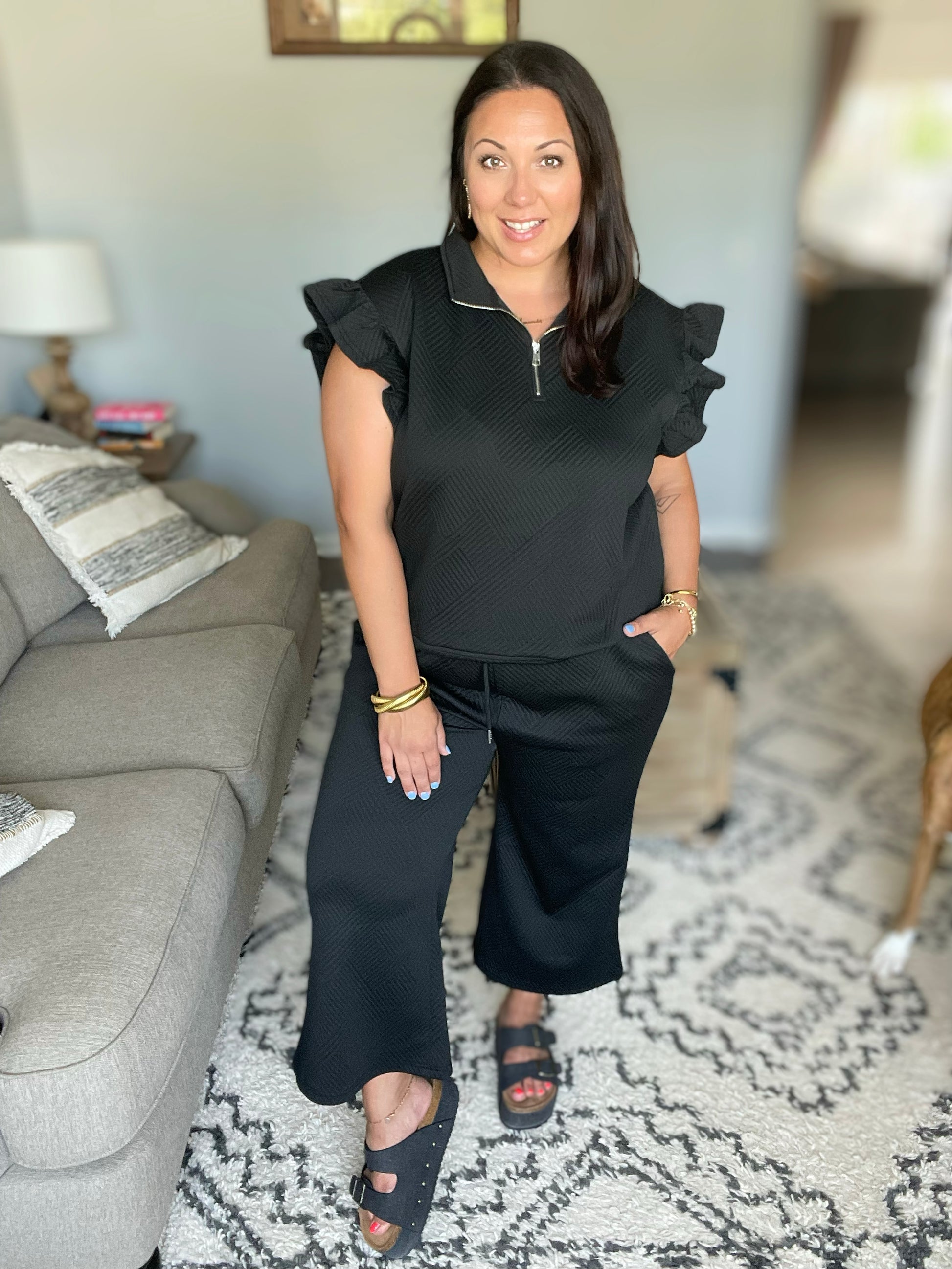 Textured Ruffle Short Sleeve Top and Cropped Wide Leg Pants Set in 12 Colors