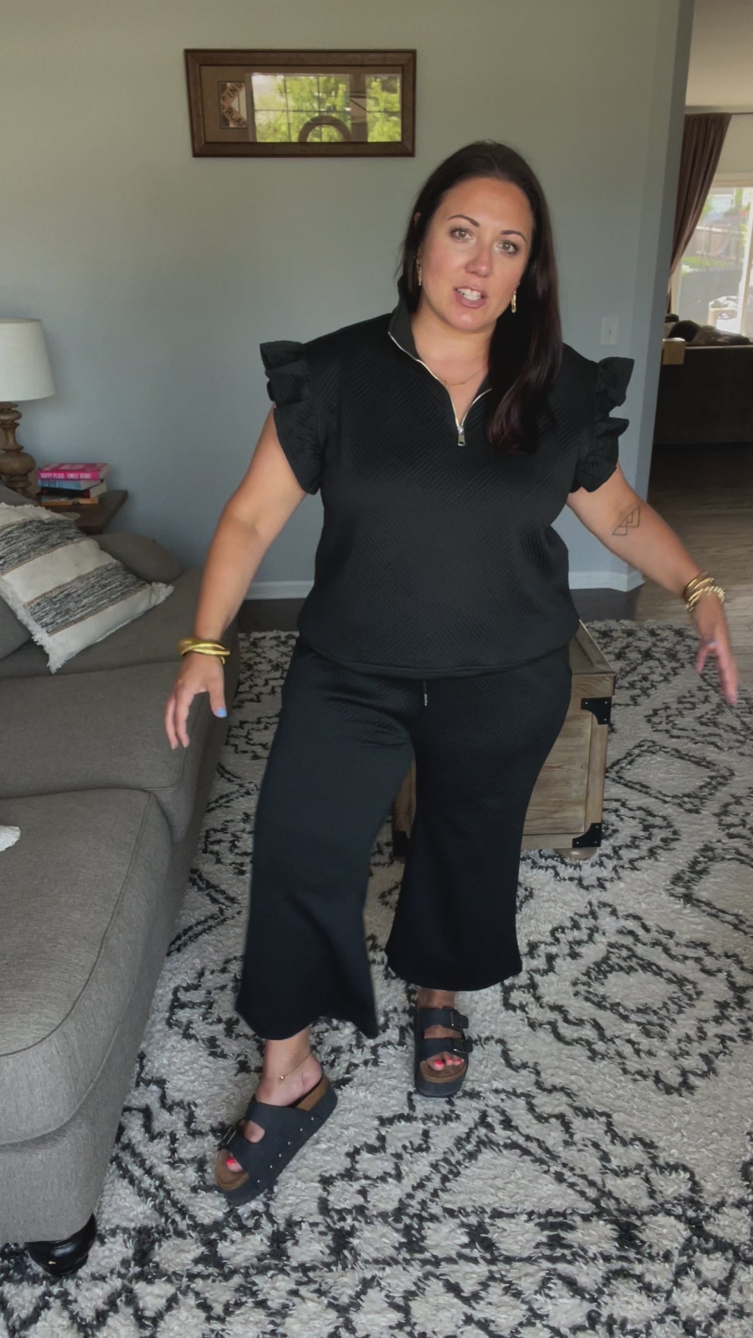 TOP: dropped shoulder with ruffled flounce sleeve, wide collar on a quarter zip. Banded hem around the bottom. Wear it out or tucked under for a more bubble look. Of course, you can wear this with any other bottoms you'd prefer.Relaxed fit in your true top size.BOTTOMS: The cropped pants are wide leg with a slight glare and are marshmallow soft on the booty (and everywhere else), super comfy in the waistband and have pockets. The drawstring is functioning. - Material composition: 97% polyester, 3% spandex