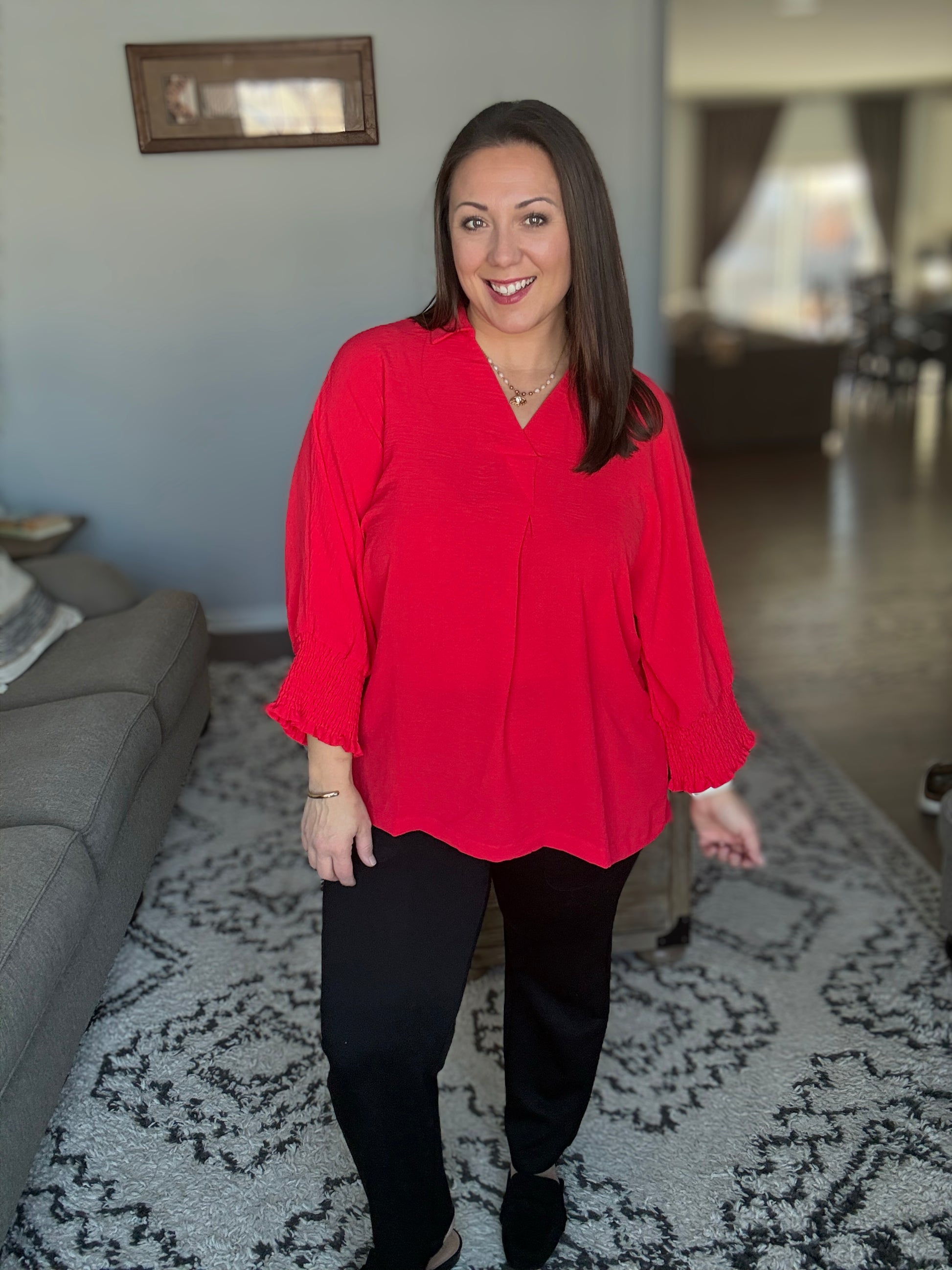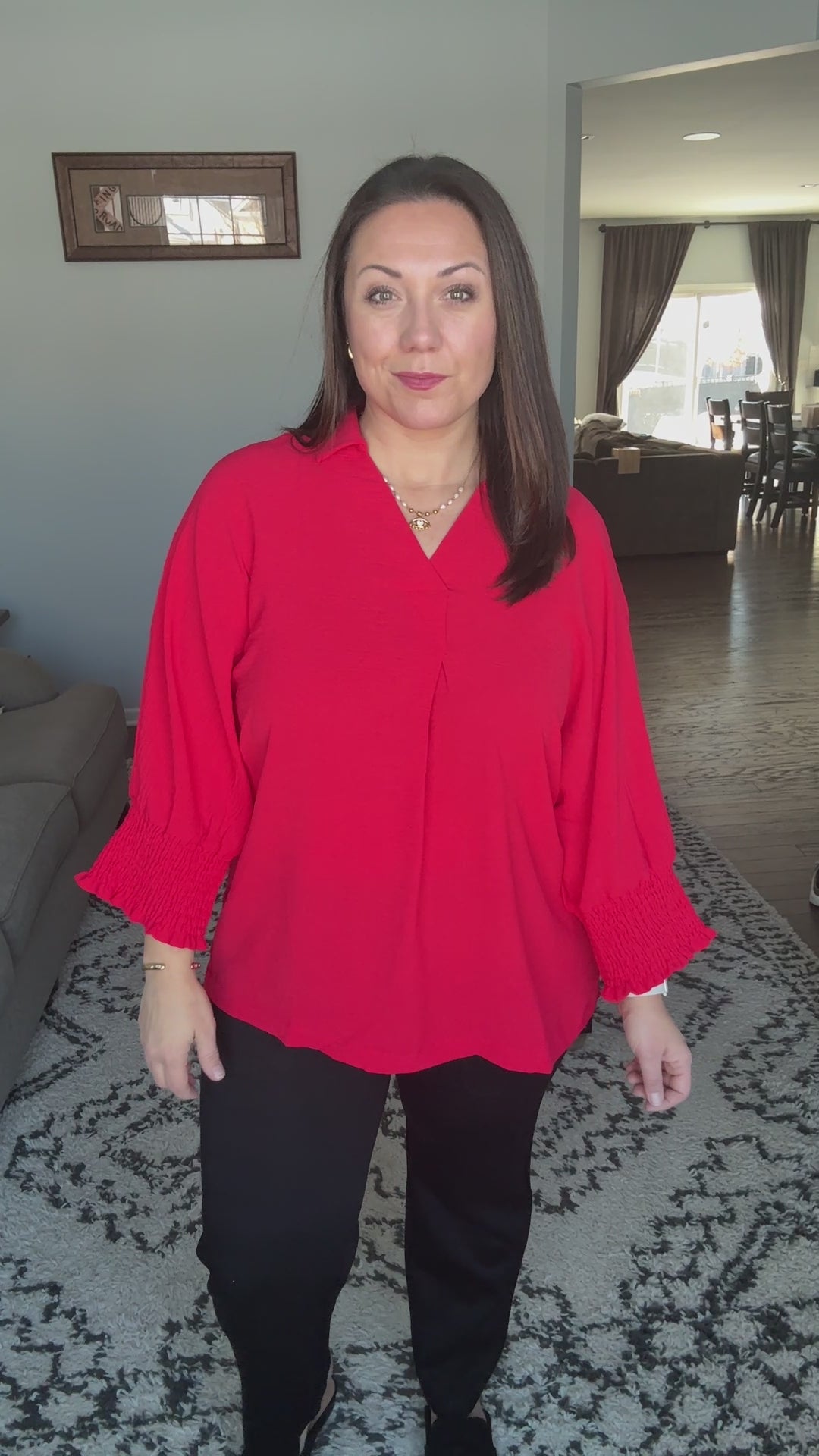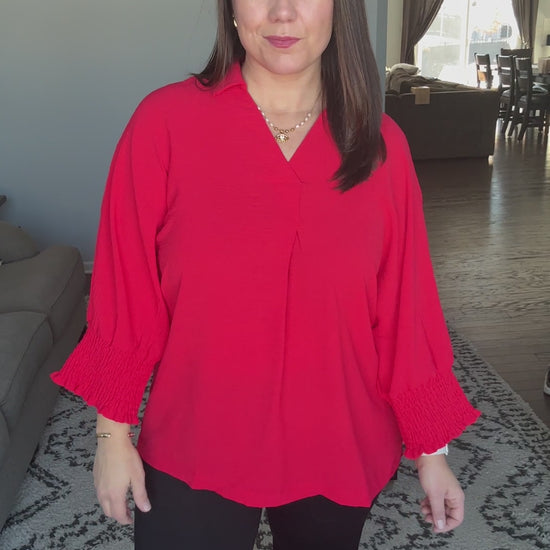 The Easy Essence V-Neck Oversized Tunic Top brings carefree elegance to your closet with its textured crinkle woven fabric that moves beautifully without any stretch. The flattering V-neckline pairs perfectly with three-quarter sleeves topped with exaggerated smocked cuffs for a fun, fashion-forward vibe. Built with structured fabric that keeps its shape, this oversized tunic works beautifully layered or worn on its own. A playful staple that feels as good as it looks.