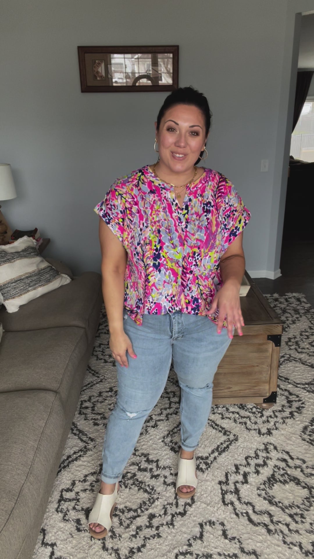 Amanda is wearing a 14W and is a nice, relaxed fit. Could have sized down to 15 for more locked and loaded.