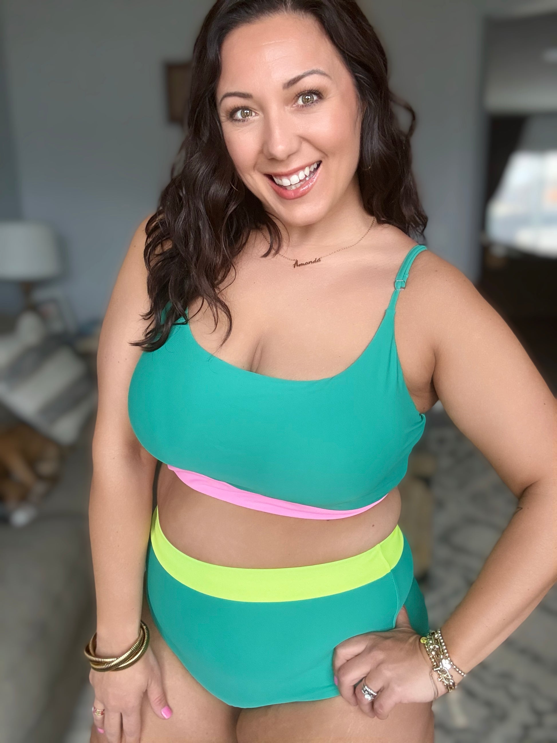 Splash into summer with the Fiji Color Block Swim Top! This playful top features a square neckline and adjustable spaghetti straps adorned with silver hardware for a touch of shine. The built-in shelf bra and removable cups provide comfortable support, while the color block design of green and neon pink adds a fun and stylish touch. Don't miss out on this banded hemline beauty!
