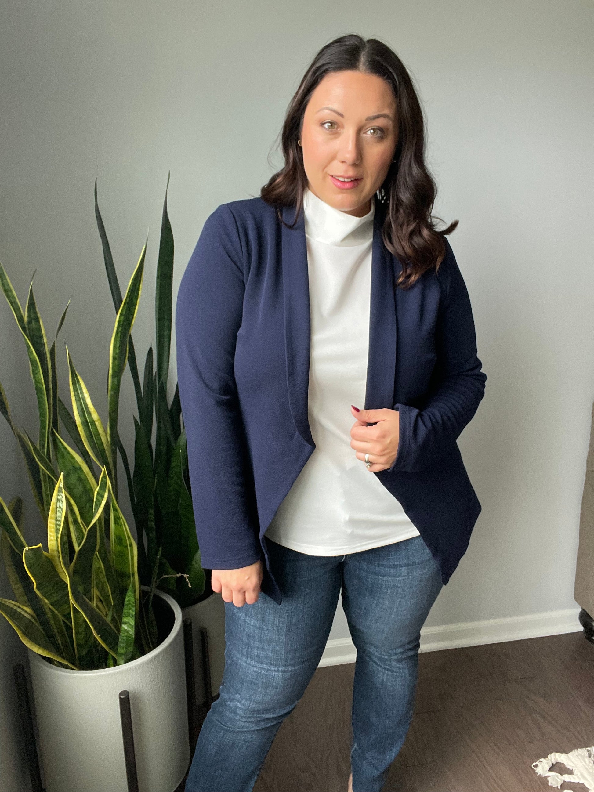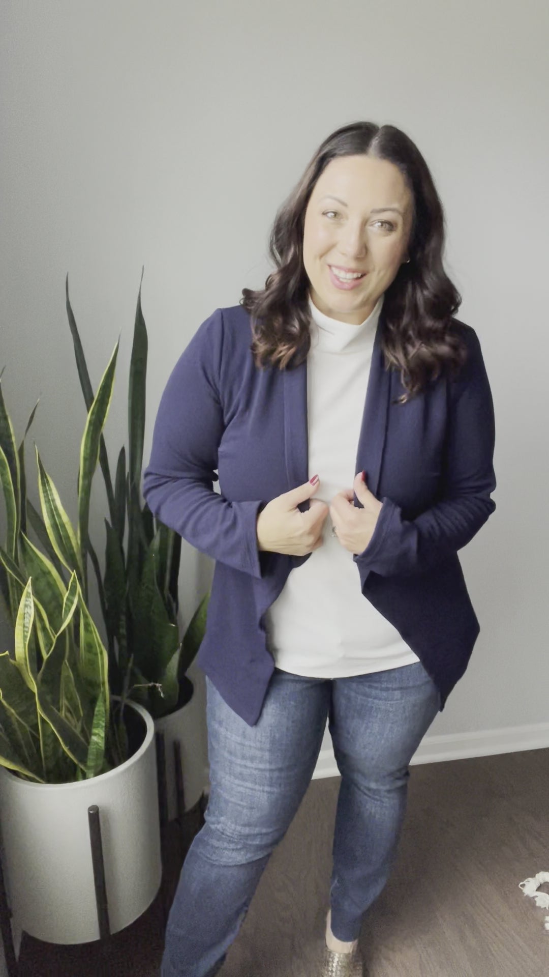 This Fitted Blazer is essential for any occasion! Crafted from a textured stretchy knit, its contour seaming and fold-over collar create a flattering shape. An open front allows you to show off your favorite outfit while the sophisticated navy hue will make you look poised and confident for any event.