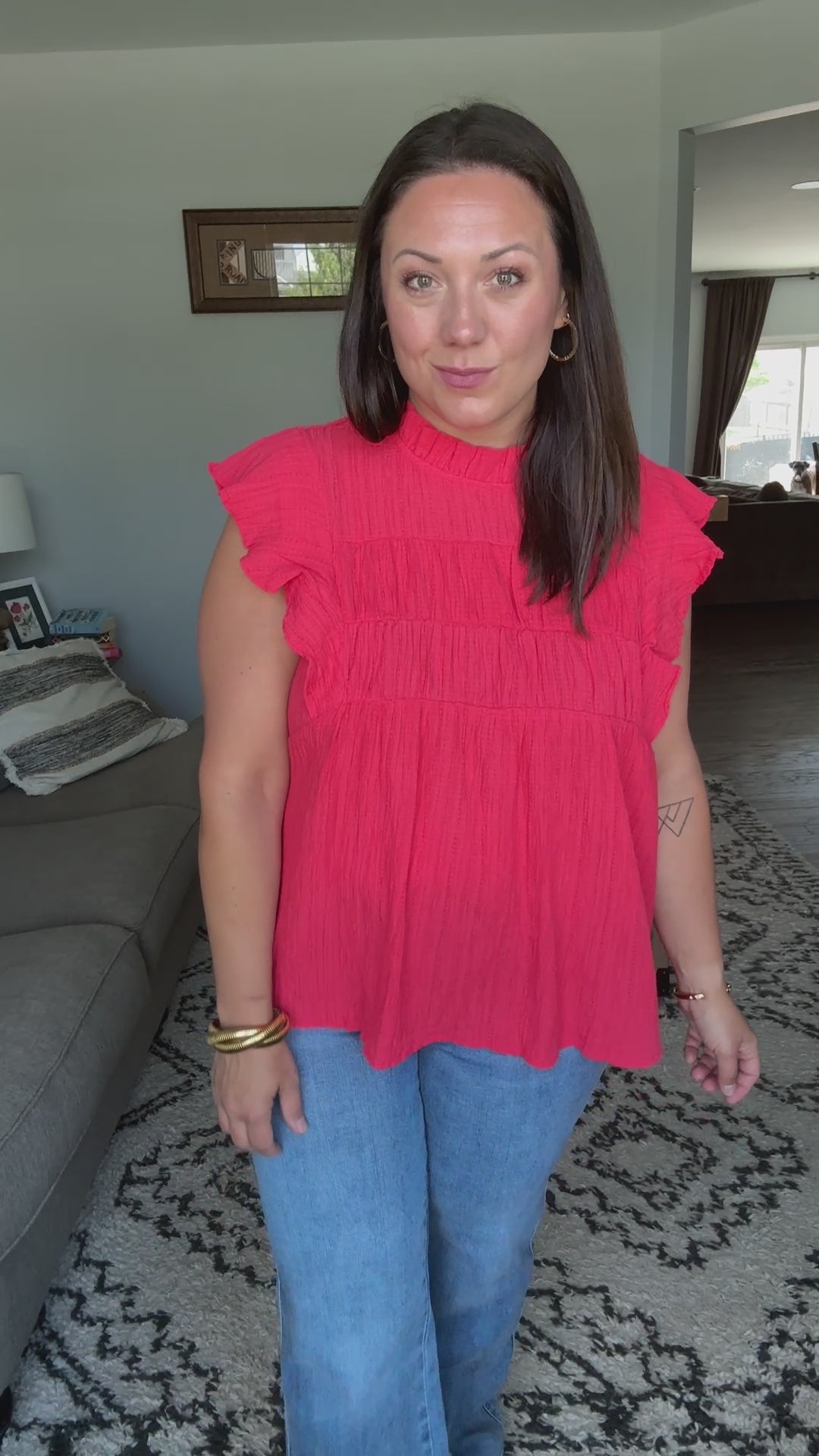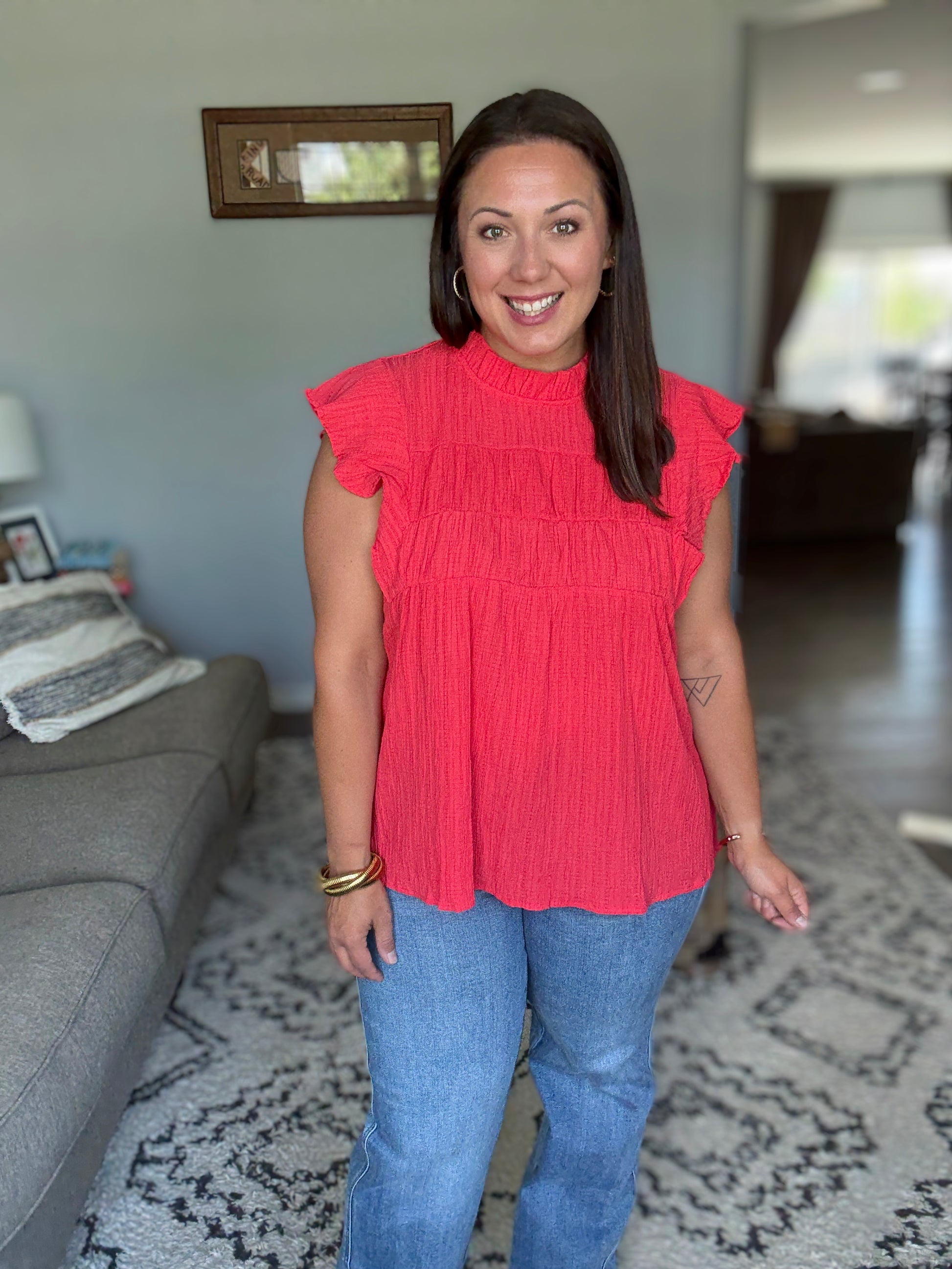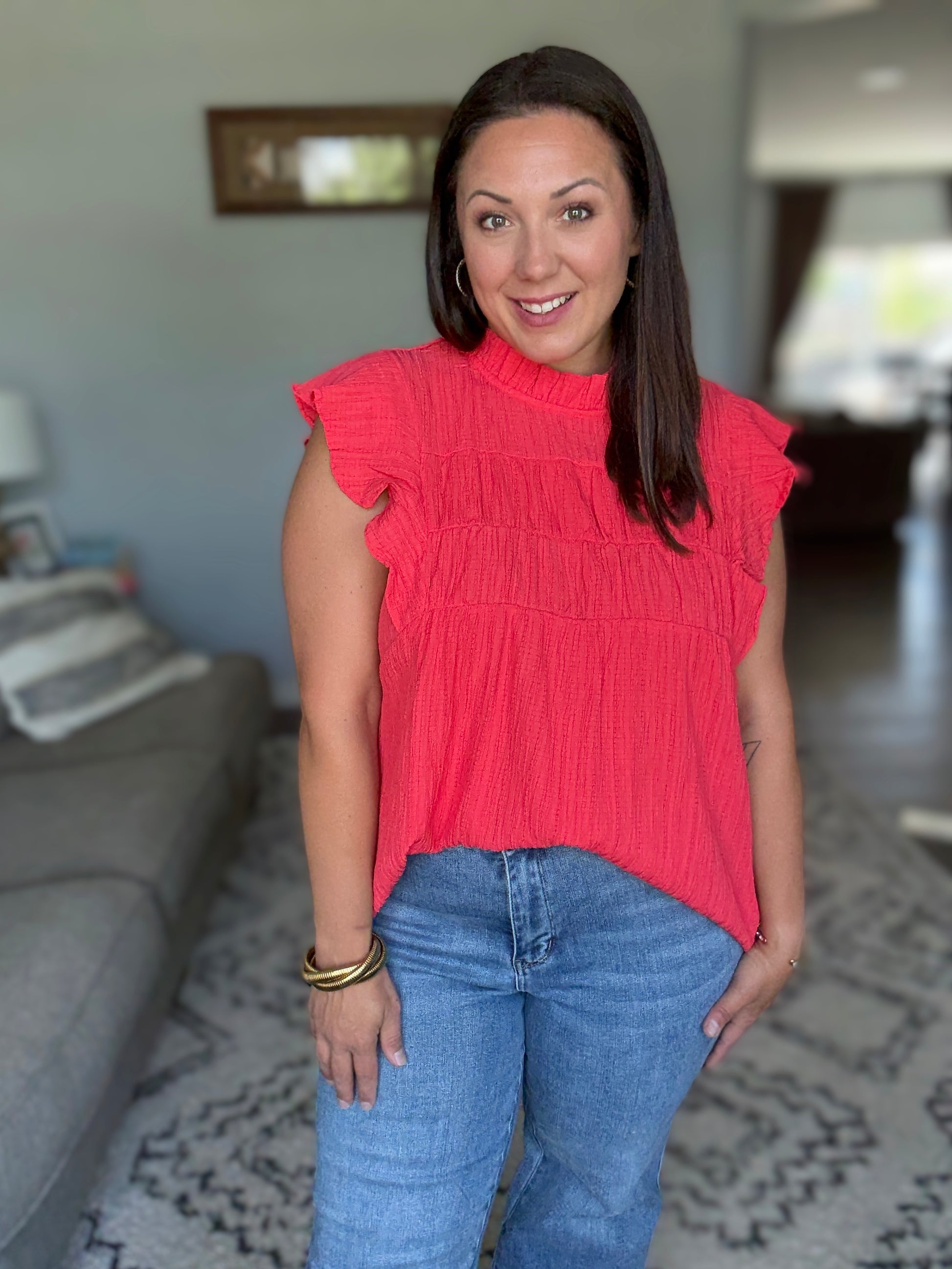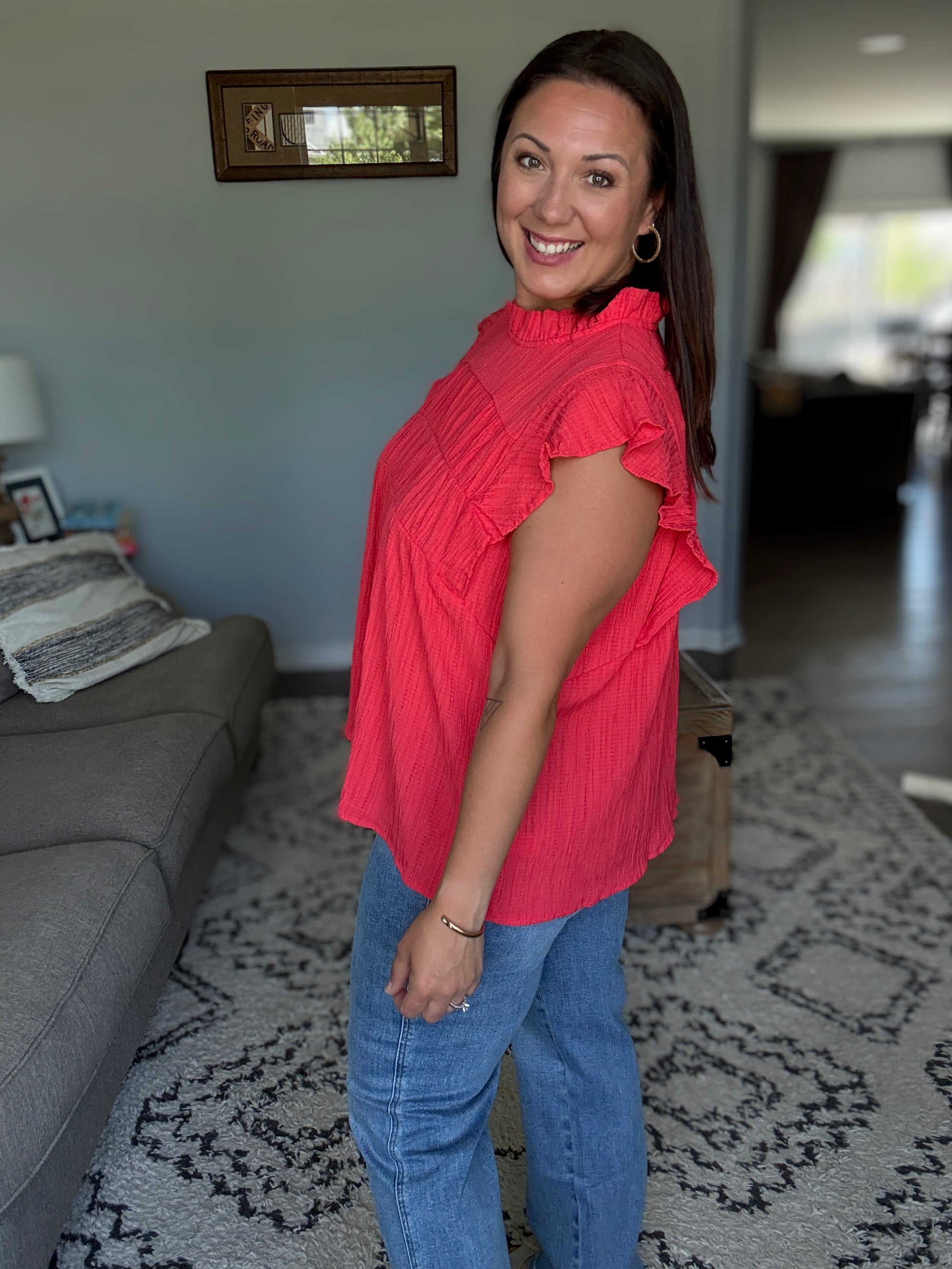 This blouse is sure to make a statement with its high neckline, ruffle details, and flutter sleeves. Made of a mid-stretch textured knit, it offers both comfort and style. With a playful coral color and keyhole closure, it's the perfect addition to any wardrobe. Float your way through the day in style!