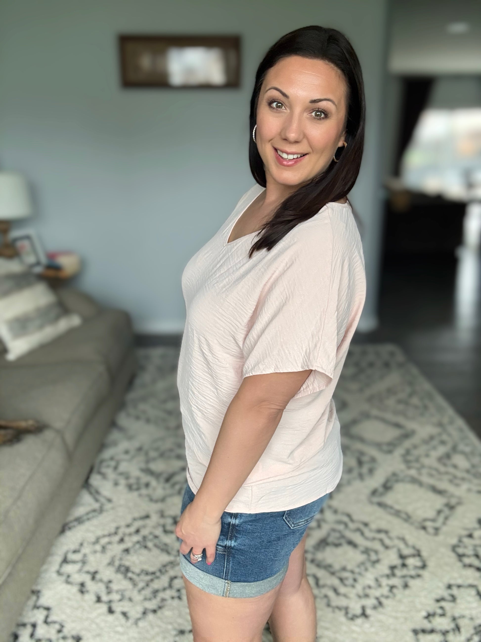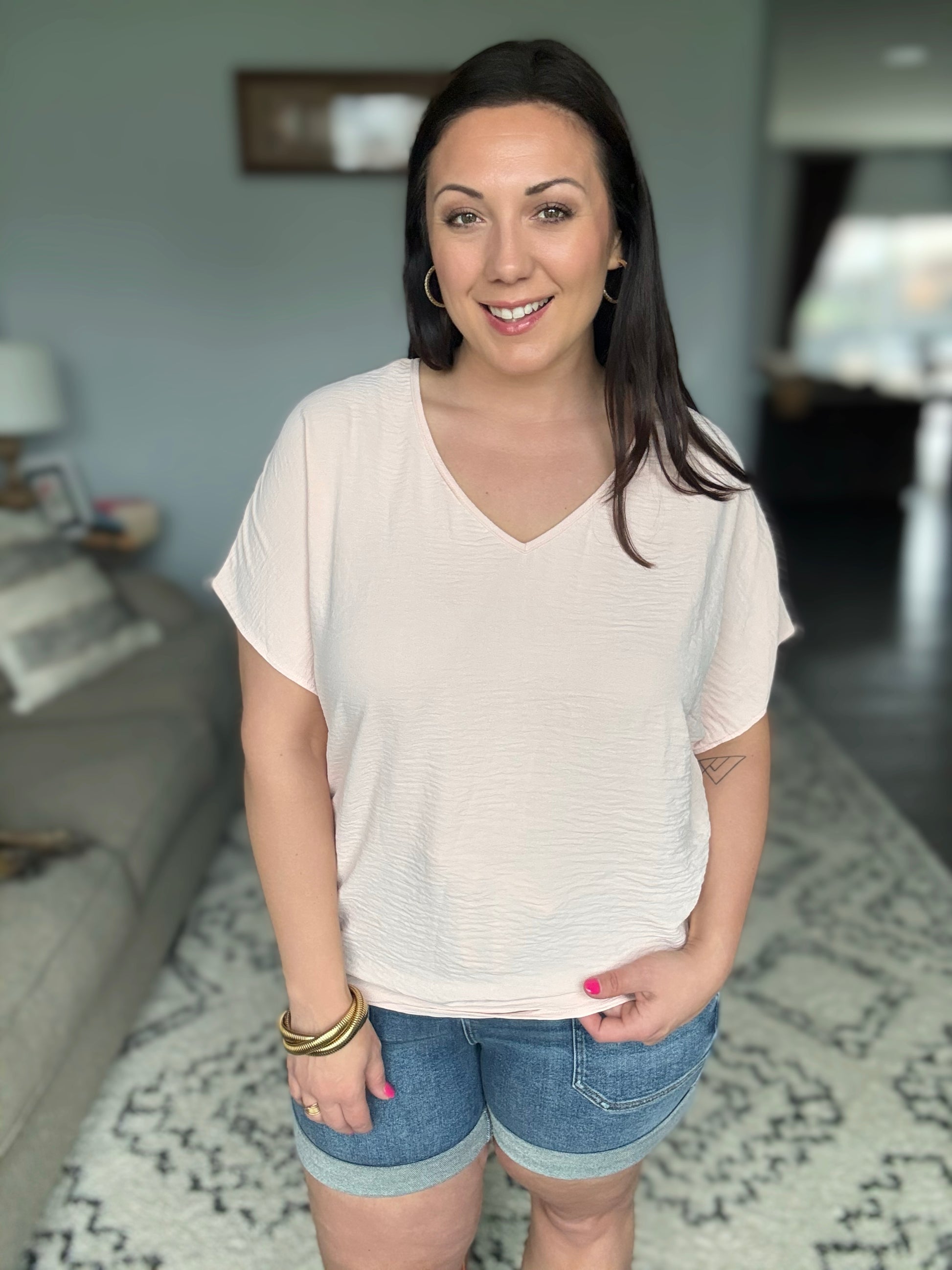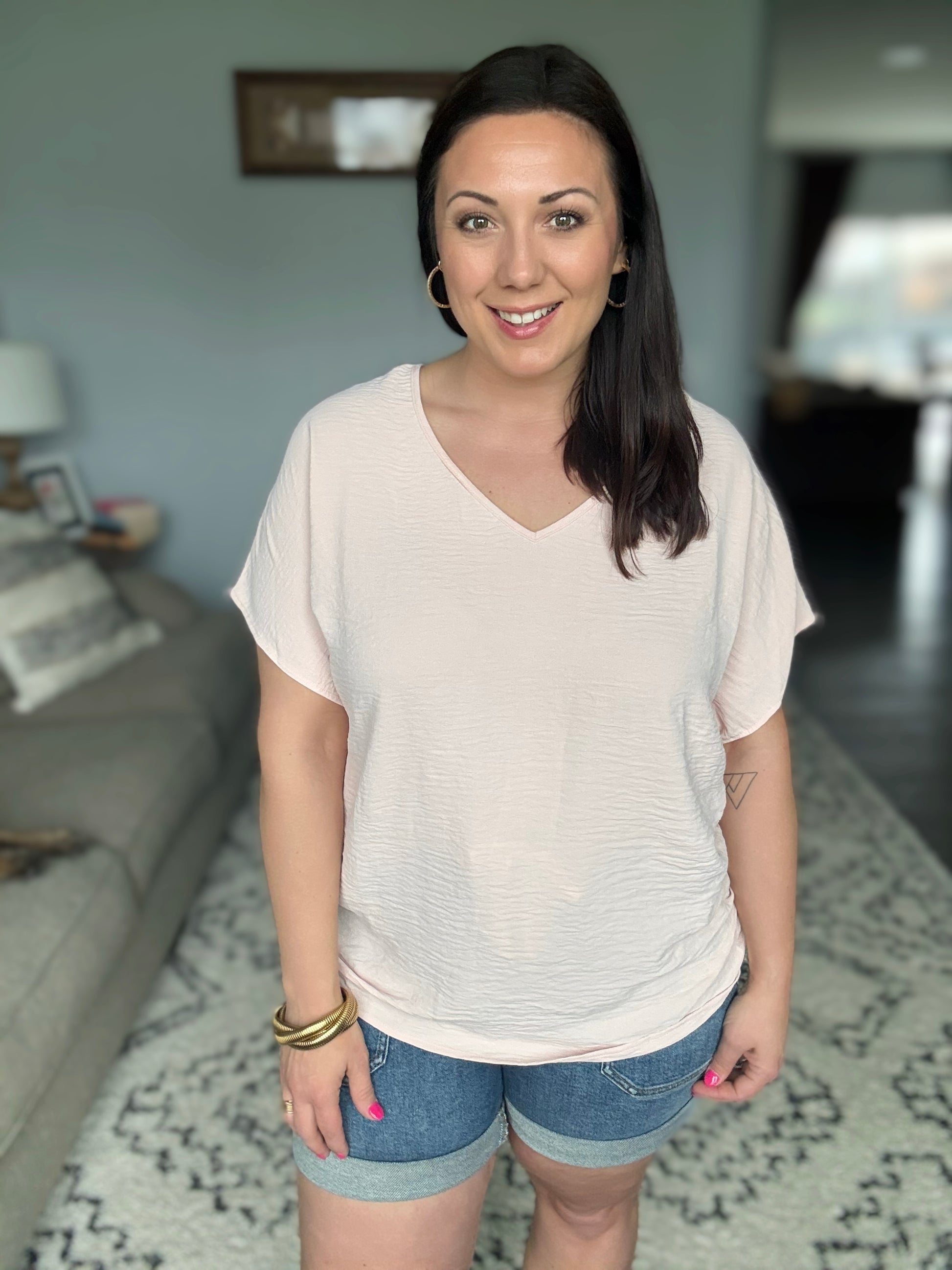 Our Frequently Asked Questions V-Neck Top in blush is the perfect blend of comfort and style. The textured woven fabric allows for airflow, providing ultimate breathability, while the v-neckline and relaxed fit make it flattering for any body type. A great pick for casual everyday wear.