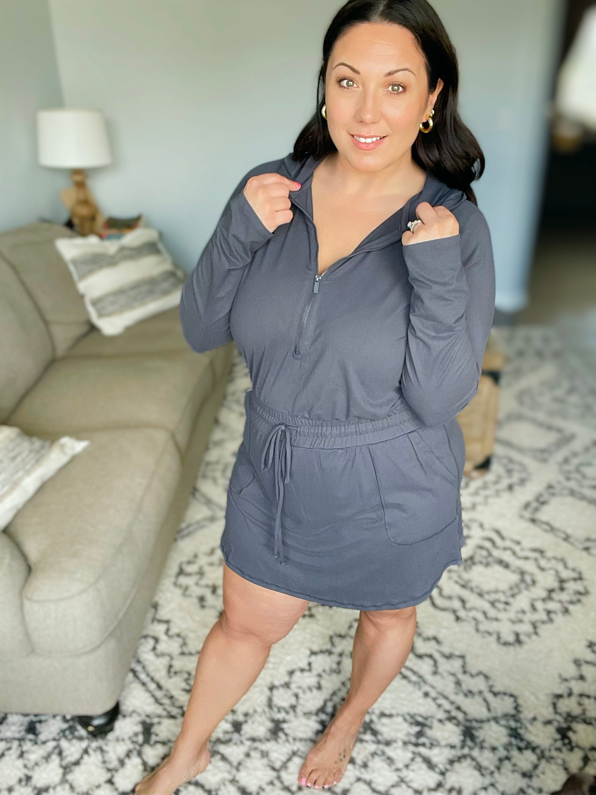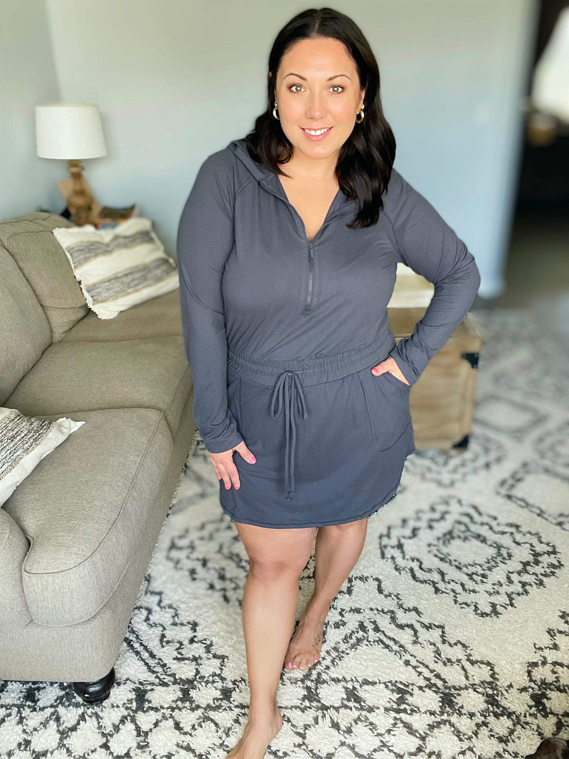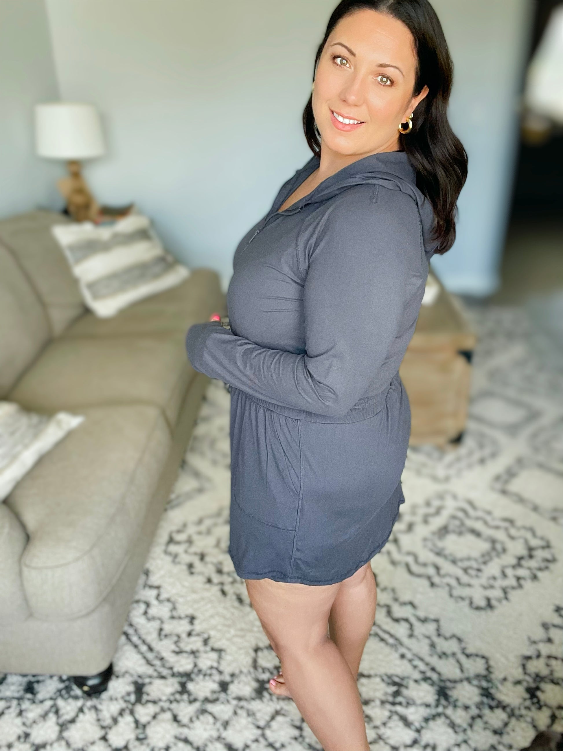 Getting Out Long Sleeve Hoodie Romper in Charcoal