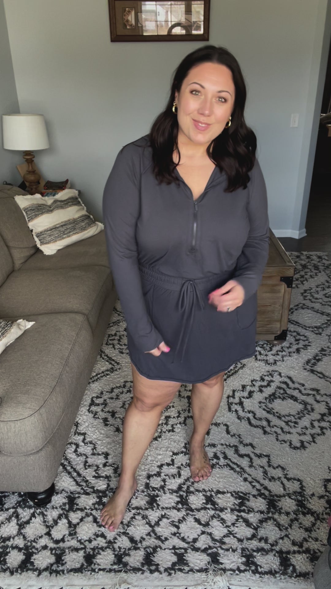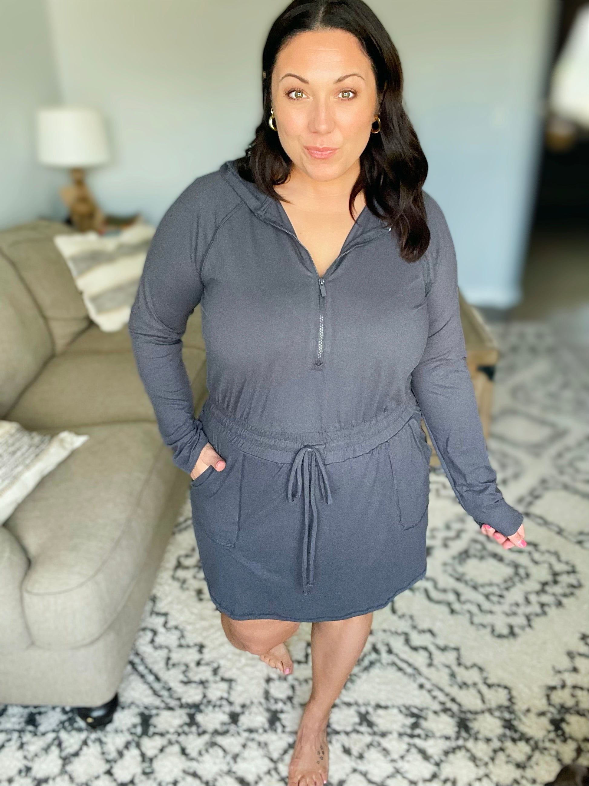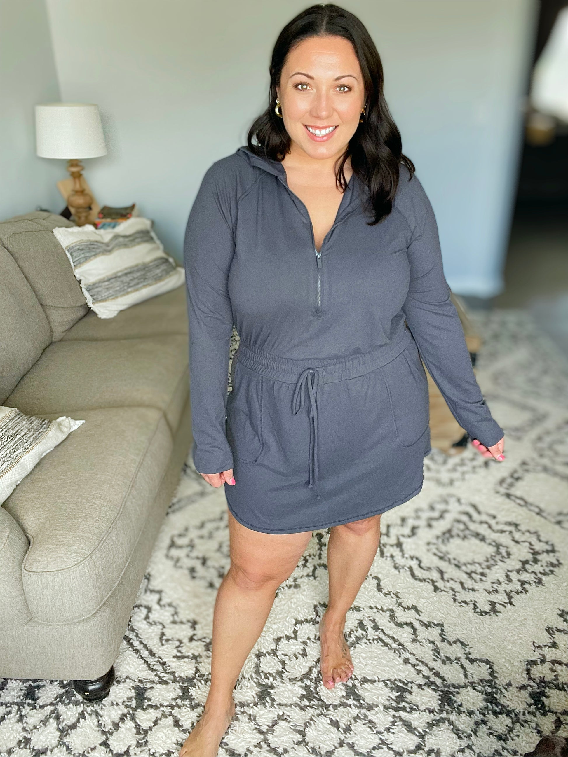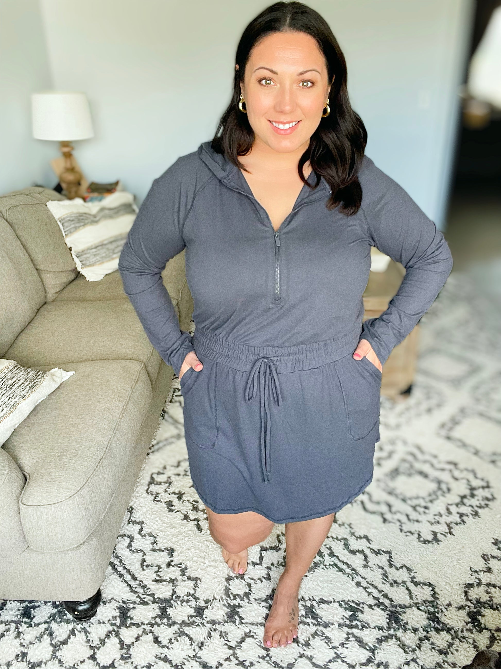 Getting Out Long Sleeve Hoodie Romper in Charcoal