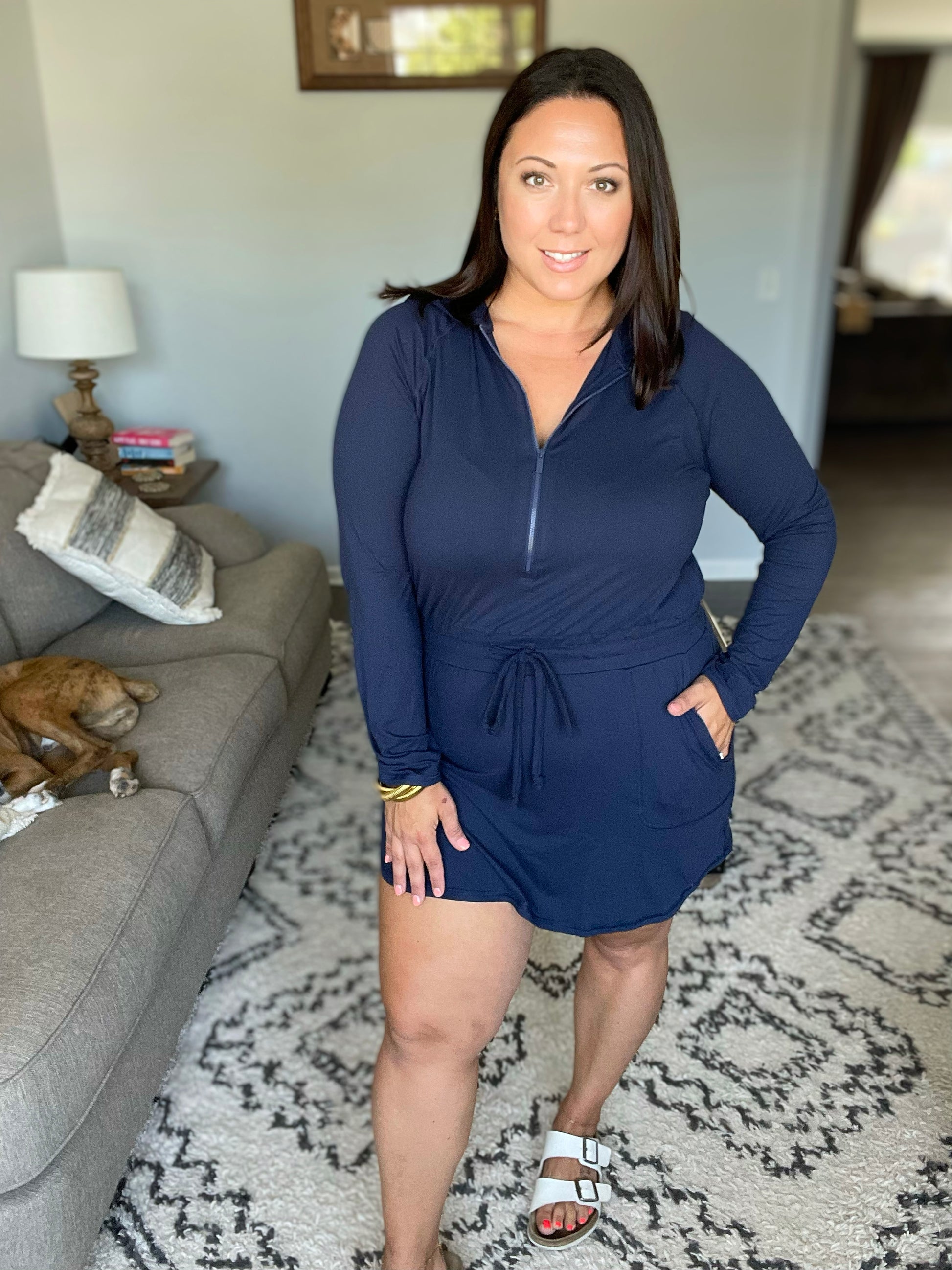 Getting Out Long Sleeve Hoodie Romper in Navy