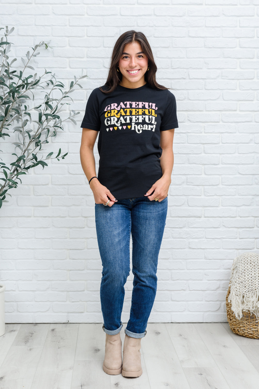 We're grateful that cute tees like the Grateful Heart Graphic T-Shirt In Black exists! This adorable tee features a crew neckline, short sleeves, and classic Tee silhouette. You can tie this tee up, tuck it in, or wear it how it is. Either way we love the message on this tee AND you're going to love the look of this new fav.
