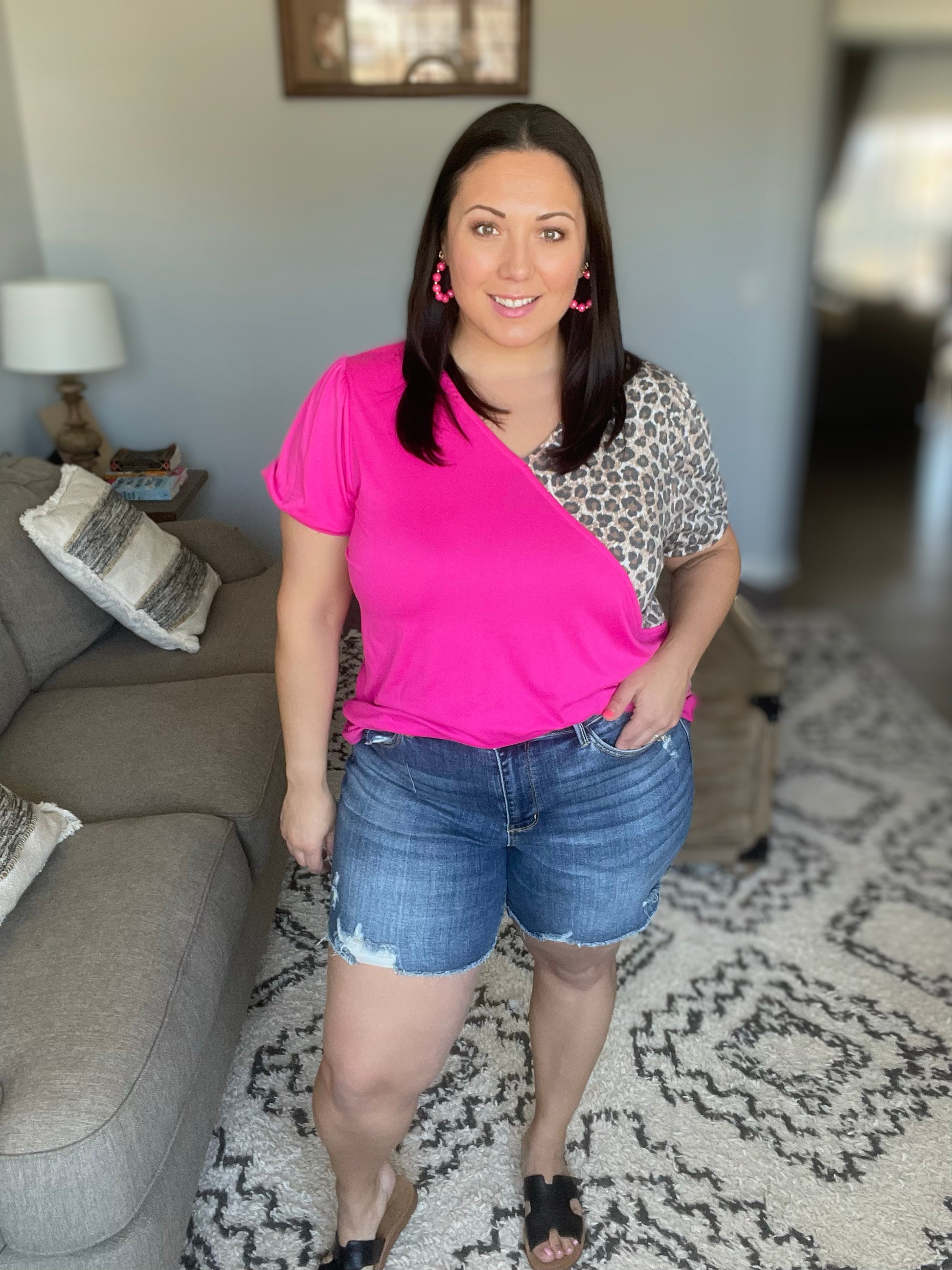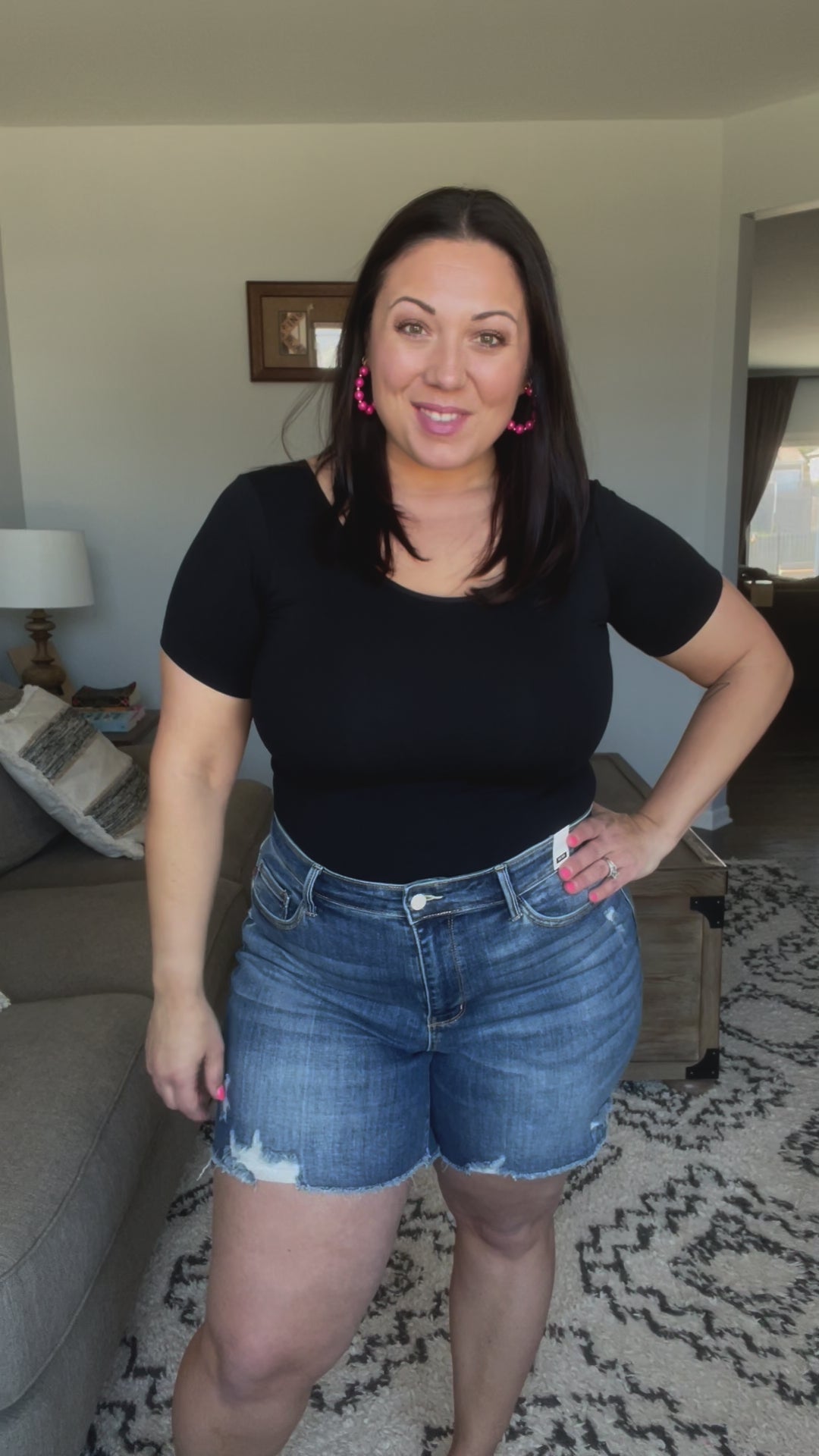 Hallie is a mid-rise, hi-low cut, distressed denim short. The hi-low cut is perfect for showing staying cool but still being long enough in the back to cover the booty and thighs. She also has an on-trend frayed hem and classic gold stitching across the waist and pockets.